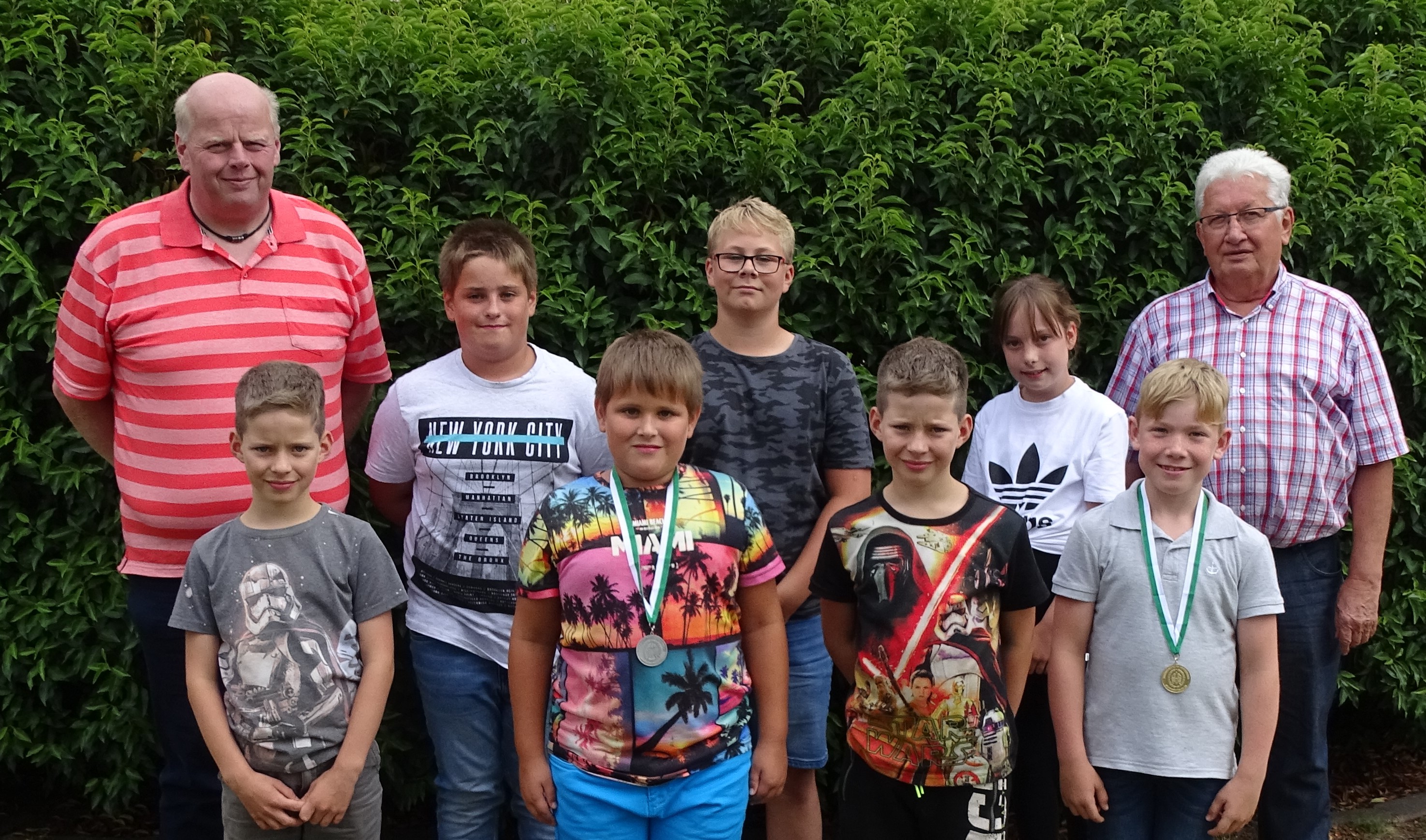 Trainer Horst Meins, Fynn Beckers, Paul Freyer, Bastian Freyer, Jan Schmidt, Tino Beckers, Hanna Bollhorst, Leon Korte, Trainer Friedel Kelkenberg (von links)