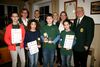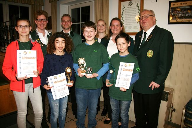 Glückliche Nachwuchsschützen mit ihren Betreuern und den Bezirksvertretern. Vordere Reihe von links: Laura Grewe, Jolina-Marie Tinnemeyer, Fite Pohl u. Julian Pufel. hintere Reihe: Claudia Reuter, Sascha Langhorst, Julia Langhorst, Britta Löhmann u. Karl-Friedrich Scharrelmann.