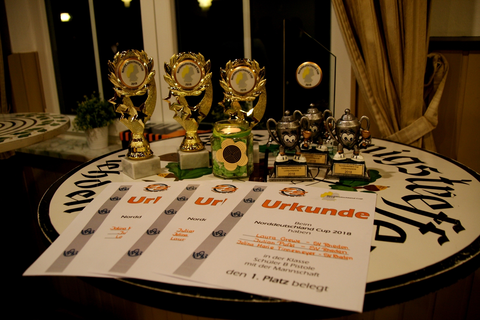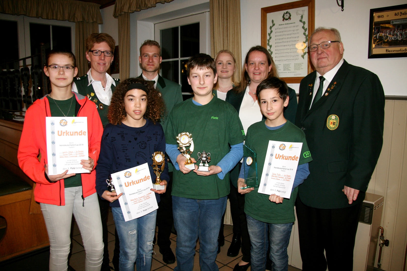Die Lichtpunktschützen Jolina-Marie Tinnemeyer, Julian Pufel, Laura Grewe, Alina Hartlieb und Fiete Pohl wurden für ihre tollen Leistungen beim NORDDEUTSCHLAND CUP 2018 in Dortmund, während der Jahreshauptversammlung des Schützenvereins (SV) Rehden seitens des Bezirks mit einem Erinnerungspokal geehrt.