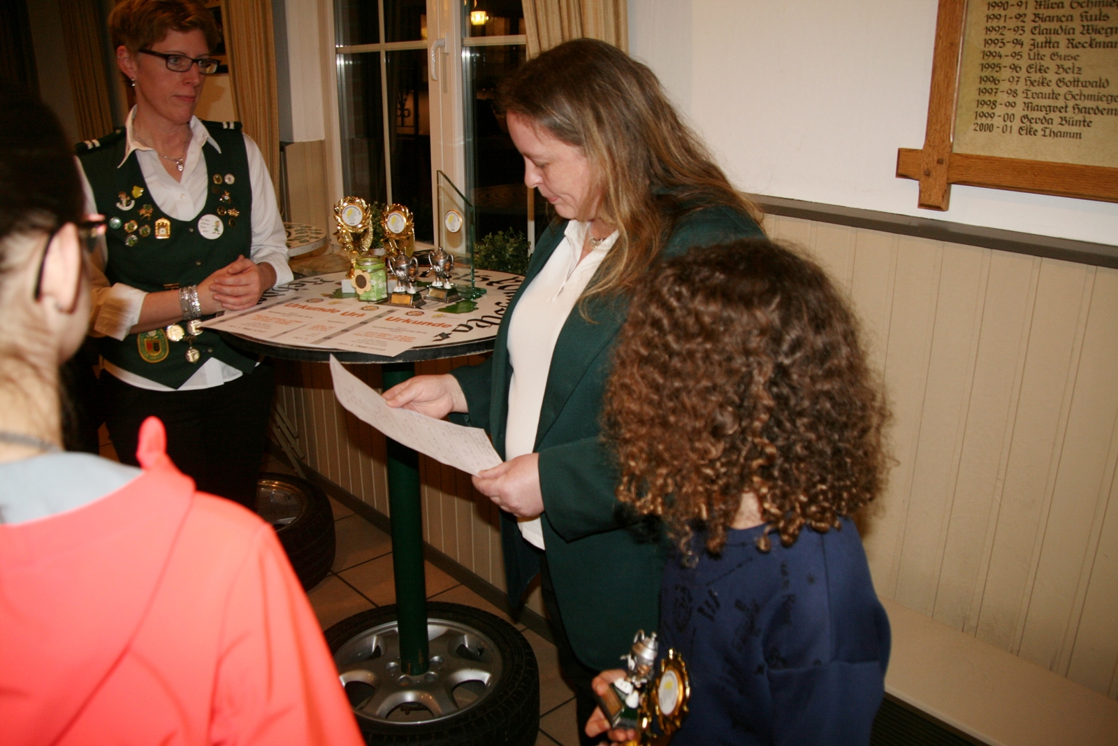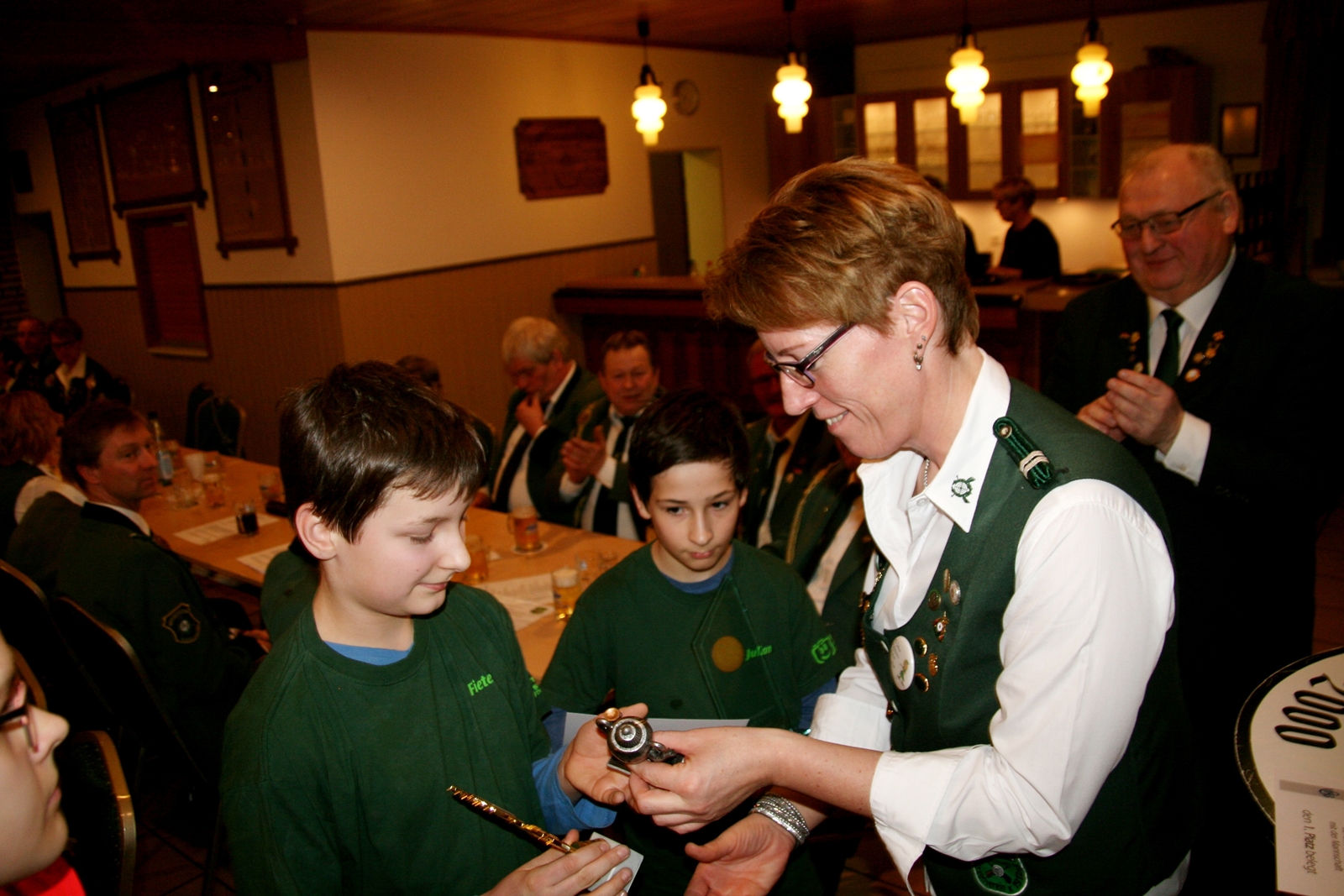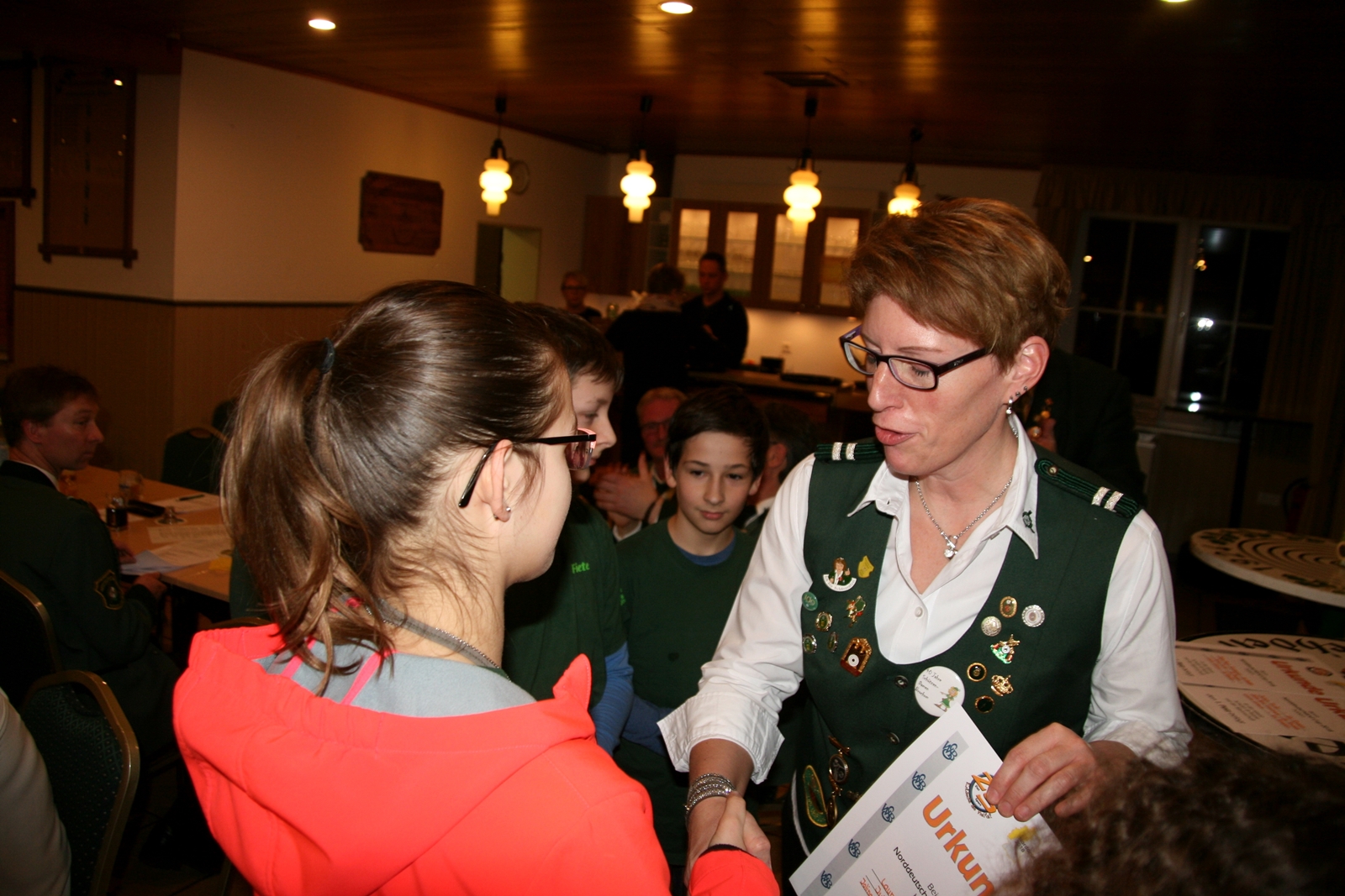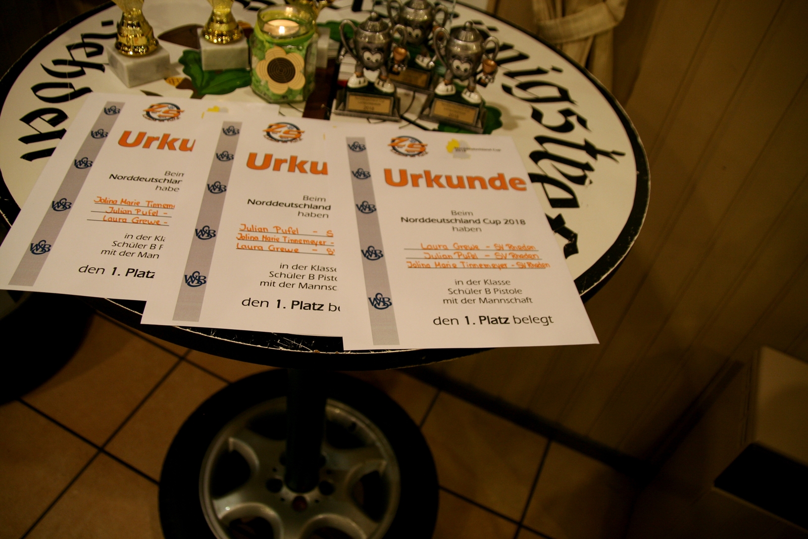 Claudia Reuter überreichte die jeweiligen Urkunden und Pokale vom Wettkampf in Dortmund und vom Bezirk erhielt jeder einen Erinnerungspokal. Für die Disziplin Lichtpunktpistole Freihand Schüler B in der NWDSB-Mannschaft Platz 1, erhielt jeder eine Urkunde: Jolina-Marie Tinnemeyer, Laura Grewe und Julian Pufel. In der Einzelwertung erhielten für Platz 1 Jolina-Marie Tinnemeyer, Platz 2 Fiete Pohl und Platz 3 Alina Hartlieb, je einen Pokal (da Alina Hartlieb verhindert war, nahm Jugendwart Sascha Langhorst für sie Urkunde und Pokale entgegen). Langanhaltender Applaus der anwesenden Vereinsmitglieder begleitete die Übergabe.