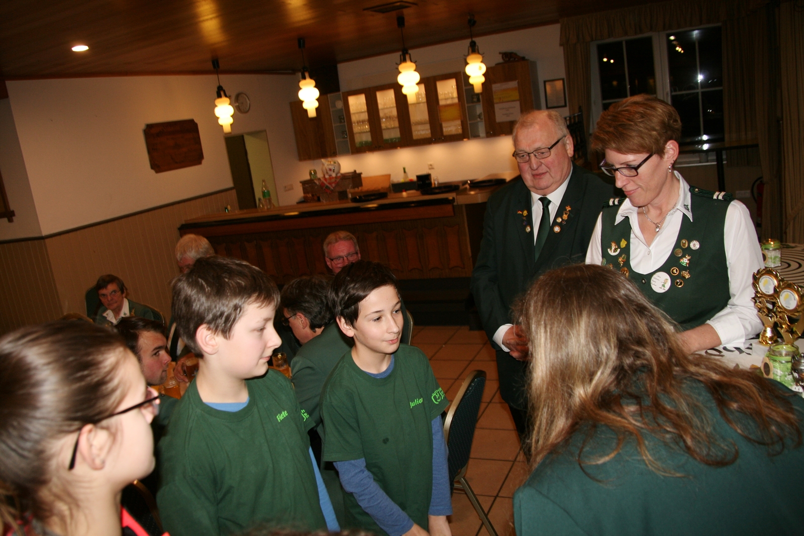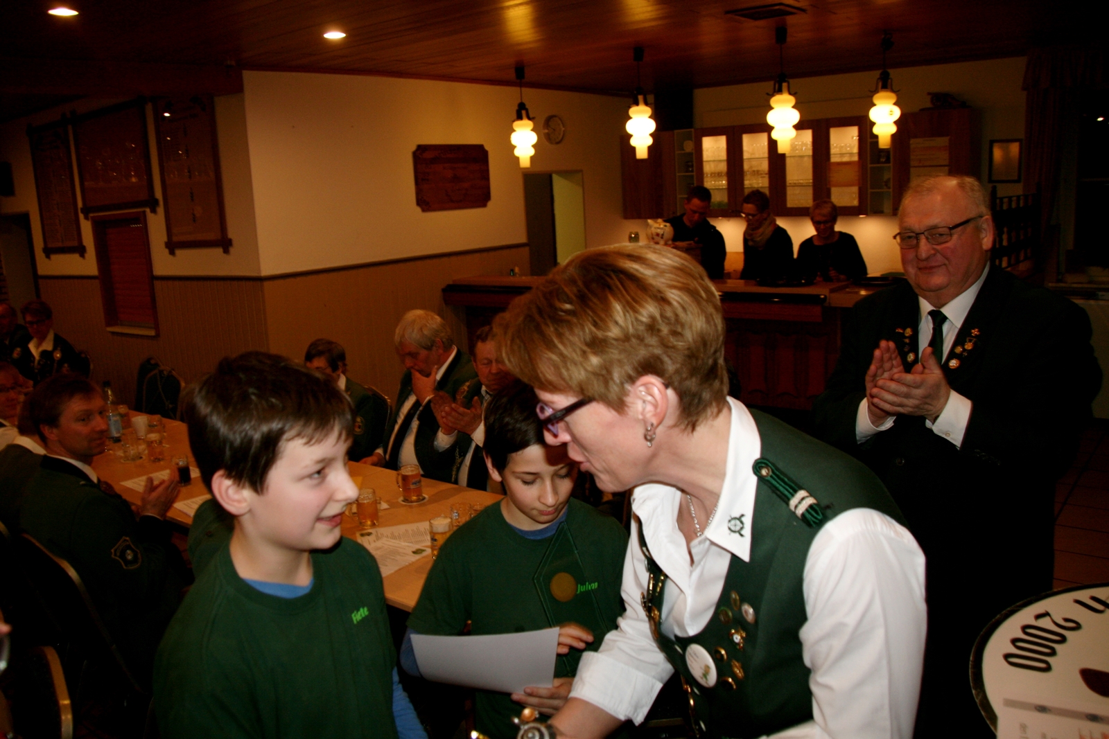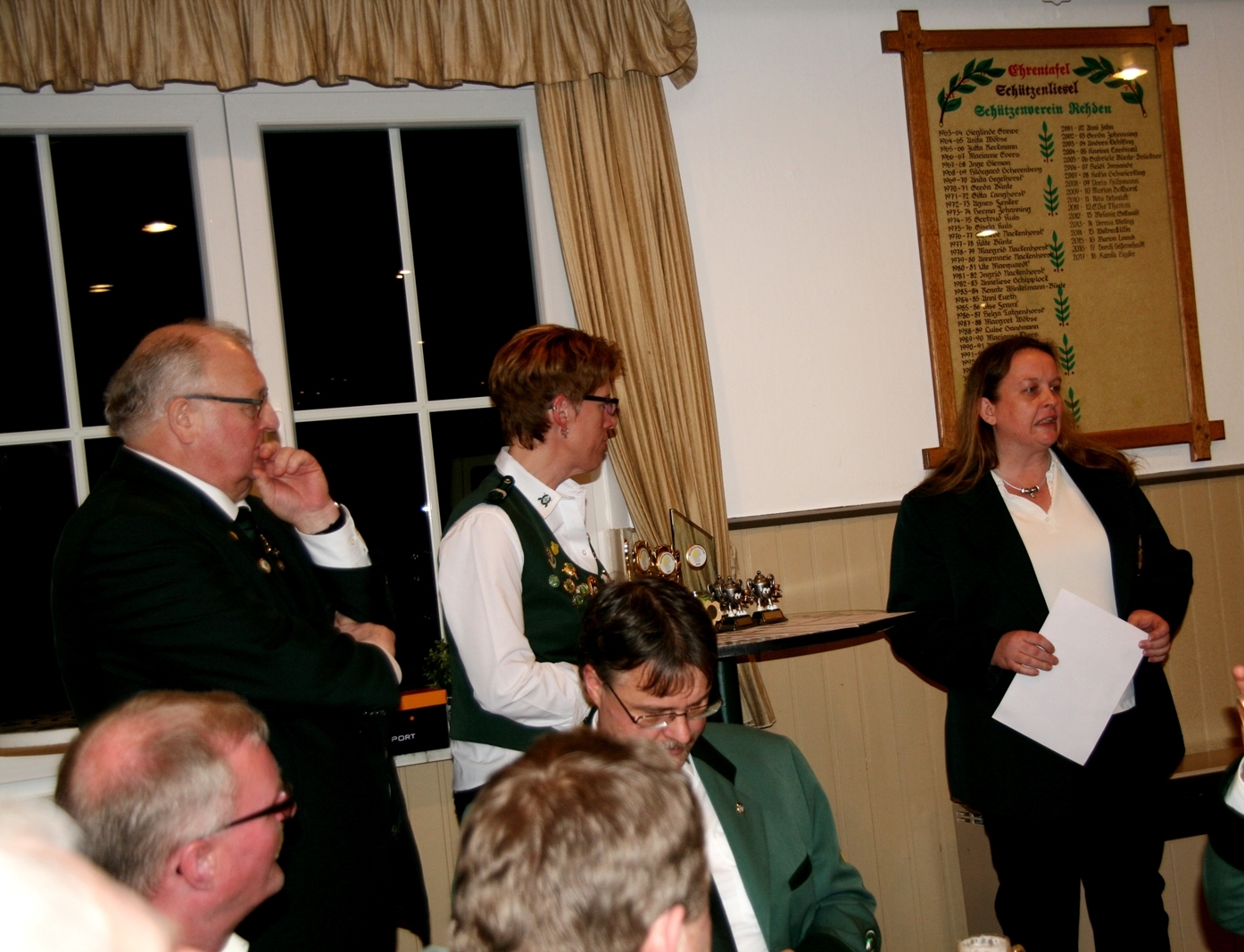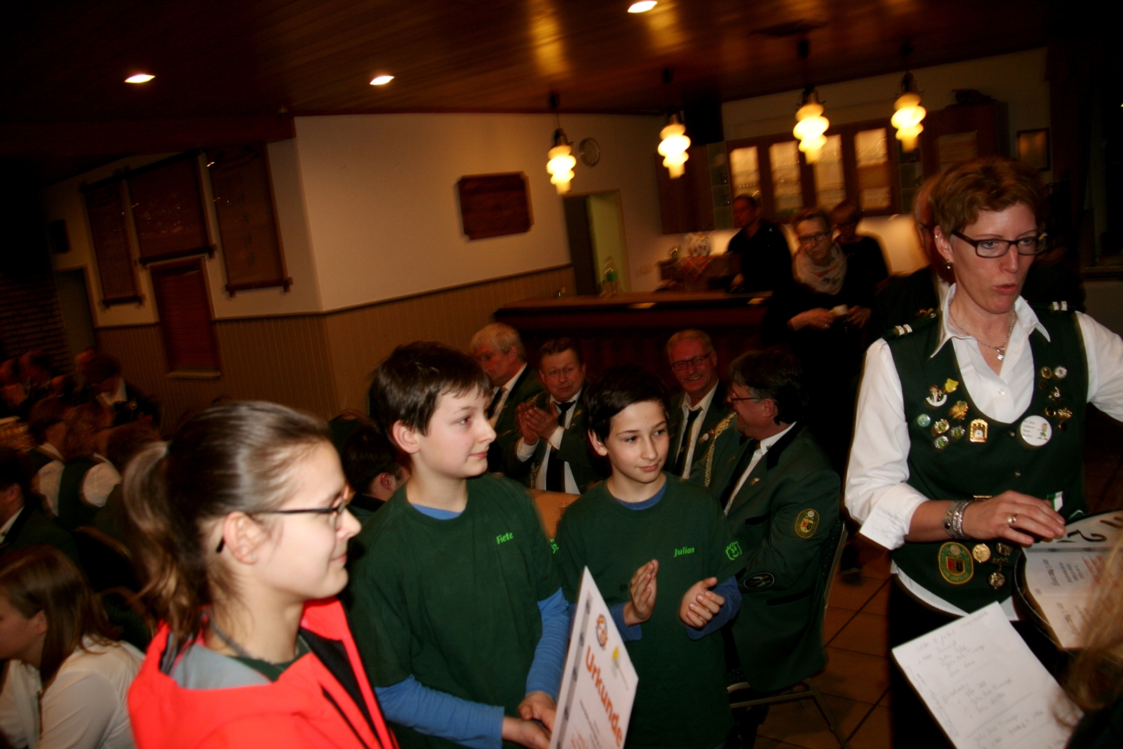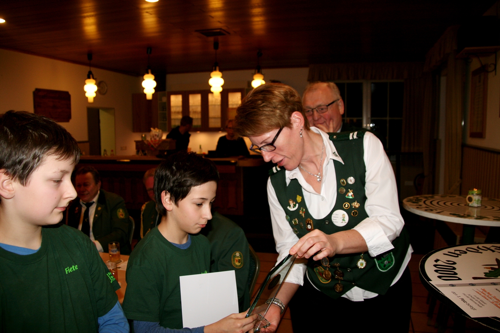 Claudia Reuter überreichte die jeweiligen Urkunden und Pokale vom Wettkampf in Dortmund und vom Bezirk erhielt jeder einen Erinnerungspokal. Für die Disziplin Lichtpunktpistole Freihand Schüler B in der NWDSB-Mannschaft Platz 1, erhielt jeder eine Urkunde: Jolina-Marie Tinnemeyer, Laura Grewe und Julian Pufel. In der Einzelwertung erhielten für Platz 1 Jolina-Marie Tinnemeyer, Platz 2 Fiete Pohl und Platz 3 Alina Hartlieb, je einen Pokal (da Alina Hartlieb verhindert war, nahm Jugendwart Sascha Langhorst für sie Urkunde und Pokale entgegen). Langanhaltender Applaus der anwesenden Vereinsmitglieder begleitete die Übergabe.