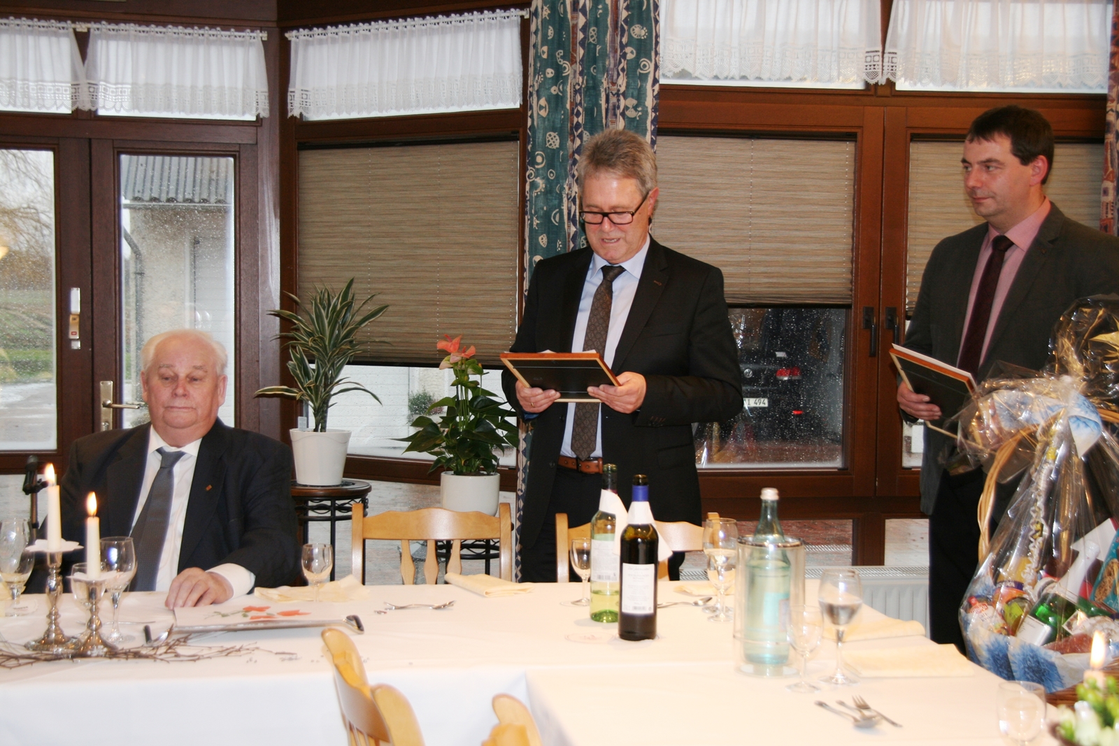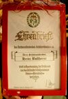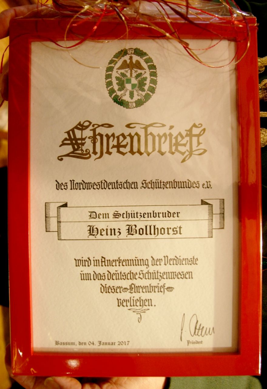 Friedel Kelkenberg verlas die Beschriftung der Urkunde: Ehrenbrief des Nordwestdeutschen Schützenbundes e.V.: "Dem Schützenbruder Heinz Bollhorst wird in Anerkennung der Verdienste um das Deutsche Schützenwesen dieser Ehrenbrief verliehen" - Bassum, den 04. Januar 2017 - Präsident Jonny Otten