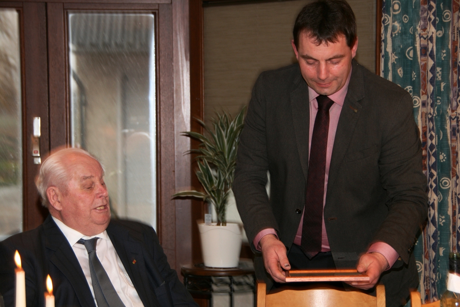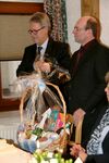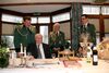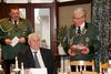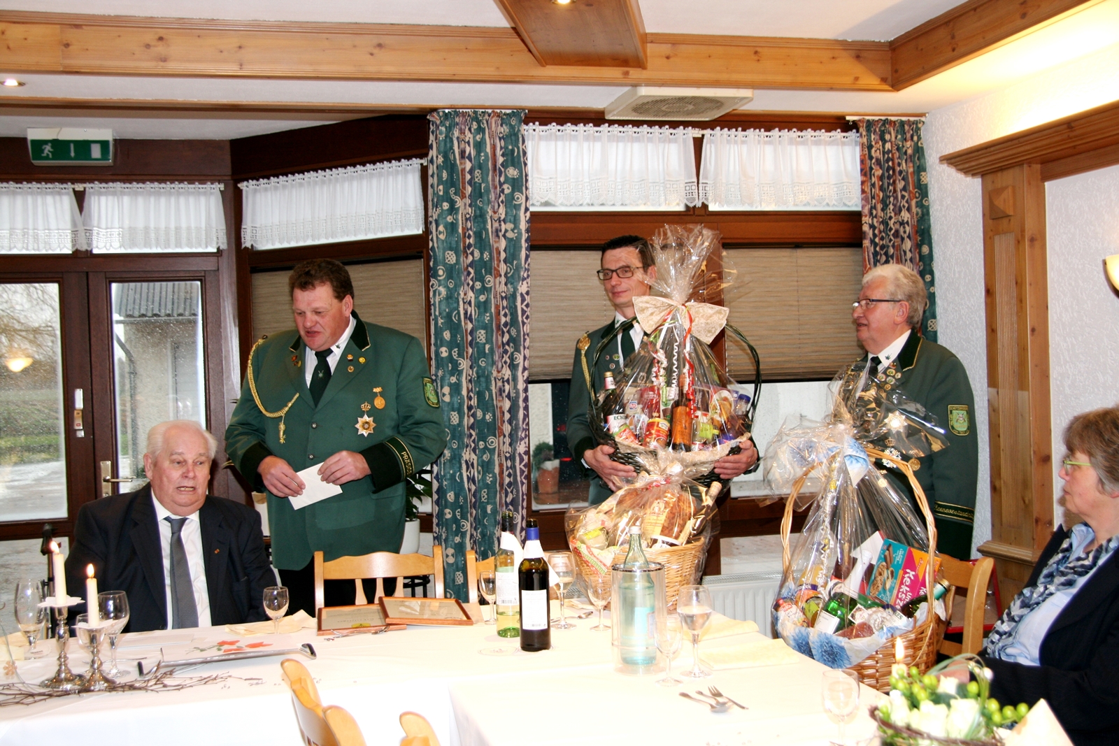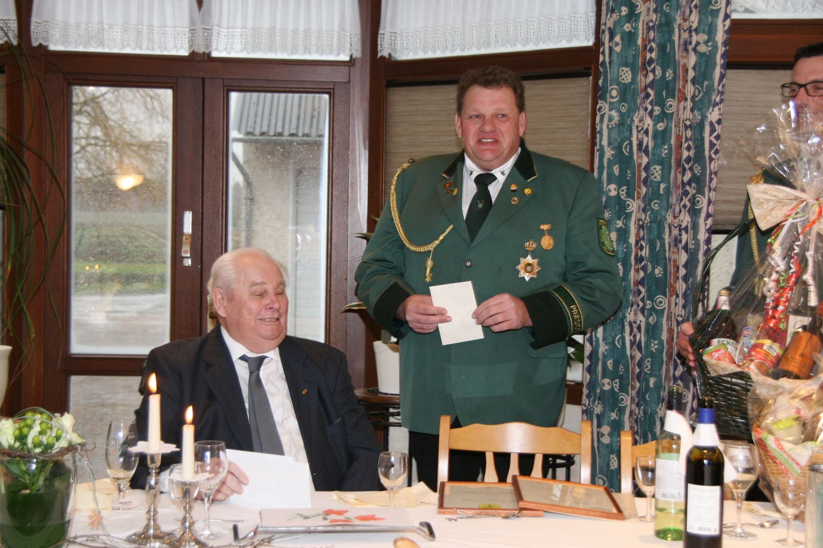 Auch Wetschens Präsident Thorsten Dünnemann war nicht mit leeren Händen gekommen, ein "Flachgeschenk" und ein Präsentkorb, getragen von „Kaiser“ Marco Förster, nahm Heinz Bollhorst freudig entgegen. Dünnemann würdigte den Jubilar als einen sehr verlässlichen, treuen Schützenbruder, bemängelte aber augenzwinkernd, dass es Heinz noch nicht geschafft habe König zu sein.