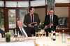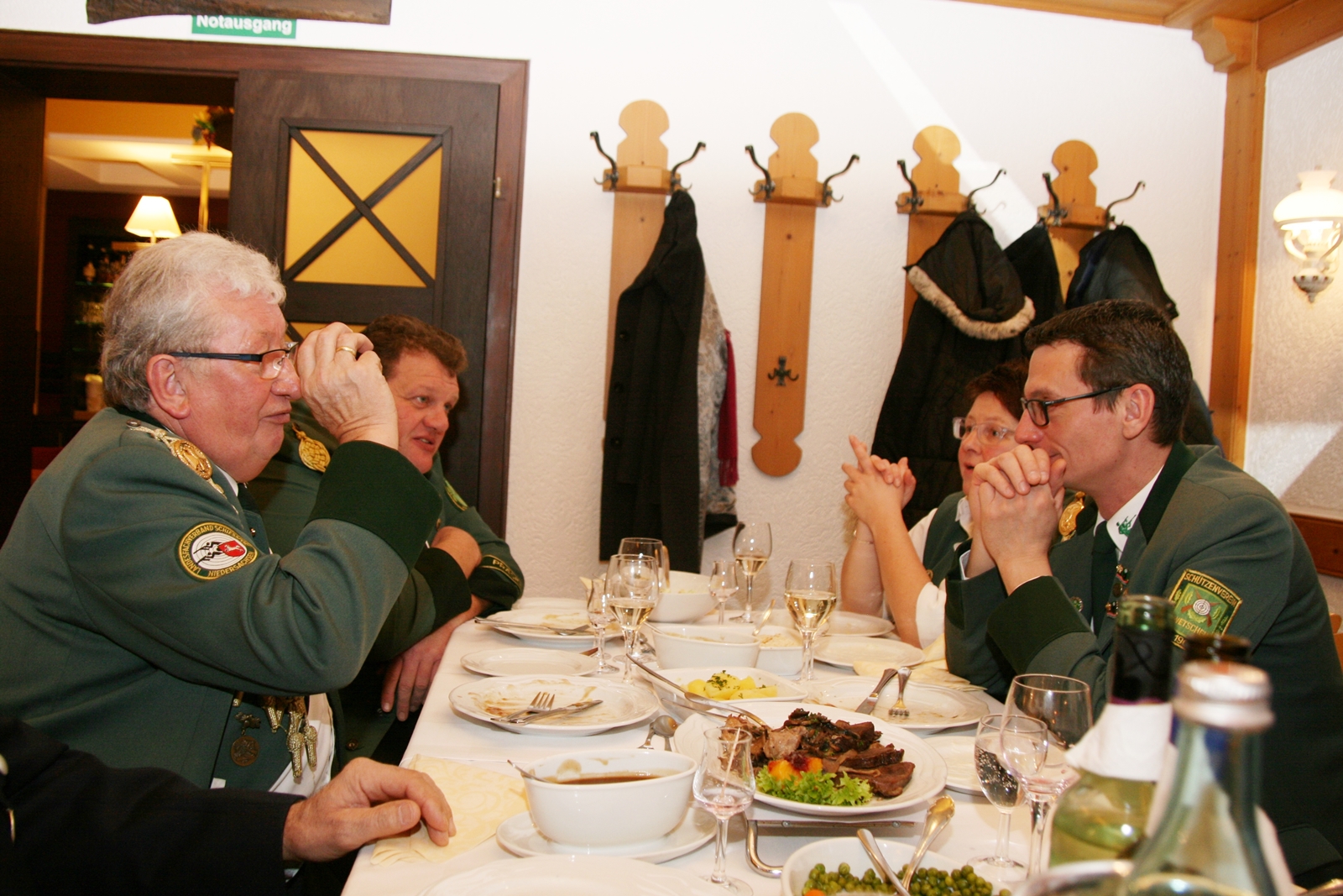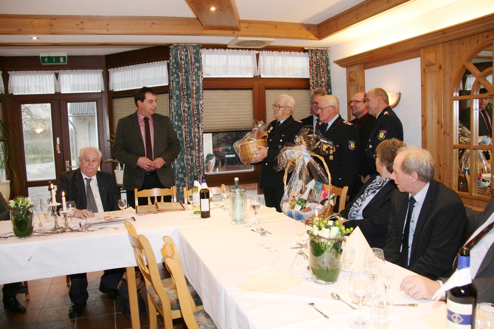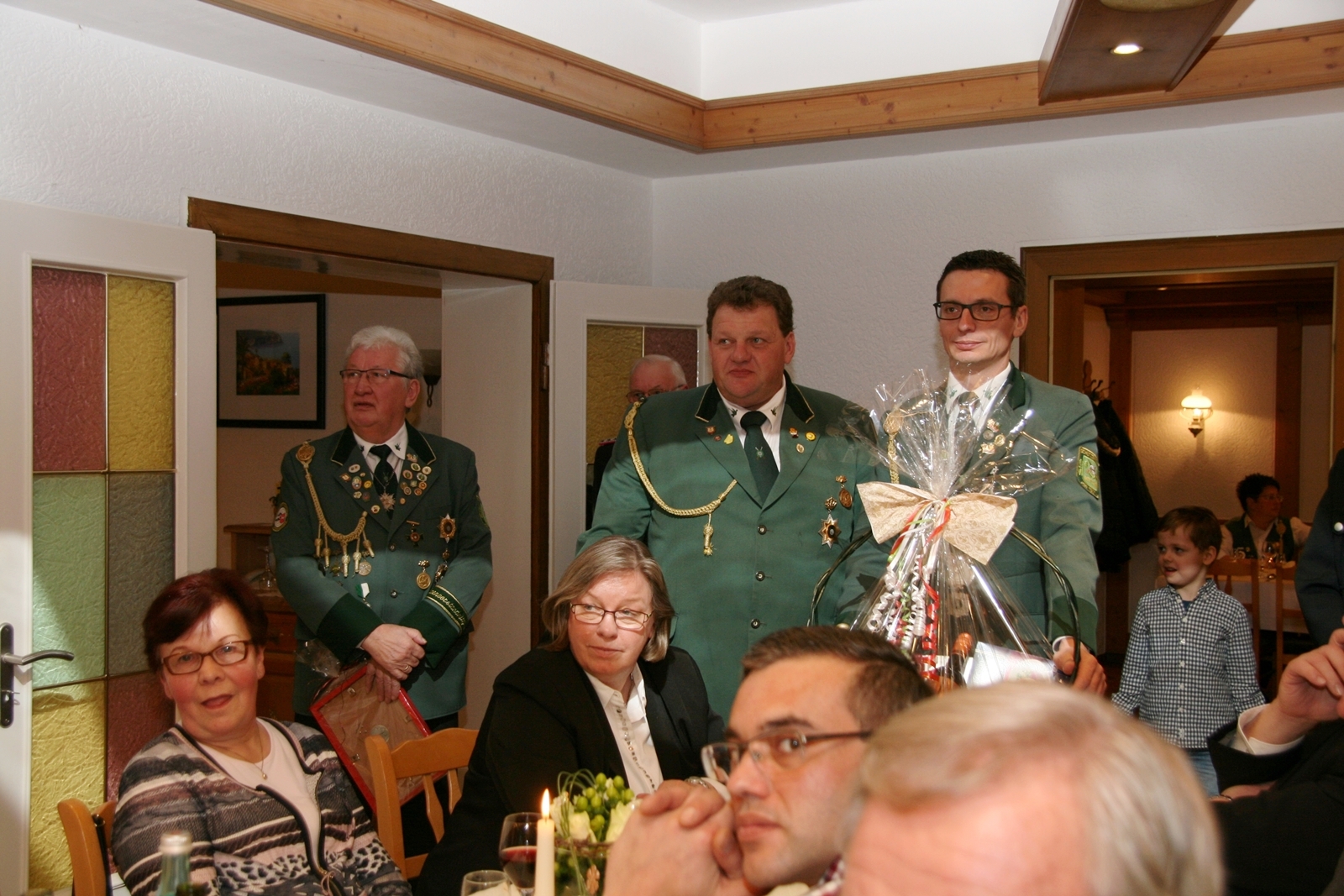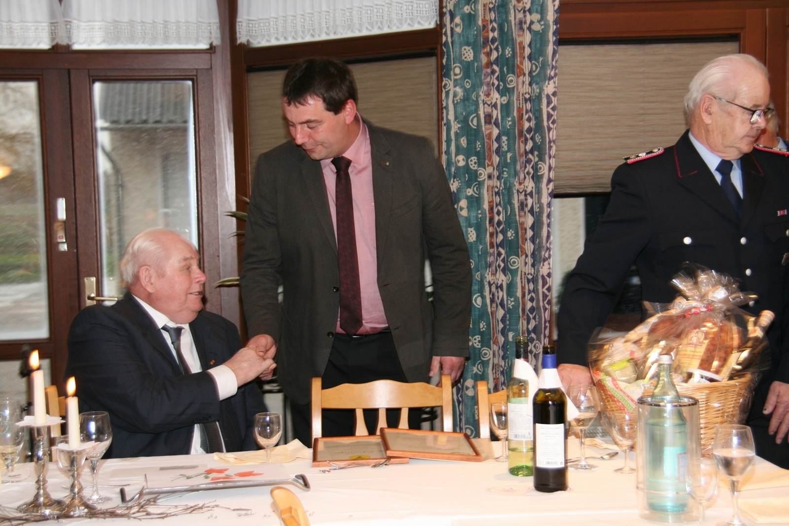 Auch Wetschens Präsident Thorsten Dünnemann war nicht mit leeren Händen gekommen, ein "Flachgeschenk" und ein Präsentkorb, getragen von „Kaiser“ Marco Förster, nahm Heinz Bollhorst freudig entgegen. Dünnemann würdigte den Jubilar als einen sehr verlässlichen, treuen Schützenbruder, bemängelte aber augenzwinkernd, dass es Heinz noch nicht geschafft habe König zu sein.