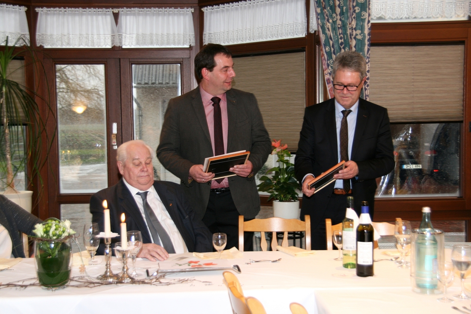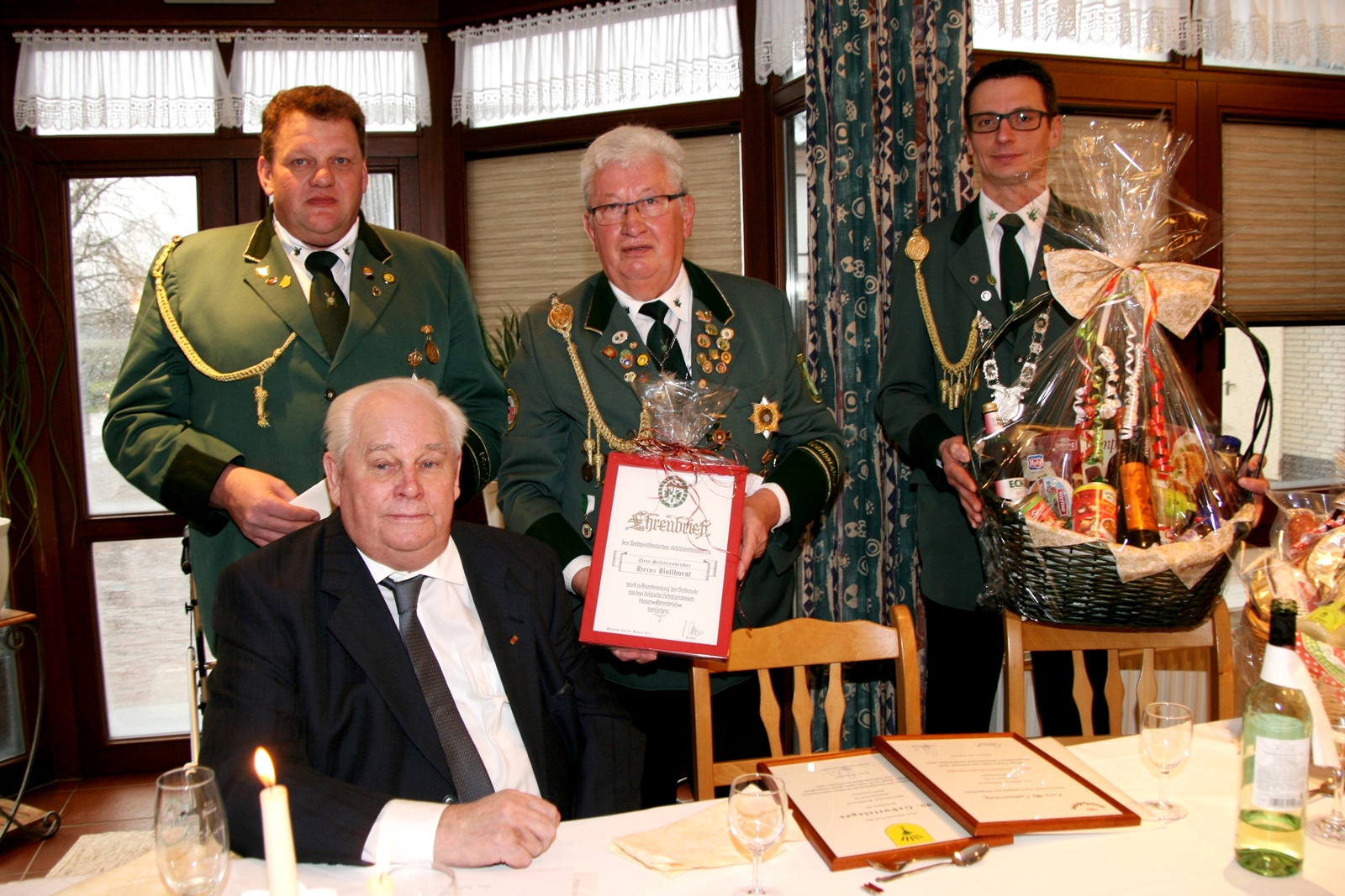 In seiner sehr ausführlichen Laudatio, ließ Friedel Kelkenberg den "Weg" von Heinz Bollhorst im Schützenwesen noch einmal Revue passieren. Ehrungen erhielt er für viele Jahre Engagement für das Deutsche Schützenwesen. Heinz Bollhorst war von 1958 bis 1979 Präsident des Schützenvereins Wetschen, 1979 übernahm er den Posten des Vizepräsidenten. 1988 wurde er dann zum Ehrenpräsidenten des Vereins ernannt. Er war maßgeblich auch am Bau des Schützenhauses am jetzigen Standort beteiligt. 1973 erhielt er die Goldene Ehrennadel des Bezirks und 2015 bekam er, ebenfalls von Friedel Kelkenberg, die Goldene Verdienstnadel des Bezirks überreicht. Bemerkenswert ist, dass er nun schon 62 Jahre Vereinsmitglied ist. Die Übergabe des Ehrenbriefes wurde mit viel Beifall bedacht. Sichtlich gerührt nahm er den Brief und die Gratulationen entgegen.