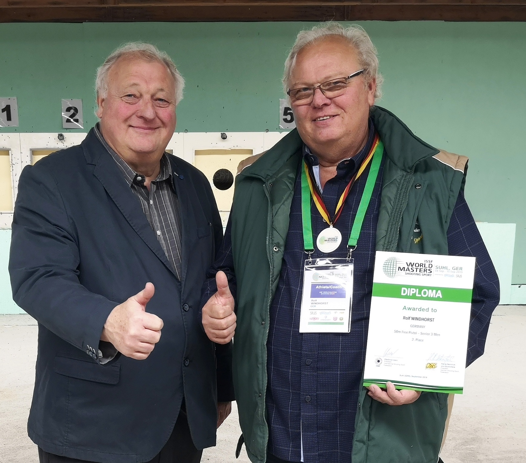 Ein stolzer Rolf Windhorst mit seinem Trainer Karl Friedrich Scharrelmann. Laut seiner Aussage, hat Scharrelmann einen gravierenden Einfluss auf seine schießsportliche Entwicklung. Mit 284.0 Ringen wurde er Zweiter in seiner Altersklasse in der Disziplin Freie Pistole Auflage! GLÜCKWUNSCH"!