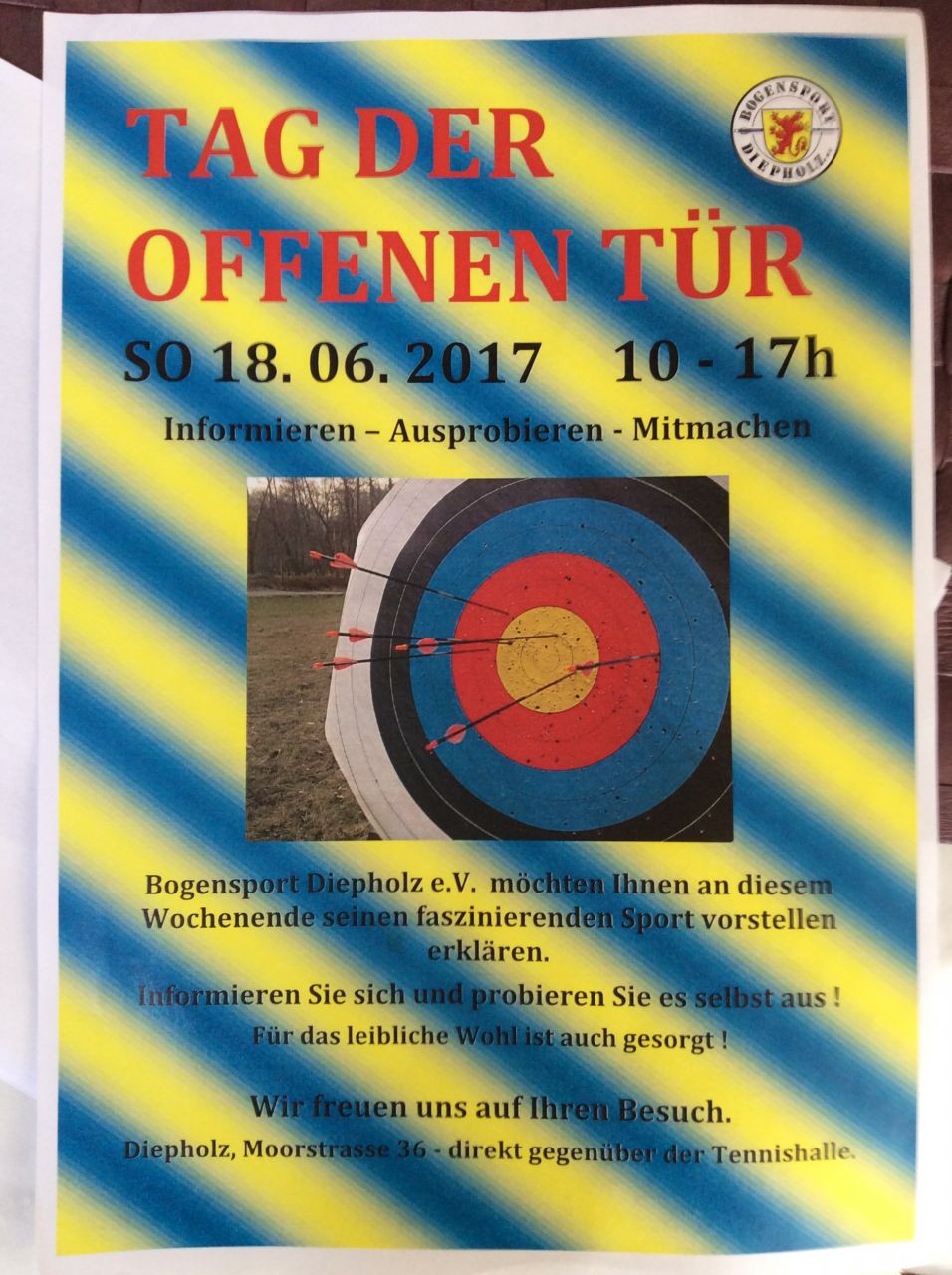 Der Bogensport Diepholz führt am 18. Juni von 10:00 bis 17:00 Uhr einen "Tag der offenen Tür" durch, unter dem Motto "INFORMIEREN - AUSPROBIEREN - MITMACHEN" durch.