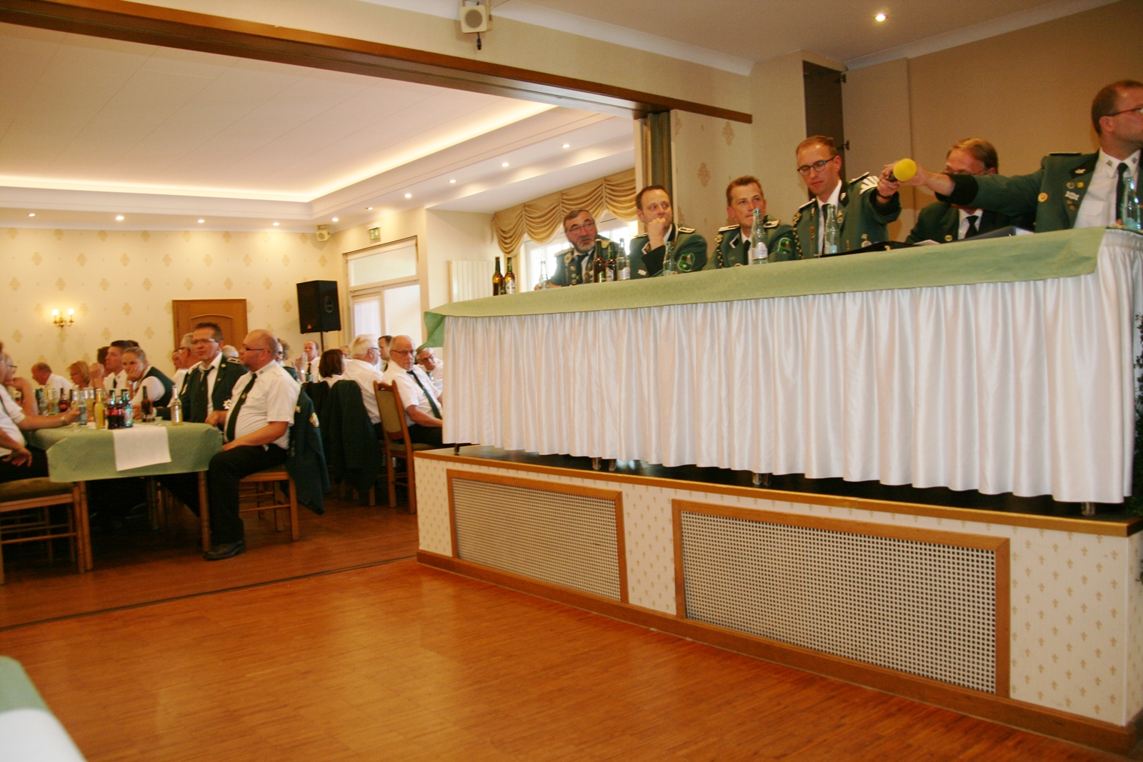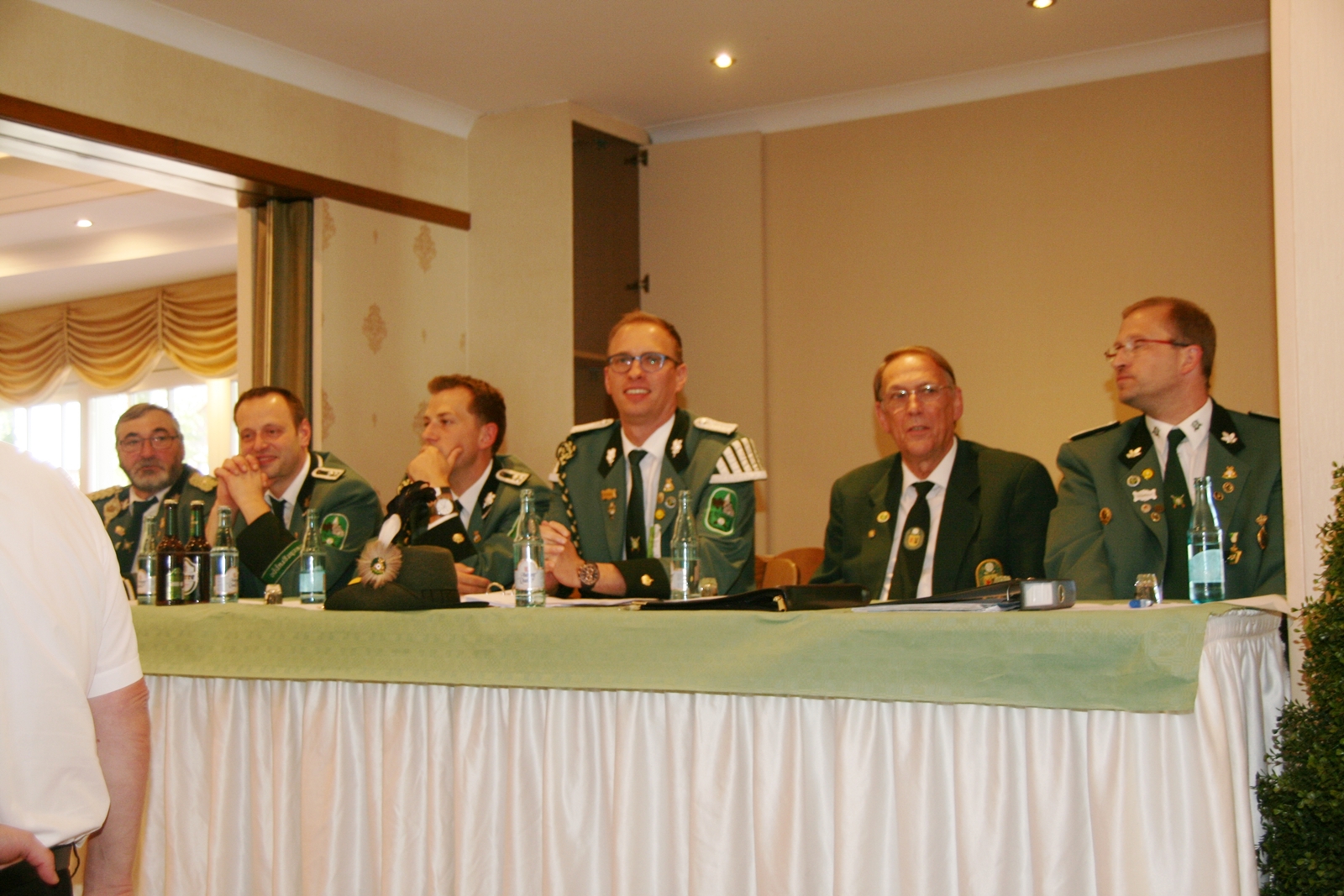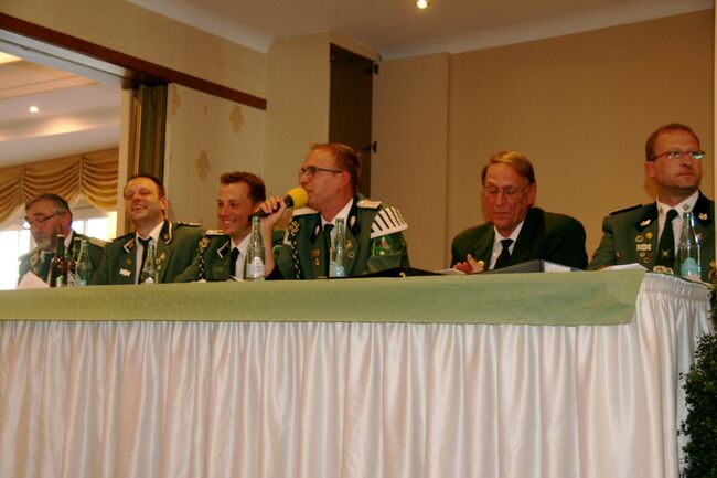 Der Vorstandstisch mit: Stellv. Vorsitzenden Siegfried Kramer, Stellv. Vorsitzender Benjamin Priesmeier, Schriftwart Björn Frerking, Präsident Sebastian Lampe, Stellv. Geschäftsführer des Bezirks-Schützenverbandes Diepholz Dietrich Lampe, Vereinssportleiter Michael Meyer (von links)