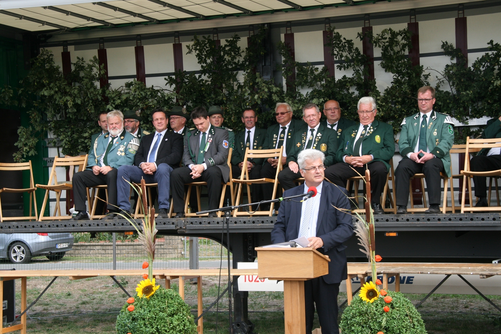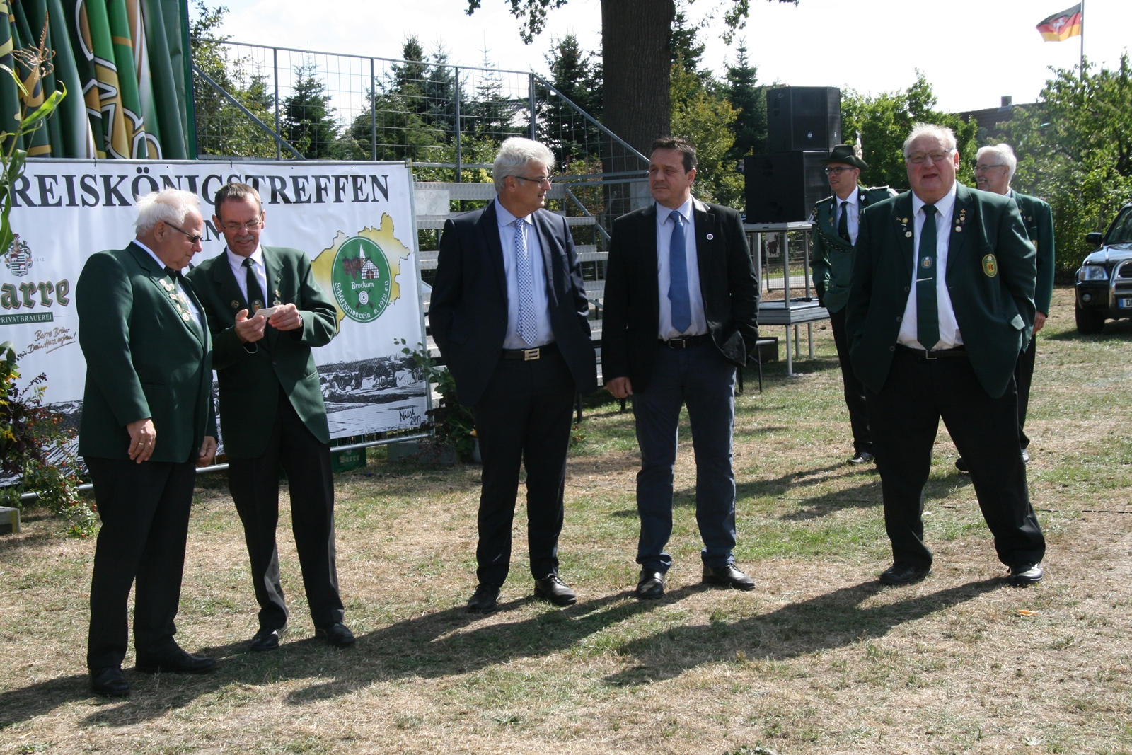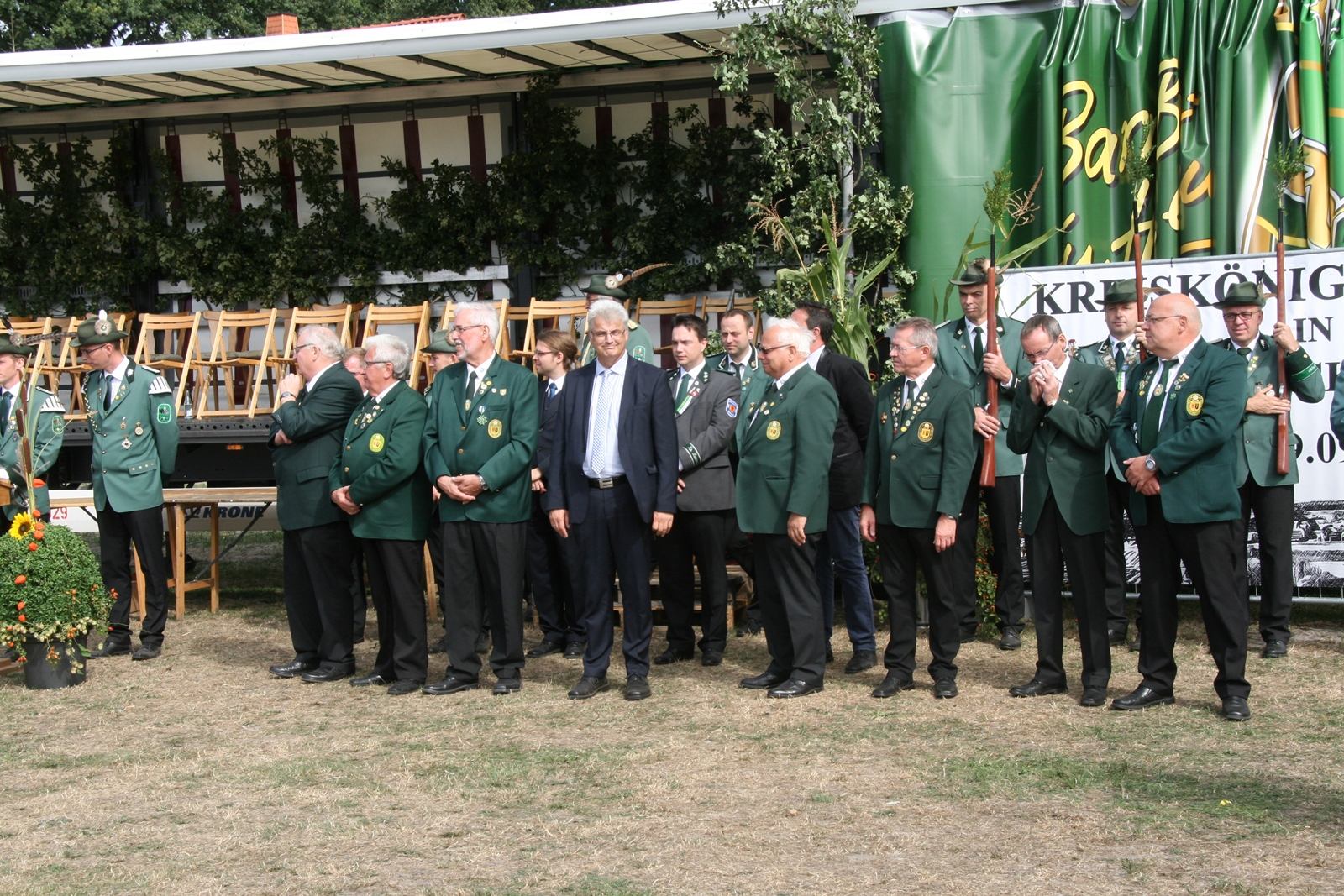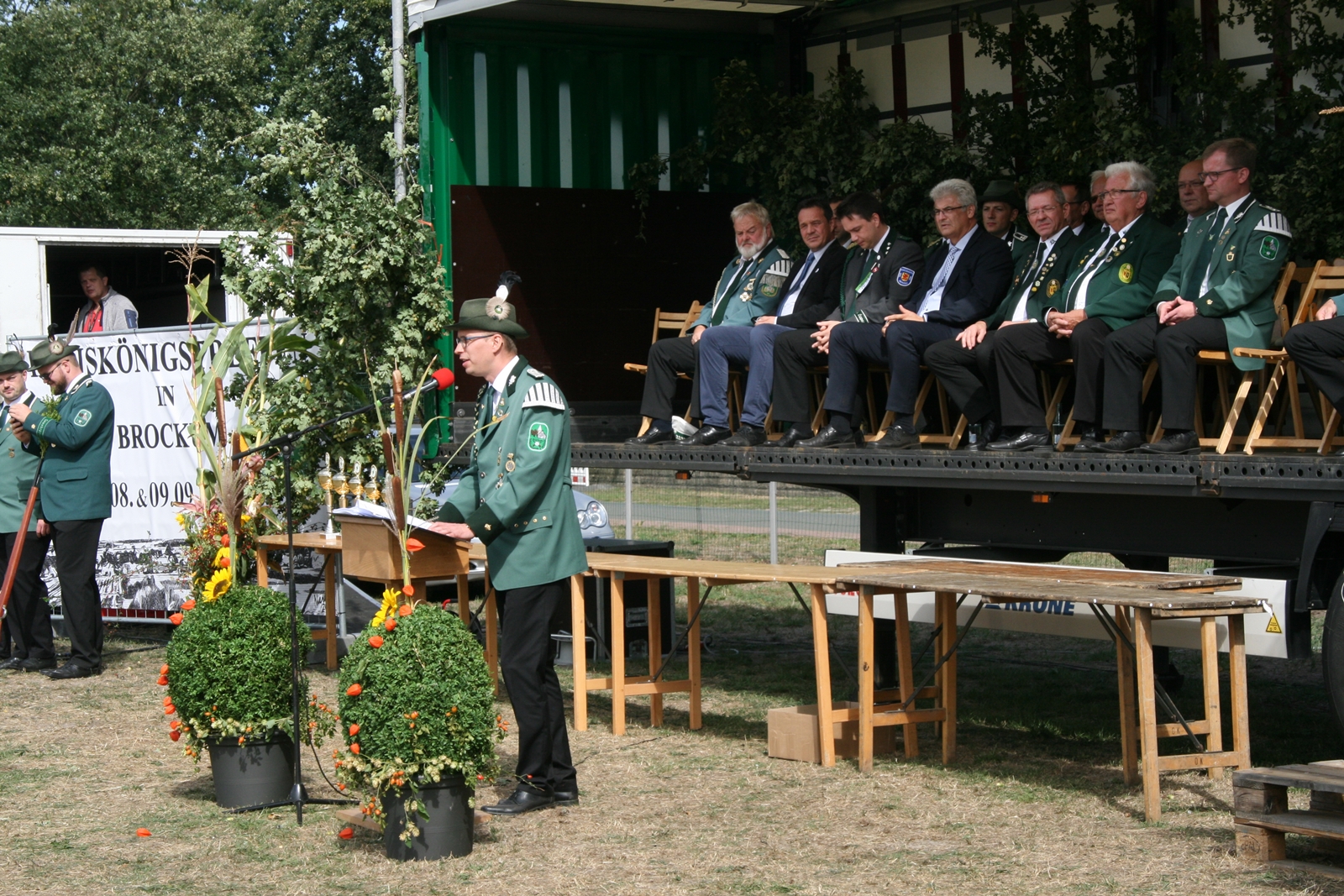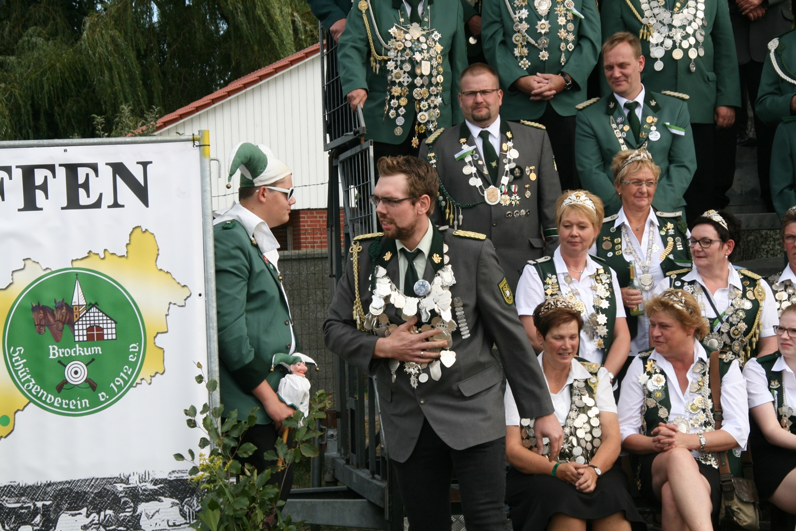 Den Reigen der Grußworte eröffnete Bürgermeister Marco Lampe er überbrachte die Grüße aus Rat u. Verwaltung u. wünschte allen Gästen fröhliche Stunden. BZ-Präsident Karl-Friedrich Scharrelmann erinnerte in seinem Grußwort auch an die 100 Jahrfeier vom SV Brockum, dass der Schützenverein Tradition - Freundschaft u. der Zusammenhalt auch heute wie damals, einen hohen Stellenwert hier im Verein habe. KV I-Präsident Manfred Rüffer feute sich auf die kommende Feier im Festzelt, mit Blick auf die mit Vereinskönigen gefüllte Tribüne, meinte er: "Ihr Könige habt dafür gesorgt, dass es diese Kreiskönigstreffen gibt, dass diese Tradition des Königsschießen weiterlebt, Danke!" Stellvtr. Landrat Heiner Richmann lobte diese gut organisierte Veranstaltung: "man kann mit Fug u. Recht sagen, das grüne Schützenherz des Landkreises Diepholz schlägt heute hier in Brockum u. das kräftig!" Axel Knöerig, MdB u. Stellvtr. Vorsitzender des KSB Diepholz sowie auch Schützenbruder, überbrachte die besten Wünsche von den 74000 KSB-DH-Mitgliedern. Es ist schon erwähnenswert, das hier 63 Schützenvereine mit ihren Majestäten gekommen sind, dazu noch 8 Spielmannszüge, welche sie dann musikalisch zum Festzelt geleiten werden. Sein Lob ging an den Vorstand, seine Mitglieder u. die weiteren Helfer. Er hob hervor, das bei den letzten Ehrungen des KSB Diepholz 34 von 66 Sportschützen u. 18 von 31 Mannschaften geehrt worden sind. Das besagt, das ca. 50 % der Geehrten aus dem Schützenwesen kommen. Mit 4350 Mitgliedern sind die Schützen die viertgrößte Gruppe im KSB Diepholz. Er wünschte allzeit Gut Schuß u. eine gute Zusammenarbeit. MdL u. Schützenmitglied beim SK Diepholz Marcel Scharrelmann brachte es auf den Punkt: "ohne die Schützenvereine ist das Leben in unseren Dörfern um vieles ärmer, unser Schützenwesen gibt uns Geborgenheit, Geselligkeit u. Zusammenhalt!" Uns allen wünsche ich ein tolles Kreiskönigstreffen mit viel Spaß!
