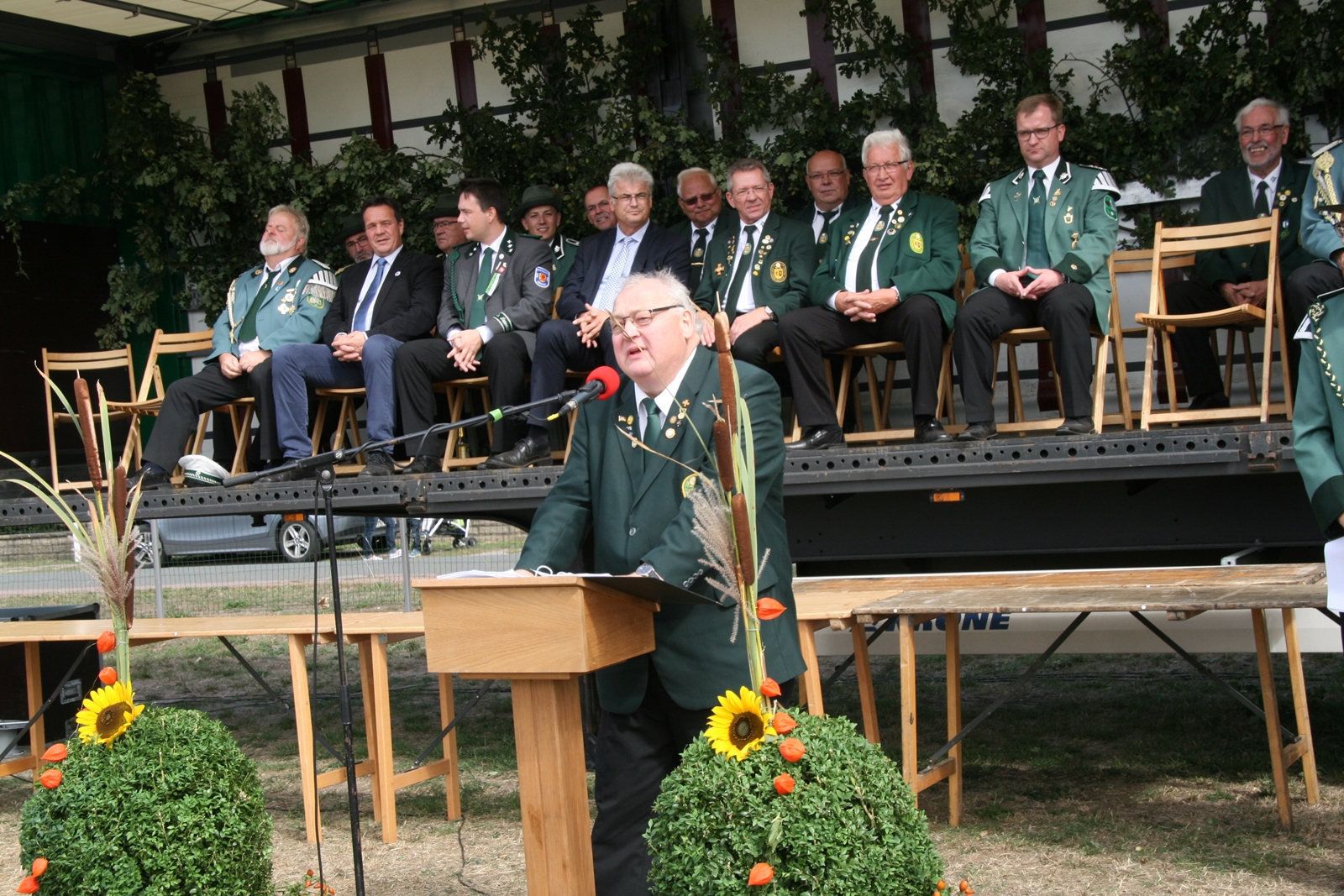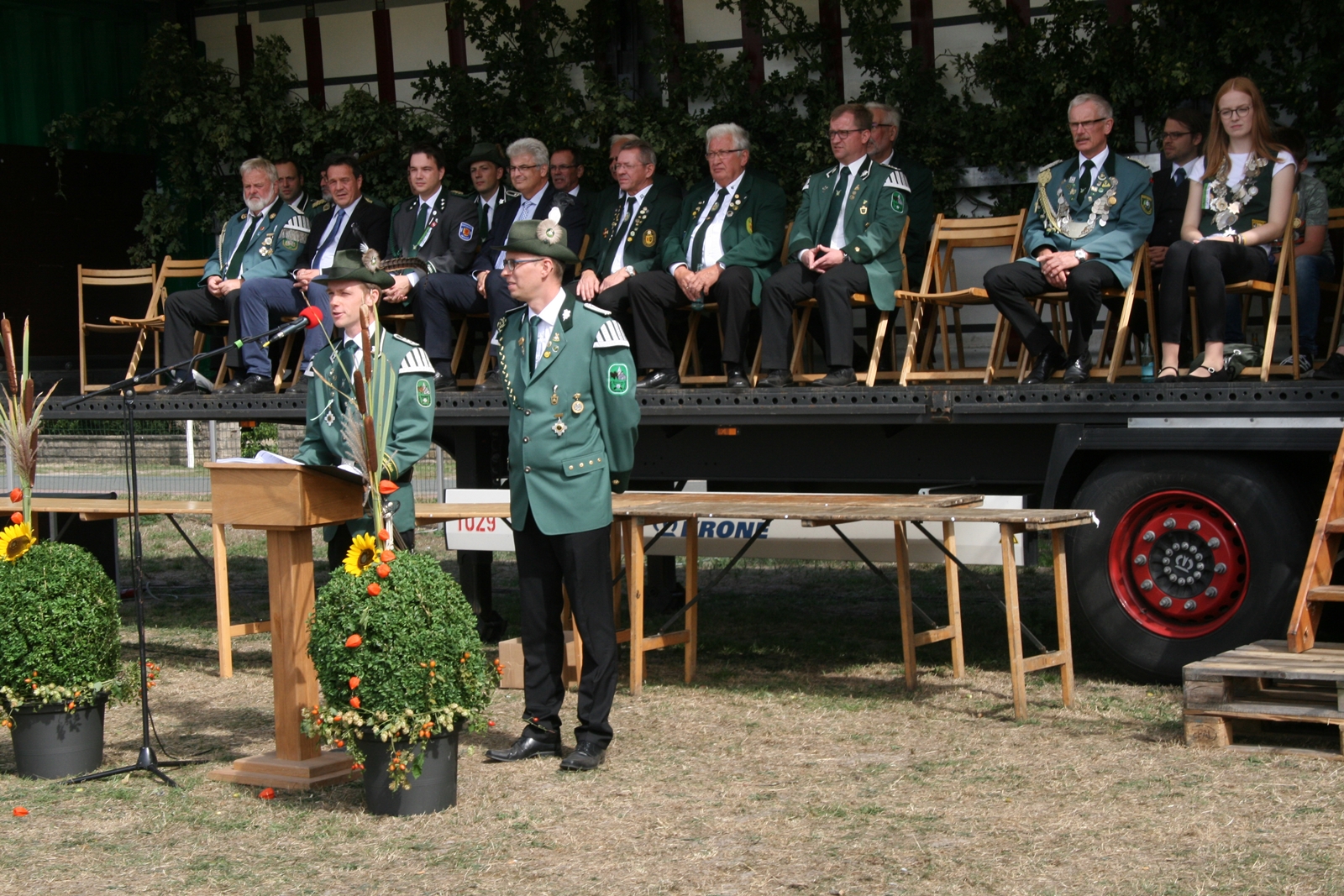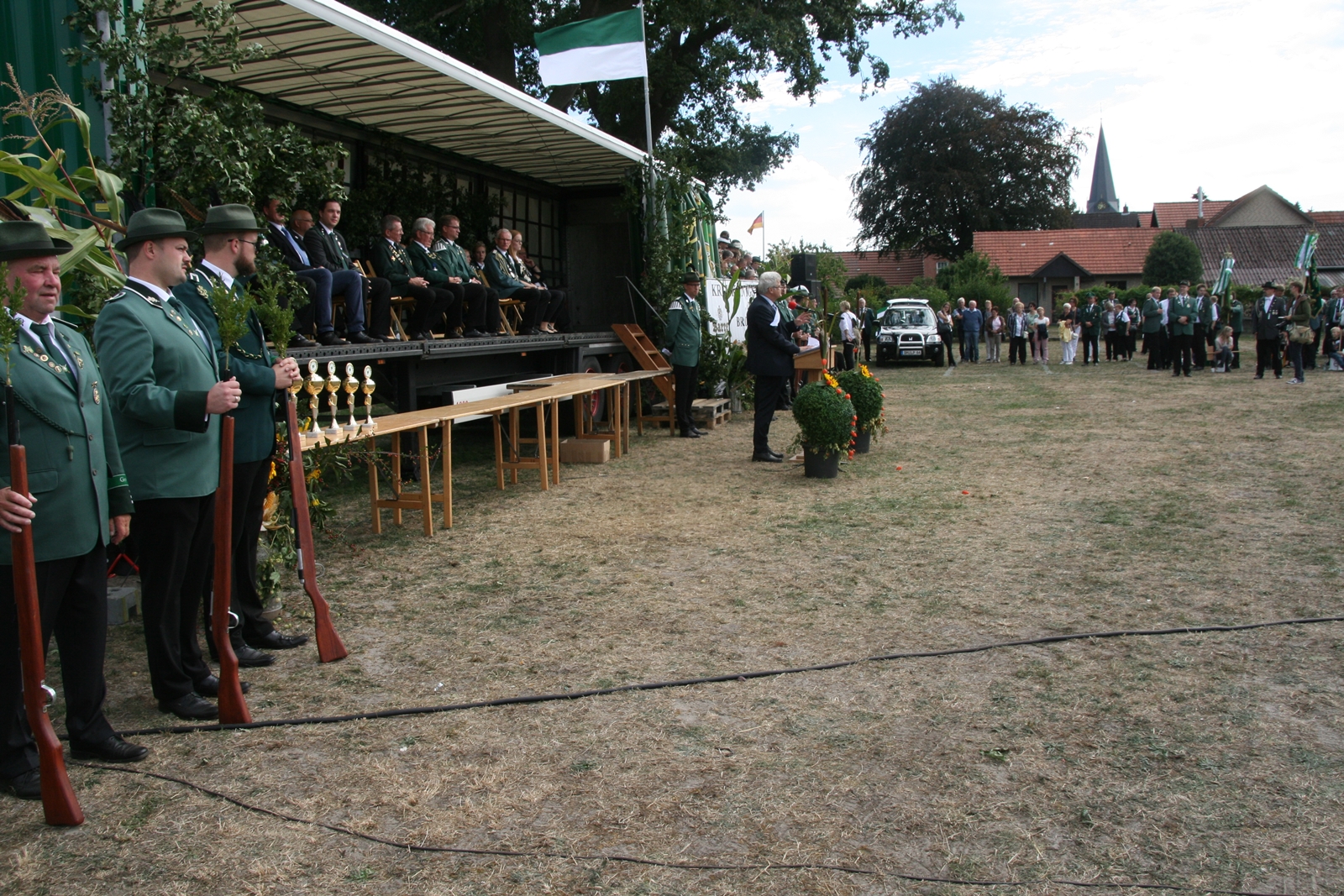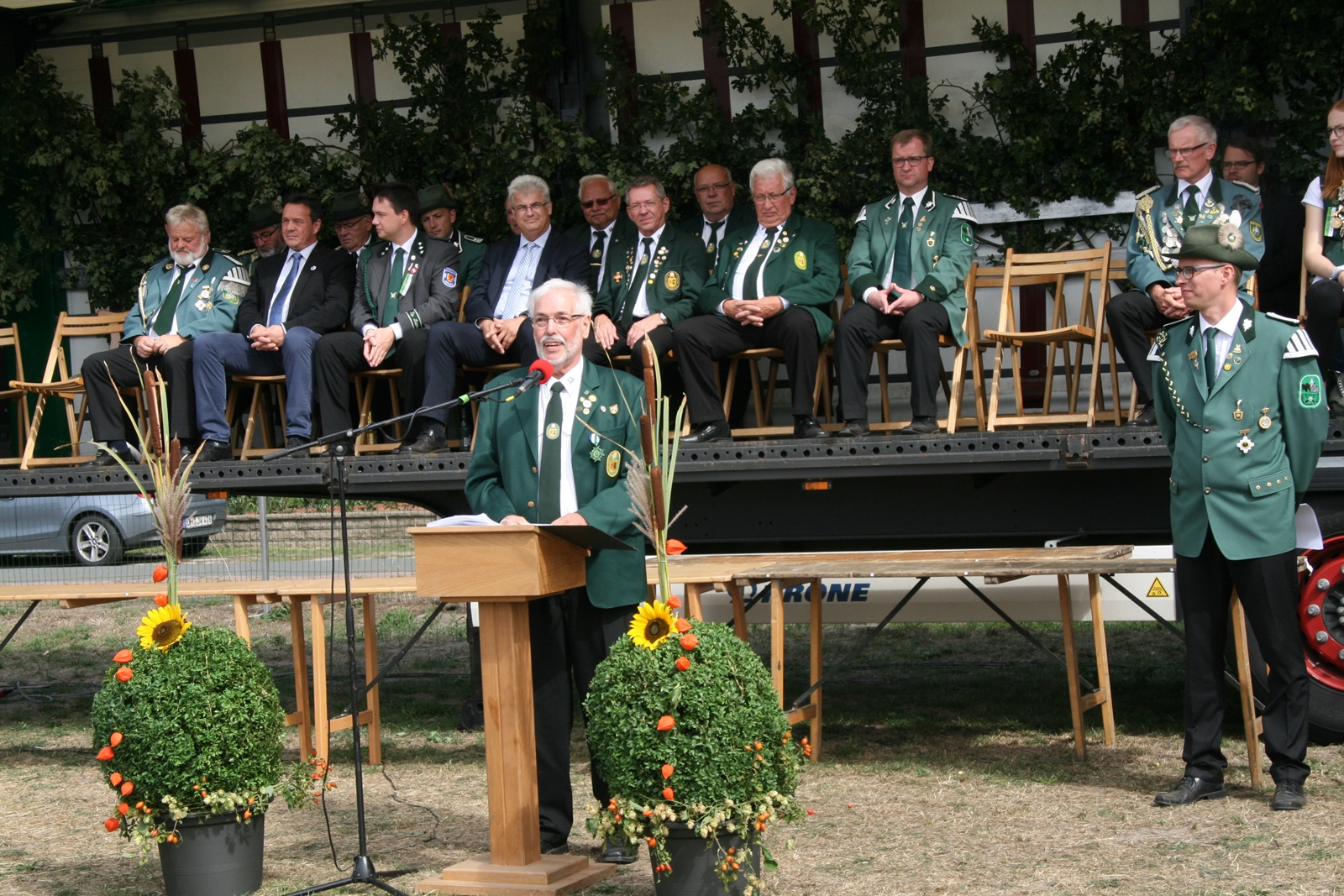 Den Reigen der Grußworte eröffnete Bürgermeister Marco Lampe er überbrachte die Grüße aus Rat u. Verwaltung u. wünschte allen Gästen fröhliche Stunden. BZ-Präsident Karl-Friedrich Scharrelmann erinnerte in seinem Grußwort auch an die 100 Jahrfeier vom SV Brockum, dass der Schützenverein Tradition - Freundschaft u. der Zusammenhalt auch heute wie damals, einen hohen Stellenwert hier im Verein habe. KV I-Präsident Manfred Rüffer feute sich auf die kommende Feier im Festzelt, mit Blick auf die mit Vereinskönigen gefüllte Tribüne, meinte er: "Ihr Könige habt dafür gesorgt, dass es diese Kreiskönigstreffen gibt, dass diese Tradition des Königsschießen weiterlebt, Danke!" Stellvtr. Landrat Heiner Richmann lobte diese gut organisierte Veranstaltung: "man kann mit Fug u. Recht sagen, das grüne Schützenherz des Landkreises Diepholz schlägt heute hier in Brockum u. das kräftig!" Axel Knöerig, MdB u. Stellvtr. Vorsitzender des KSB Diepholz sowie auch Schützenbruder, überbrachte die besten Wünsche von den 74000 KSB-DH-Mitgliedern. Es ist schon erwähnenswert, das hier 63 Schützenvereine mit ihren Majestäten gekommen sind, dazu noch 8 Spielmannszüge, welche sie dann musikalisch zum Festzelt geleiten werden. Sein Lob ging an den Vorstand, seine Mitglieder u. die weiteren Helfer. Er hob hervor, das bei den letzten Ehrungen des KSB Diepholz 34 von 66 Sportschützen u. 18 von 31 Mannschaften geehrt worden sind. Das besagt, das ca. 50 % der Geehrten aus dem Schützenwesen kommen. Mit 4350 Mitgliedern sind die Schützen die viertgrößte Gruppe im KSB Diepholz. Er wünschte allzeit Gut Schuß u. eine gute Zusammenarbeit. MdL u. Schützenmitglied beim SK Diepholz Marcel Scharrelmann brachte es auf den Punkt: "ohne die Schützenvereine ist das Leben in unseren Dörfern um vieles ärmer, unser Schützenwesen gibt uns Geborgenheit, Geselligkeit u. Zusammenhalt!" Uns allen wünsche ich ein tolles Kreiskönigstreffen mit viel Spaß!