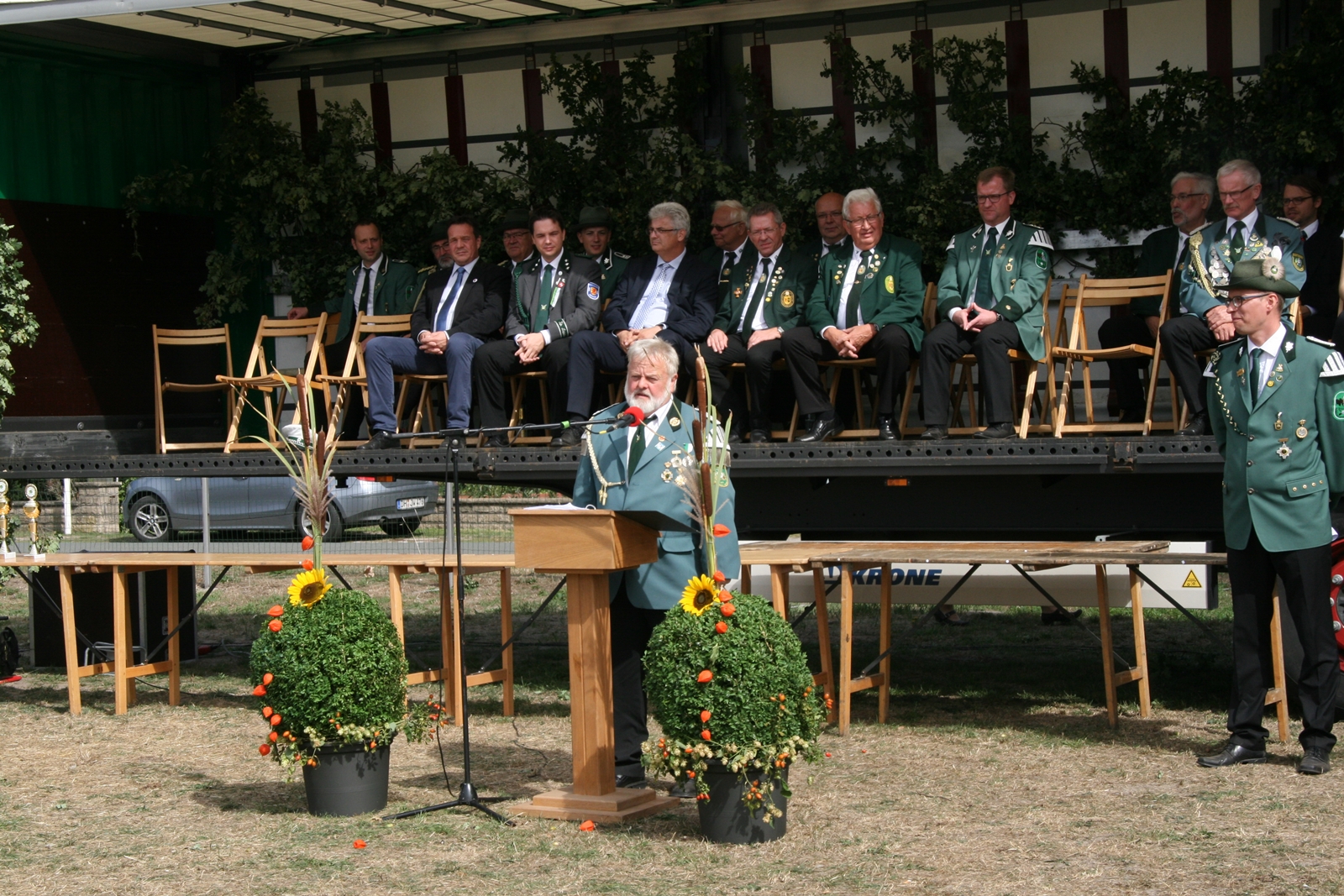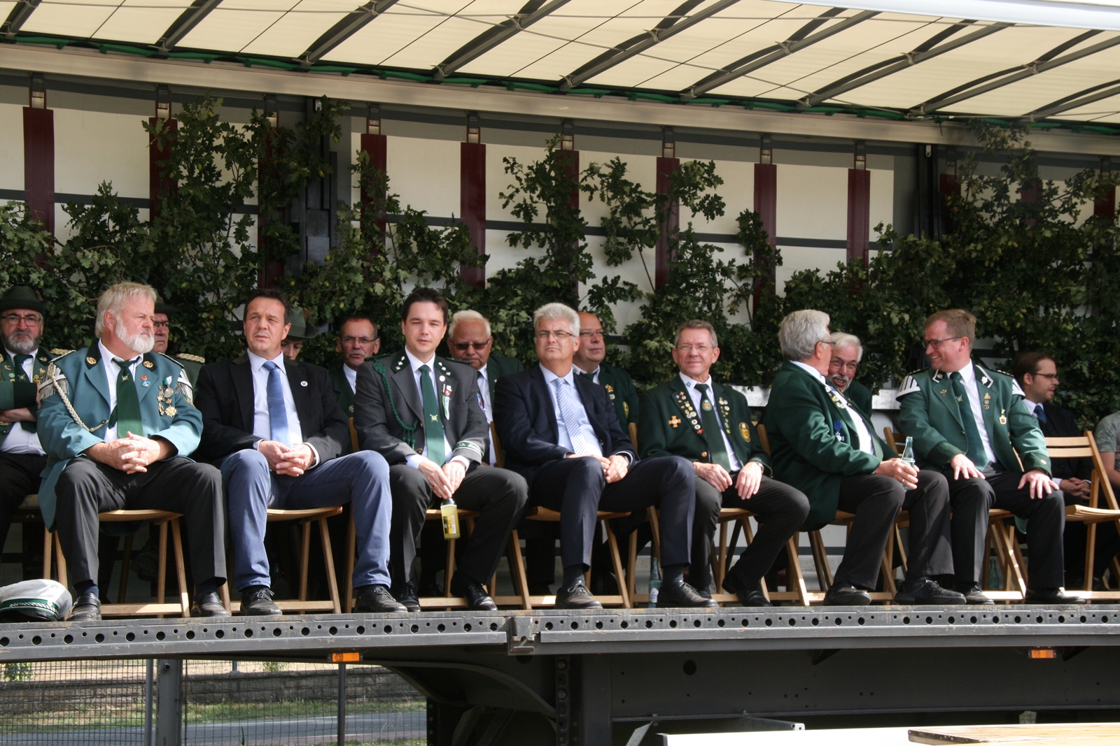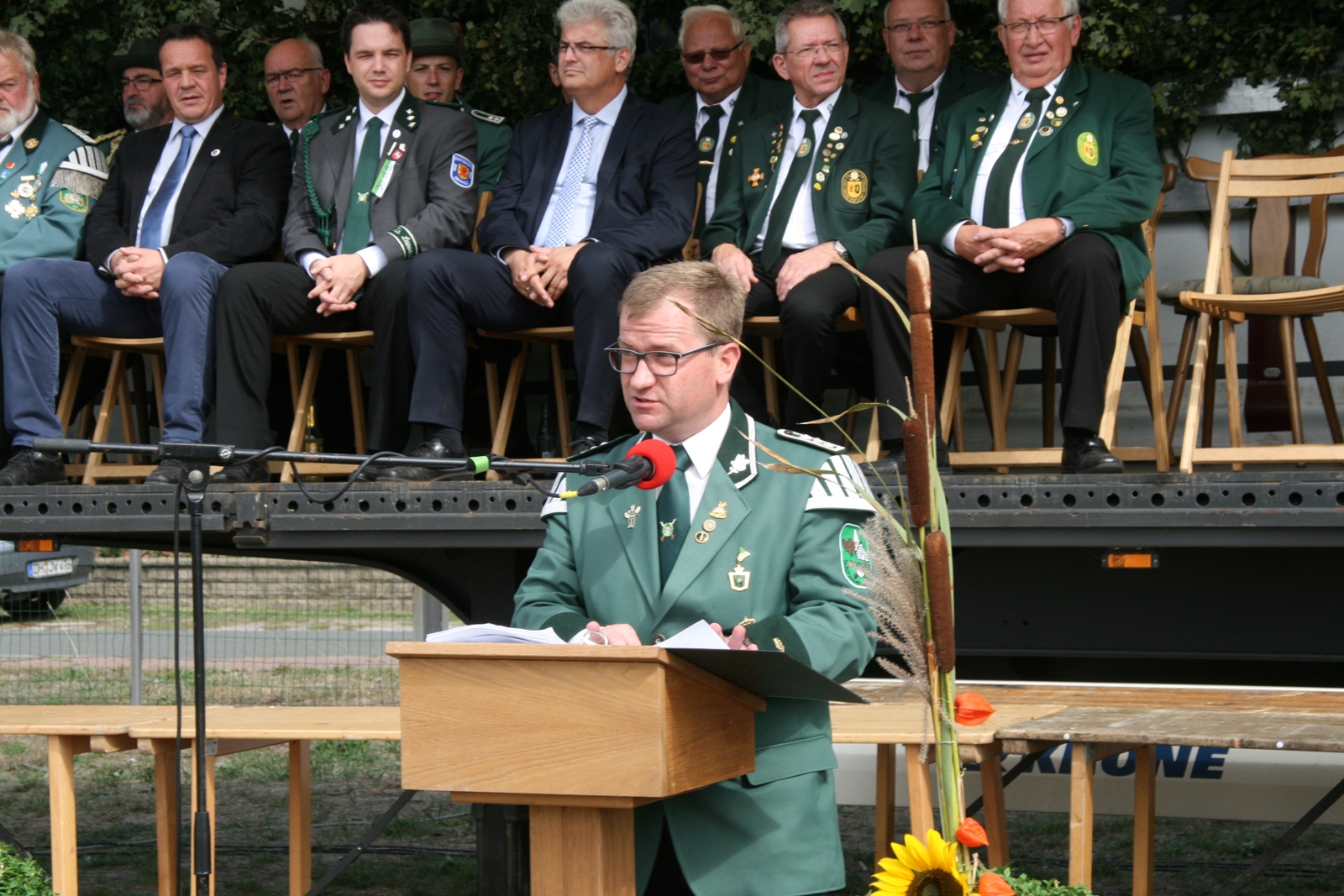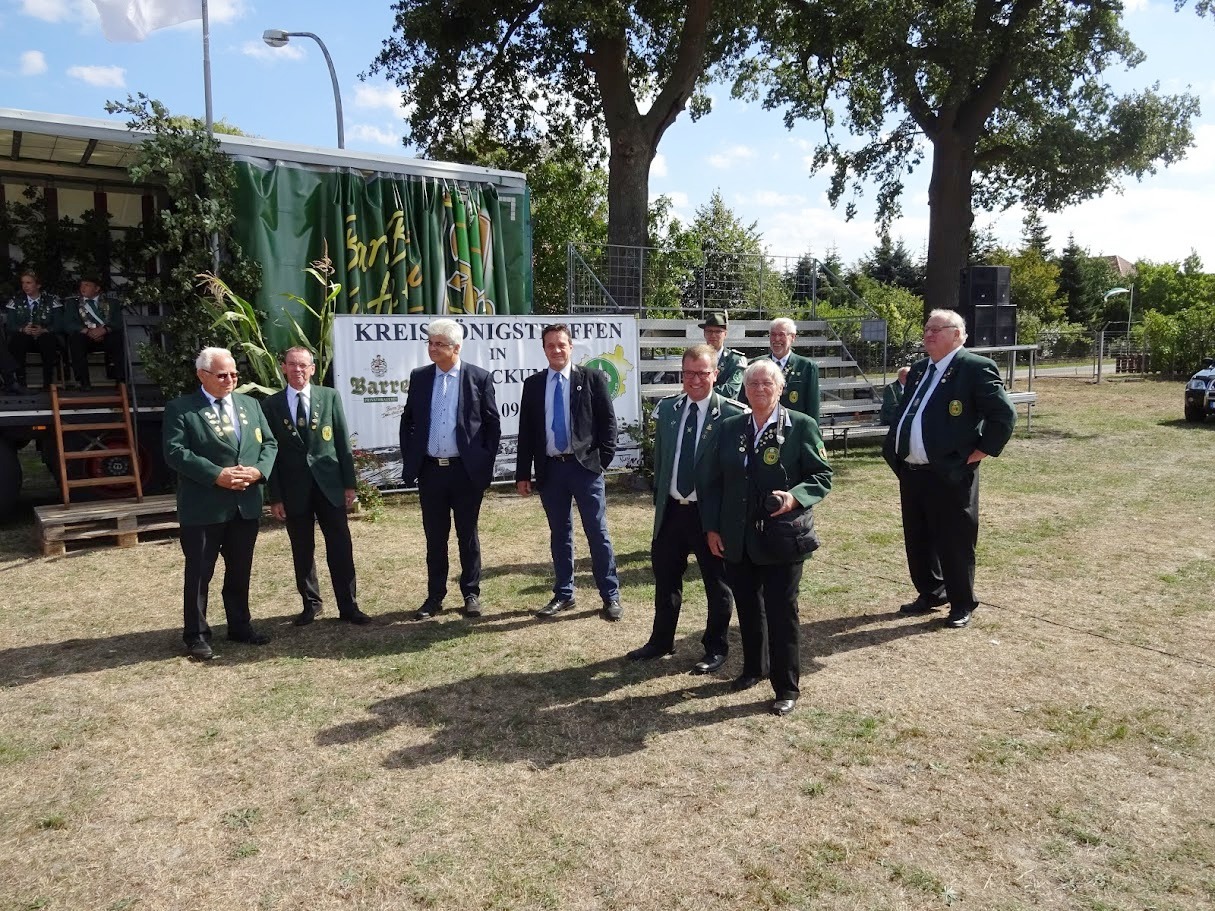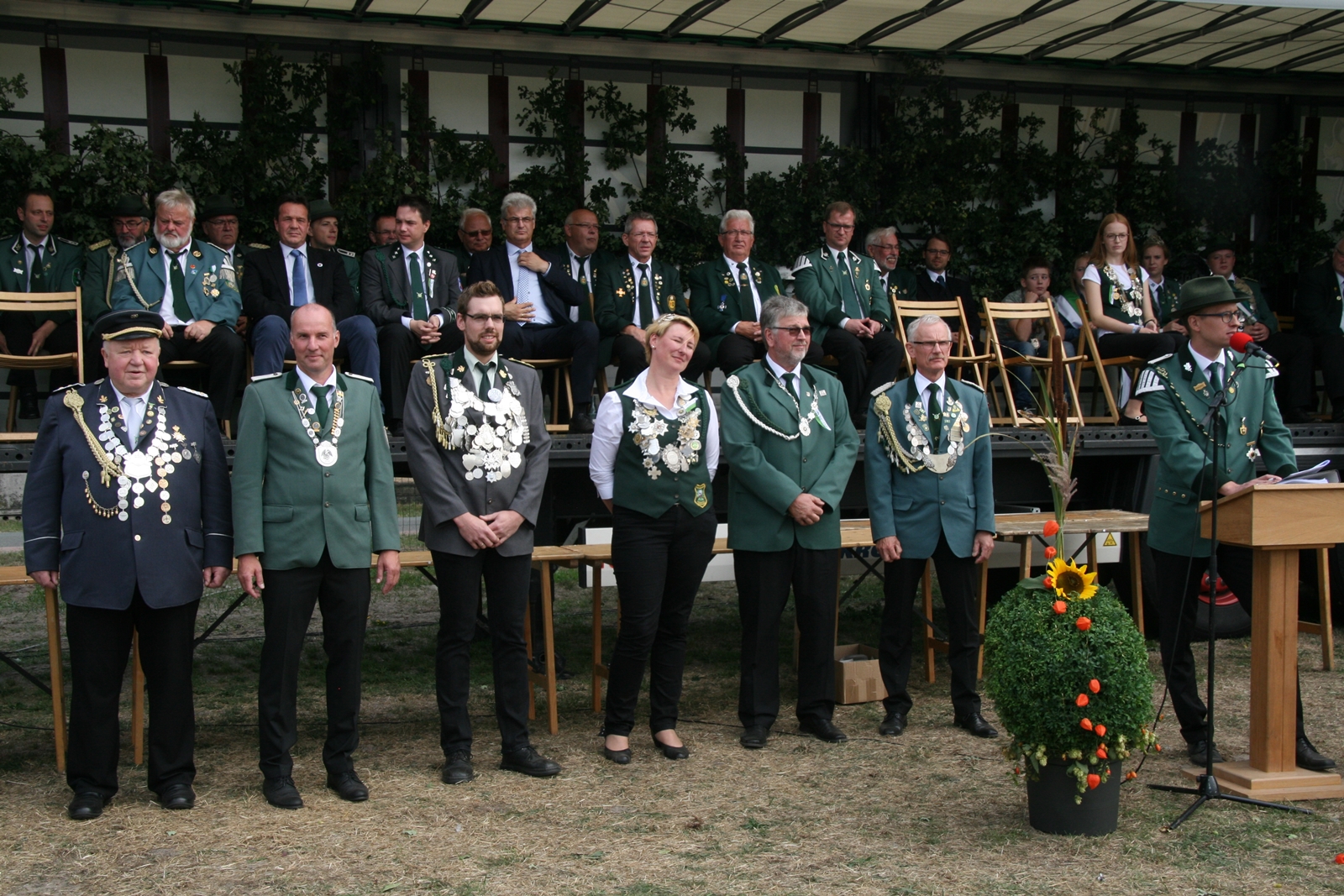 Den Reigen der Grußworte eröffnete Bürgermeister Marco Lampe er überbrachte die Grüße aus Rat u. Verwaltung u. wünschte allen Gästen fröhliche Stunden. BZ-Präsident Karl-Friedrich Scharrelmann erinnerte in seinem Grußwort auch an die 100 Jahrfeier vom SV Brockum, dass der Schützenverein Tradition - Freundschaft u. der Zusammenhalt auch heute wie damals, einen hohen Stellenwert hier im Verein habe. KV I-Präsident Manfred Rüffer feute sich auf die kommende Feier im Festzelt, mit Blick auf die mit Vereinskönigen gefüllte Tribüne, meinte er: "Ihr Könige habt dafür gesorgt, dass es diese Kreiskönigstreffen gibt, dass diese Tradition des Königsschießen weiterlebt, Danke!" Stellvtr. Landrat Heiner Richmann lobte diese gut organisierte Veranstaltung: "man kann mit Fug u. Recht sagen, das grüne Schützenherz des Landkreises Diepholz schlägt heute hier in Brockum u. das kräftig!" Axel Knöerig, MdB u. Stellvtr. Vorsitzender des KSB Diepholz sowie auch Schützenbruder, überbrachte die besten Wünsche von den 74000 KSB-DH-Mitgliedern. Es ist schon erwähnenswert, das hier 63 Schützenvereine mit ihren Majestäten gekommen sind, dazu noch 8 Spielmannszüge, welche sie dann musikalisch zum Festzelt geleiten werden. Sein Lob ging an den Vorstand, seine Mitglieder u. die weiteren Helfer. Er hob hervor, das bei den letzten Ehrungen des KSB Diepholz 34 von 66 Sportschützen u. 18 von 31 Mannschaften geehrt worden sind. Das besagt, das ca. 50 % der Geehrten aus dem Schützenwesen kommen. Mit 4350 Mitgliedern sind die Schützen die viertgrößte Gruppe im KSB Diepholz. Er wünschte allzeit Gut Schuß u. eine gute Zusammenarbeit. MdL u. Schützenmitglied beim SK Diepholz Marcel Scharrelmann brachte es auf den Punkt: "ohne die Schützenvereine ist das Leben in unseren Dörfern um vieles ärmer, unser Schützenwesen gibt uns Geborgenheit, Geselligkeit u. Zusammenhalt!" Uns allen wünsche ich ein tolles Kreiskönigstreffen mit viel Spaß!