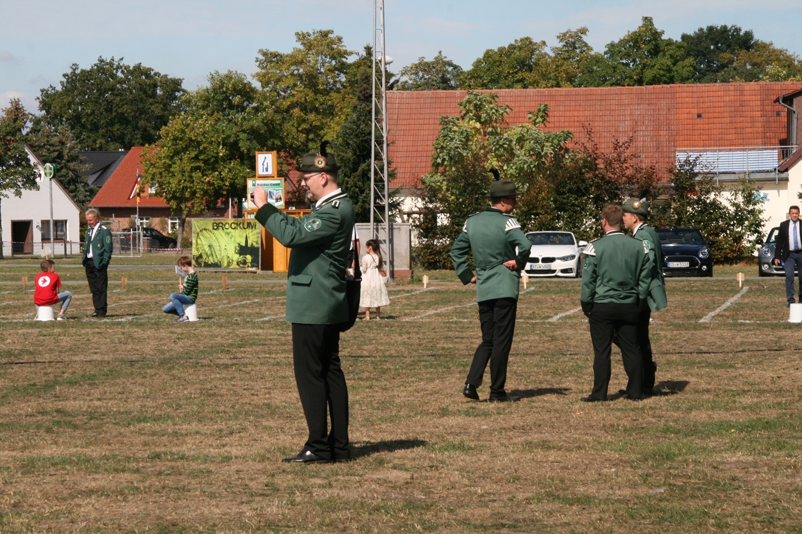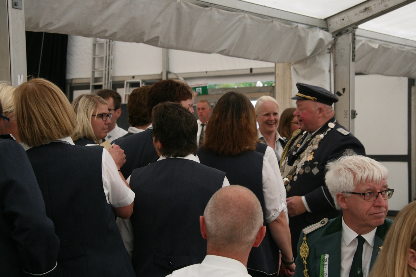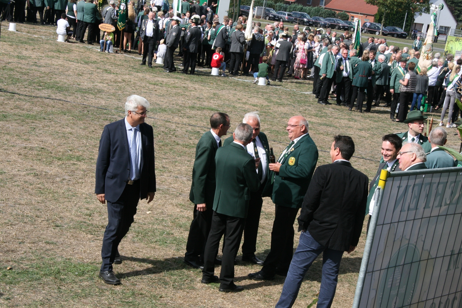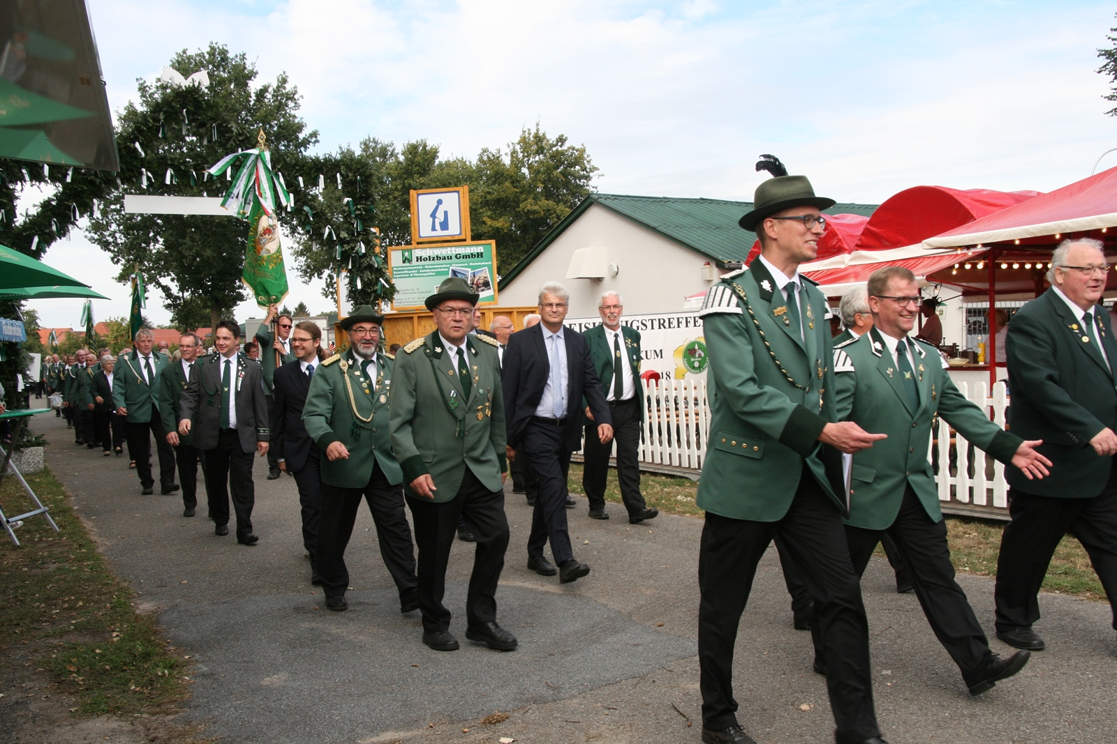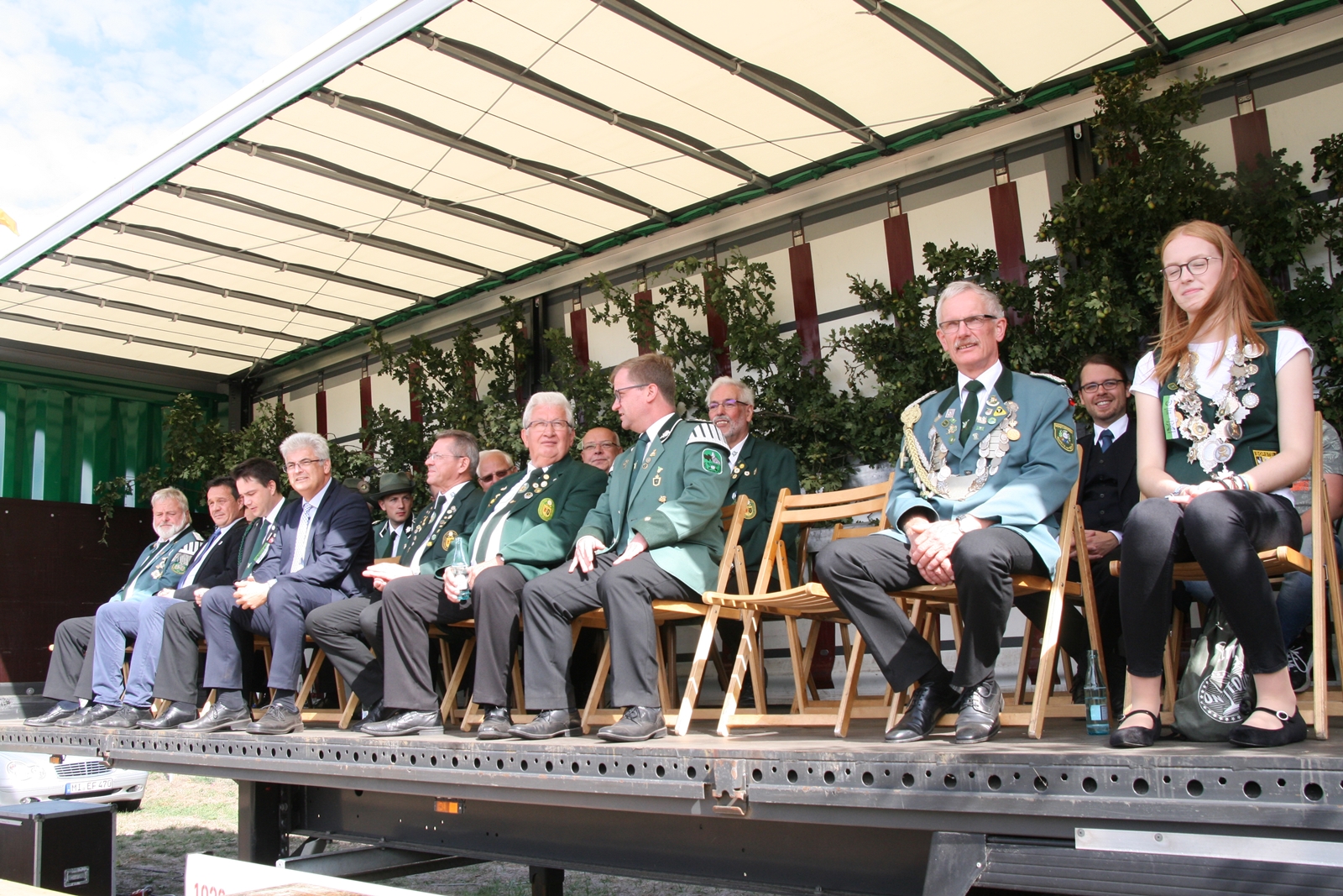 Den Reigen der Grußworte eröffnete Bürgermeister Marco Lampe er überbrachte die Grüße aus Rat u. Verwaltung u. wünschte allen Gästen fröhliche Stunden. BZ-Präsident Karl-Friedrich Scharrelmann erinnerte in seinem Grußwort auch an die 100 Jahrfeier vom SV Brockum, dass der Schützenverein Tradition - Freundschaft u. der Zusammenhalt auch heute wie damals, einen hohen Stellenwert hier im Verein habe. KV I-Präsident Manfred Rüffer feute sich auf die kommende Feier im Festzelt, mit Blick auf die mit Vereinskönigen gefüllte Tribüne, meinte er: "Ihr Könige habt dafür gesorgt, dass es diese Kreiskönigstreffen gibt, dass diese Tradition des Königsschießen weiterlebt, Danke!" Stellvtr. Landrat Heiner Richmann lobte diese gut organisierte Veranstaltung: "man kann mit Fug u. Recht sagen, das grüne Schützenherz des Landkreises Diepholz schlägt heute hier in Brockum u. das kräftig!" Axel Knöerig, MdB u. Stellvtr. Vorsitzender des KSB Diepholz sowie auch Schützenbruder, überbrachte die besten Wünsche von den 74000 KSB-DH-Mitgliedern. Es ist schon erwähnenswert, das hier 63 Schützenvereine mit ihren Majestäten gekommen sind, dazu noch 8 Spielmannszüge, welche sie dann musikalisch zum Festzelt geleiten werden. Sein Lob ging an den Vorstand, seine Mitglieder u. die weiteren Helfer. Er hob hervor, das bei den letzten Ehrungen des KSB Diepholz 34 von 66 Sportschützen u. 18 von 31 Mannschaften geehrt worden sind. Das besagt, das ca. 50 % der Geehrten aus dem Schützenwesen kommen. Mit 4350 Mitgliedern sind die Schützen die viertgrößte Gruppe im KSB Diepholz. Er wünschte allzeit Gut Schuß u. eine gute Zusammenarbeit. MdL u. Schützenmitglied beim SK Diepholz Marcel Scharrelmann brachte es auf den Punkt: "ohne die Schützenvereine ist das Leben in unseren Dörfern um vieles ärmer, unser Schützenwesen gibt uns Geborgenheit, Geselligkeit u. Zusammenhalt!" Uns allen wünsche ich ein tolles Kreiskönigstreffen mit viel Spaß!