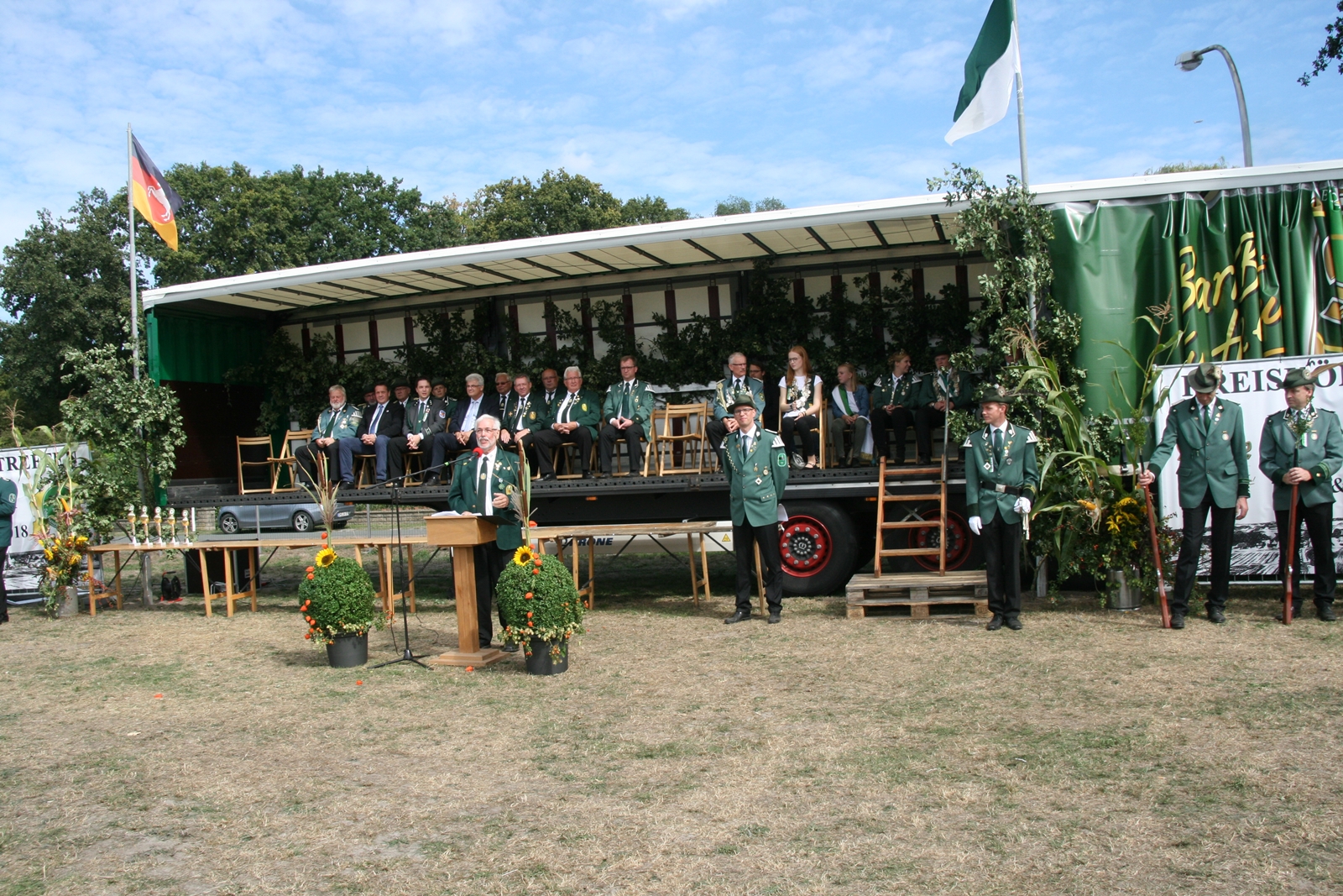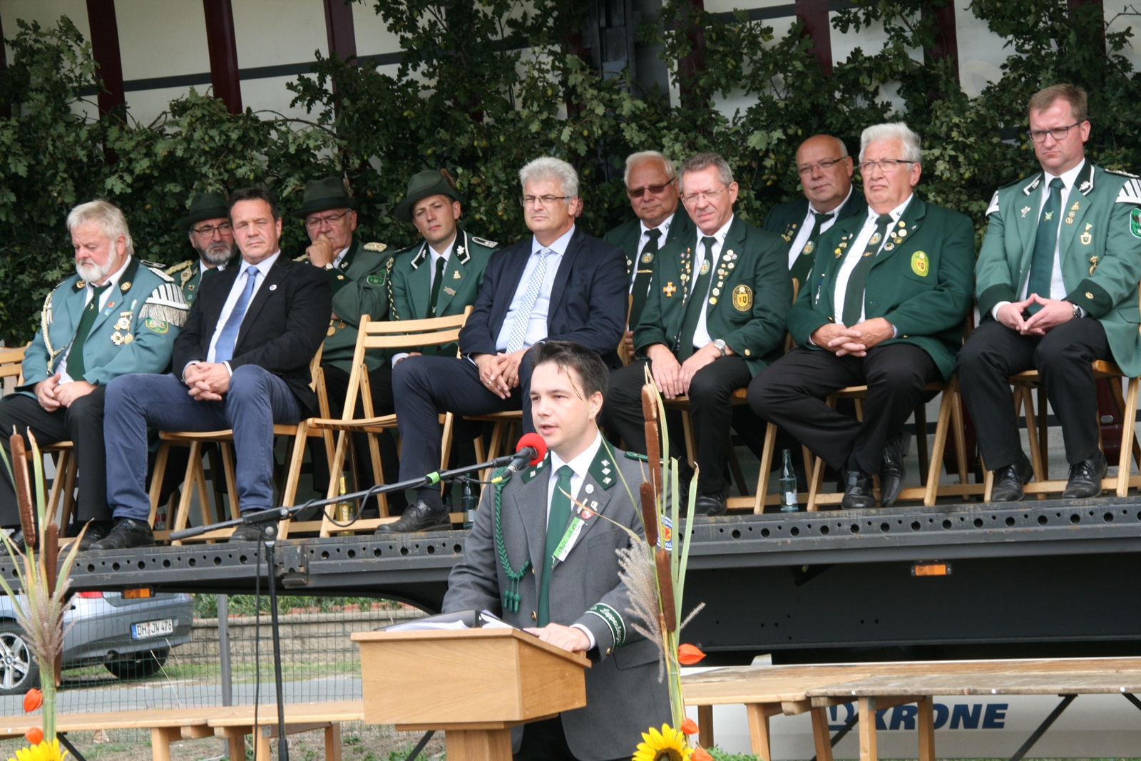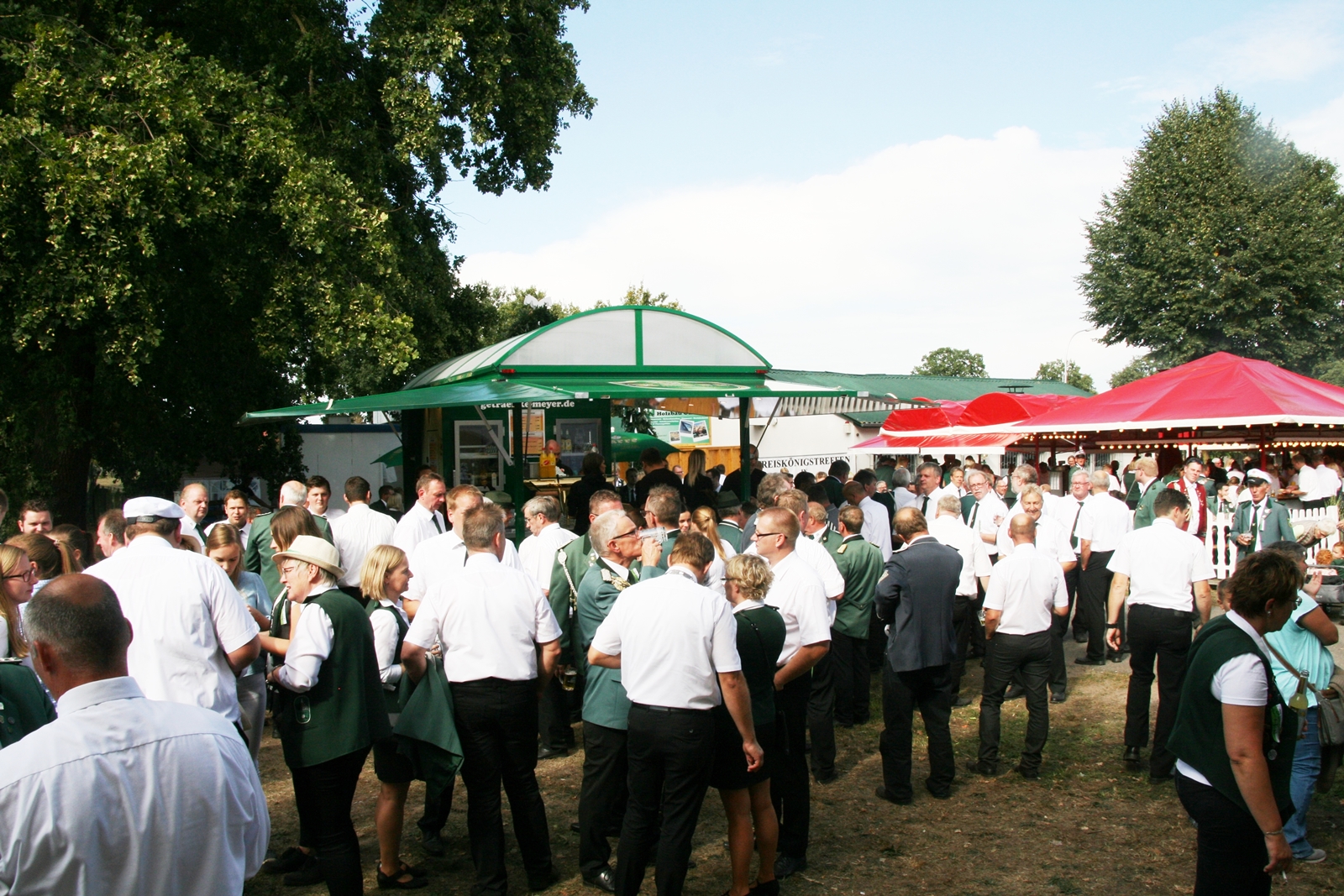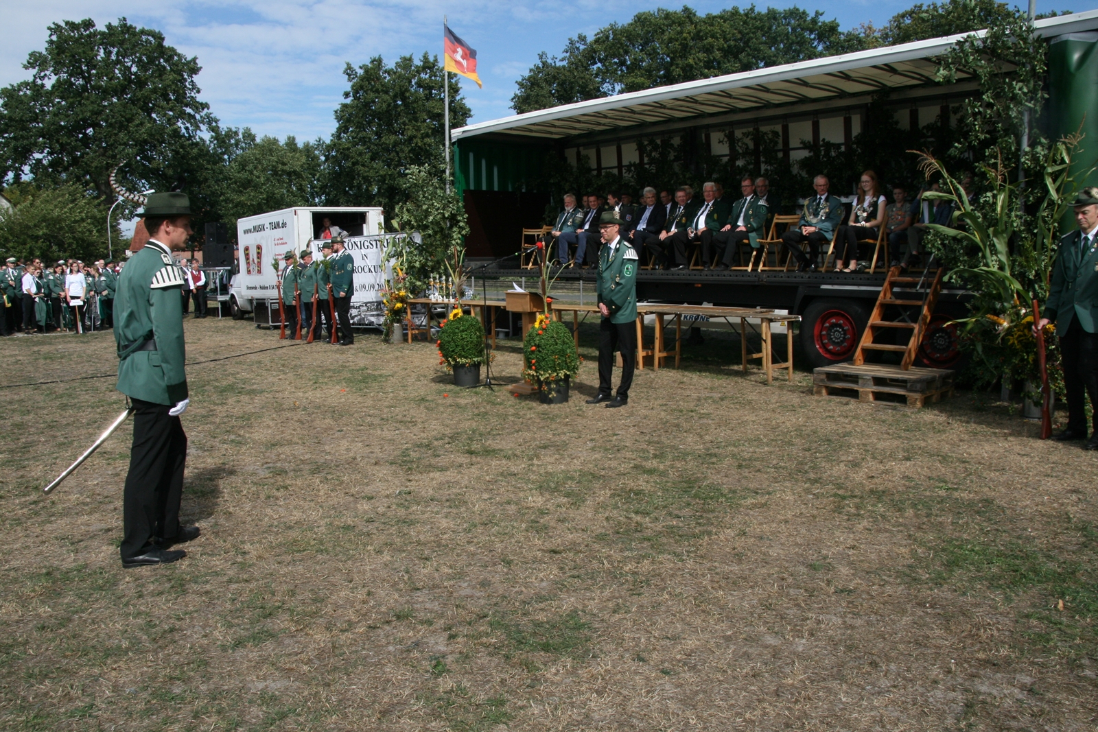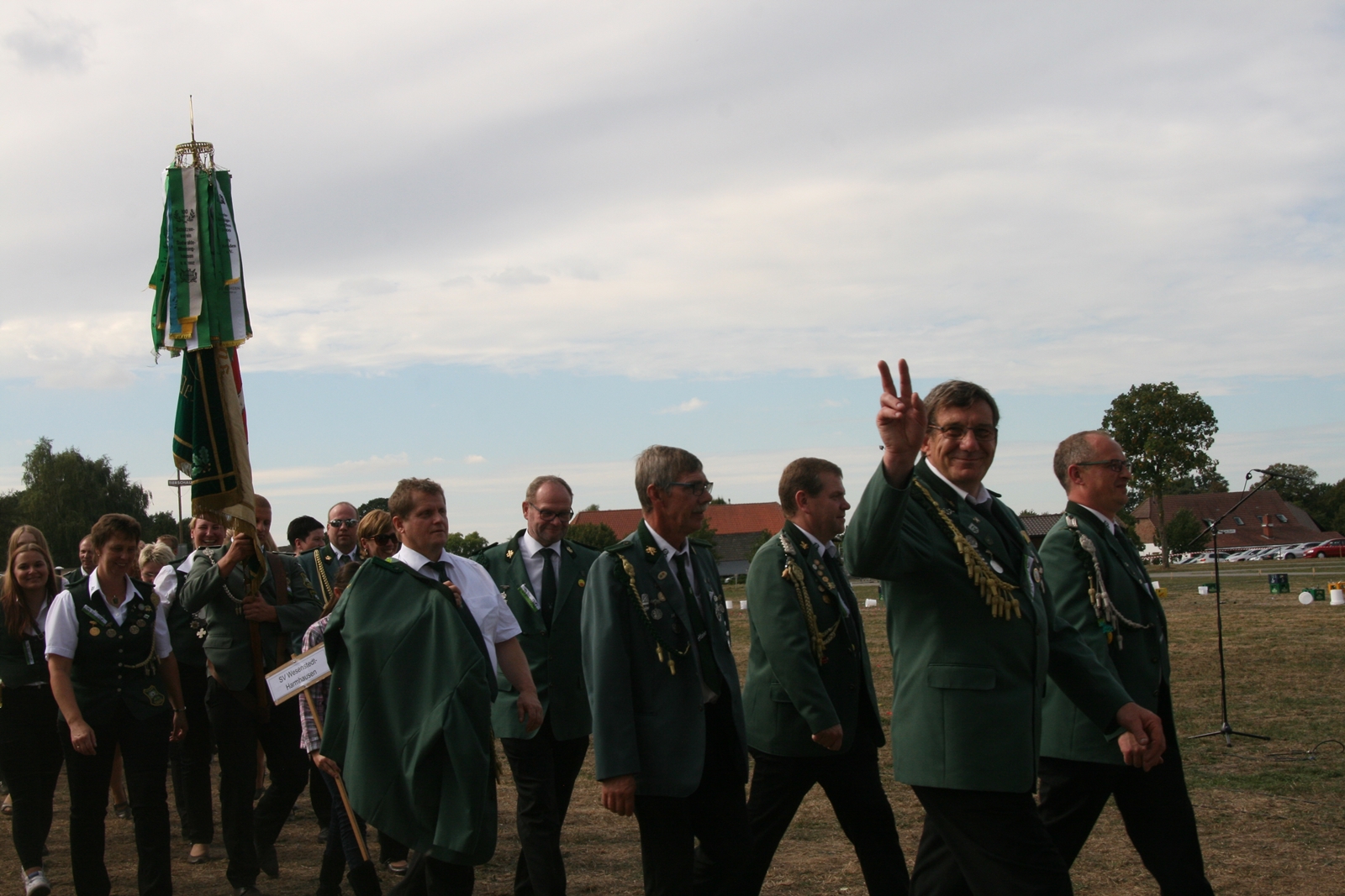 Den Reigen der Grußworte eröffnete Bürgermeister Marco Lampe er überbrachte die Grüße aus Rat u. Verwaltung u. wünschte allen Gästen fröhliche Stunden. BZ-Präsident Karl-Friedrich Scharrelmann erinnerte in seinem Grußwort auch an die 100 Jahrfeier vom SV Brockum, dass der Schützenverein Tradition - Freundschaft u. der Zusammenhalt auch heute wie damals, einen hohen Stellenwert hier im Verein habe. KV I-Präsident Manfred Rüffer feute sich auf die kommende Feier im Festzelt, mit Blick auf die mit Vereinskönigen gefüllte Tribüne, meinte er: "Ihr Könige habt dafür gesorgt, dass es diese Kreiskönigstreffen gibt, dass diese Tradition des Königsschießen weiterlebt, Danke!" Stellvtr. Landrat Heiner Richmann lobte diese gut organisierte Veranstaltung: "man kann mit Fug u. Recht sagen, das grüne Schützenherz des Landkreises Diepholz schlägt heute hier in Brockum u. das kräftig!" Axel Knöerig, MdB u. Stellvtr. Vorsitzender des KSB Diepholz sowie auch Schützenbruder, überbrachte die besten Wünsche von den 74000 KSB-DH-Mitgliedern. Es ist schon erwähnenswert, das hier 63 Schützenvereine mit ihren Majestäten gekommen sind, dazu noch 8 Spielmannszüge, welche sie dann musikalisch zum Festzelt geleiten werden. Sein Lob ging an den Vorstand, seine Mitglieder u. die weiteren Helfer. Er hob hervor, das bei den letzten Ehrungen des KSB Diepholz 34 von 66 Sportschützen u. 18 von 31 Mannschaften geehrt worden sind. Das besagt, das ca. 50 % der Geehrten aus dem Schützenwesen kommen. Mit 4350 Mitgliedern sind die Schützen die viertgrößte Gruppe im KSB Diepholz. Er wünschte allzeit Gut Schuß u. eine gute Zusammenarbeit. MdL u. Schützenmitglied beim SK Diepholz Marcel Scharrelmann brachte es auf den Punkt: "ohne die Schützenvereine ist das Leben in unseren Dörfern um vieles ärmer, unser Schützenwesen gibt uns Geborgenheit, Geselligkeit u. Zusammenhalt!" Uns allen wünsche ich ein tolles Kreiskönigstreffen mit viel Spaß!