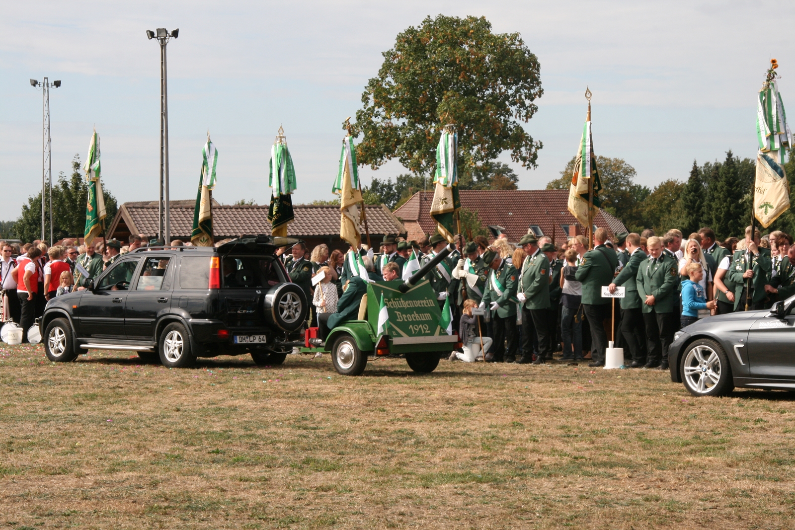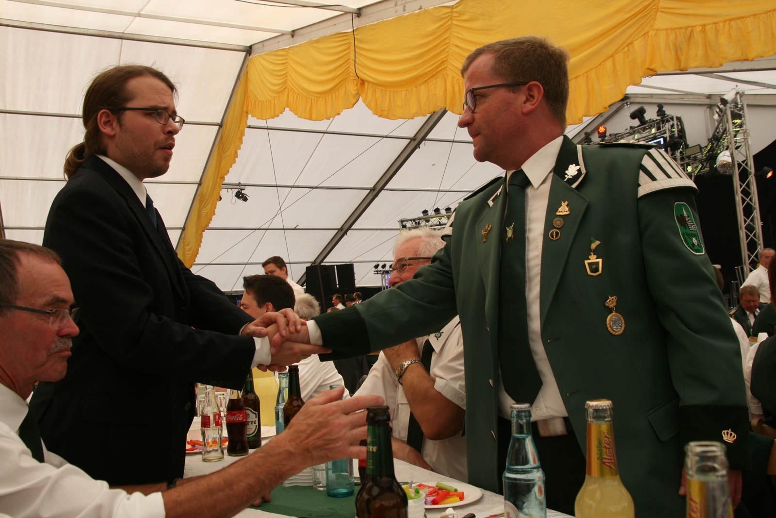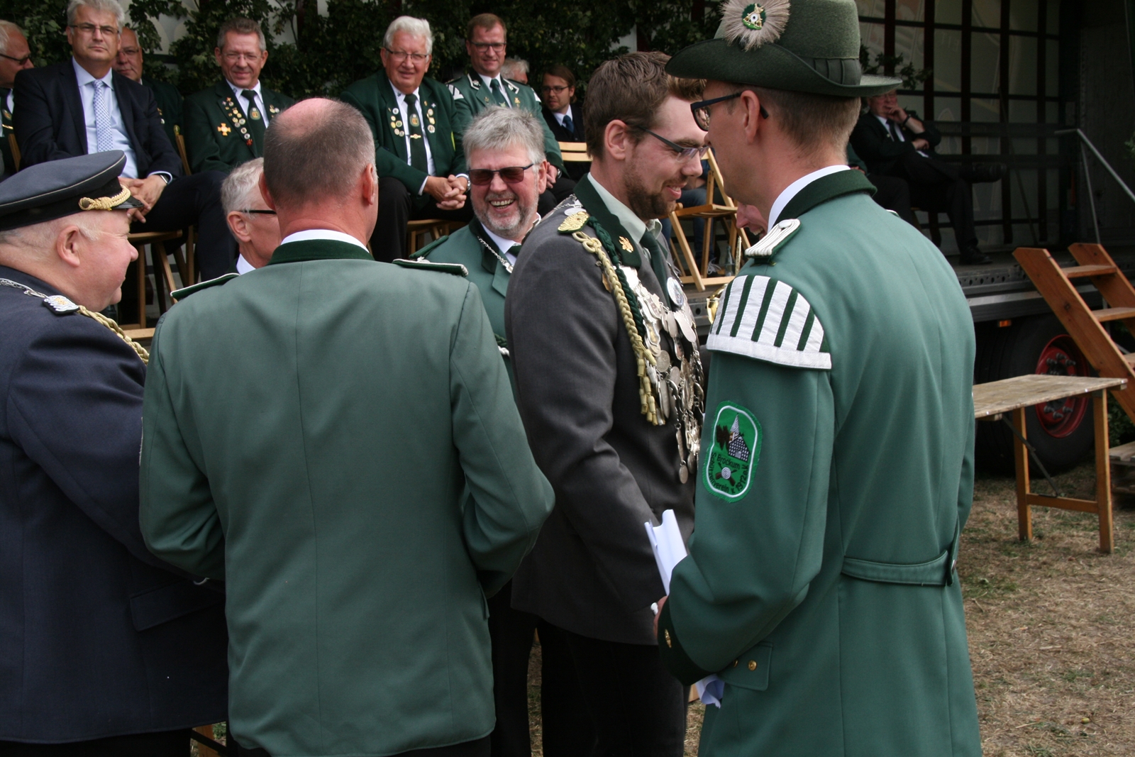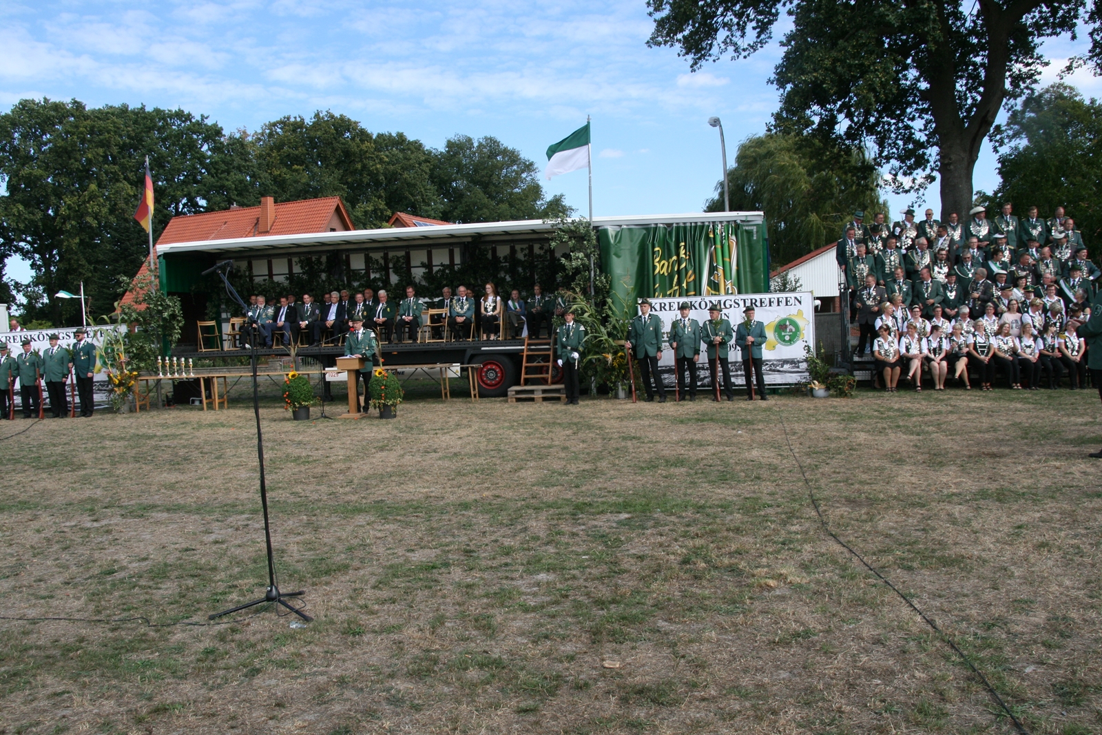 Den Reigen der Grußworte eröffnete Bürgermeister Marco Lampe er überbrachte die Grüße aus Rat u. Verwaltung u. wünschte allen Gästen fröhliche Stunden. BZ-Präsident Karl-Friedrich Scharrelmann erinnerte in seinem Grußwort auch an die 100 Jahrfeier vom SV Brockum, dass der Schützenverein Tradition - Freundschaft u. der Zusammenhalt auch heute wie damals, einen hohen Stellenwert hier im Verein habe. KV I-Präsident Manfred Rüffer feute sich auf die kommende Feier im Festzelt, mit Blick auf die mit Vereinskönigen gefüllte Tribüne, meinte er: "Ihr Könige habt dafür gesorgt, dass es diese Kreiskönigstreffen gibt, dass diese Tradition des Königsschießen weiterlebt, Danke!" Stellvtr. Landrat Heiner Richmann lobte diese gut organisierte Veranstaltung: "man kann mit Fug u. Recht sagen, das grüne Schützenherz des Landkreises Diepholz schlägt heute hier in Brockum u. das kräftig!" Axel Knöerig, MdB u. Stellvtr. Vorsitzender des KSB Diepholz sowie auch Schützenbruder, überbrachte die besten Wünsche von den 74000 KSB-DH-Mitgliedern. Es ist schon erwähnenswert, das hier 63 Schützenvereine mit ihren Majestäten gekommen sind, dazu noch 8 Spielmannszüge, welche sie dann musikalisch zum Festzelt geleiten werden. Sein Lob ging an den Vorstand, seine Mitglieder u. die weiteren Helfer. Er hob hervor, das bei den letzten Ehrungen des KSB Diepholz 34 von 66 Sportschützen u. 18 von 31 Mannschaften geehrt worden sind. Das besagt, das ca. 50 % der Geehrten aus dem Schützenwesen kommen. Mit 4350 Mitgliedern sind die Schützen die viertgrößte Gruppe im KSB Diepholz. Er wünschte allzeit Gut Schuß u. eine gute Zusammenarbeit. MdL u. Schützenmitglied beim SK Diepholz Marcel Scharrelmann brachte es auf den Punkt: "ohne die Schützenvereine ist das Leben in unseren Dörfern um vieles ärmer, unser Schützenwesen gibt uns Geborgenheit, Geselligkeit u. Zusammenhalt!" Uns allen wünsche ich ein tolles Kreiskönigstreffen mit viel Spaß!