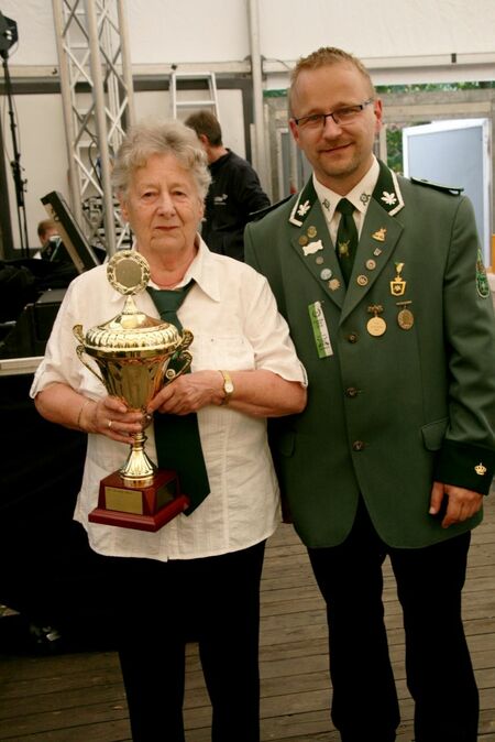 Helga Siemers vom SV Gaue erhielt von Schießsportleiter Lars Steinmüller für ihr tolles Ergebnis von 40 R. und einem Teiler von 301 den Wanderpokal der ehemaligen Kreiskönige.