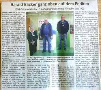 Harald Backer vom SV Drebber von 1900 hat in der Seniorenklasse II Disziplin Luftgewehr Auflage, am Sonntag, den 15. April mit 315,8 Ringen eine GOLDMEDAILLE errungen. Glückwunsch!!