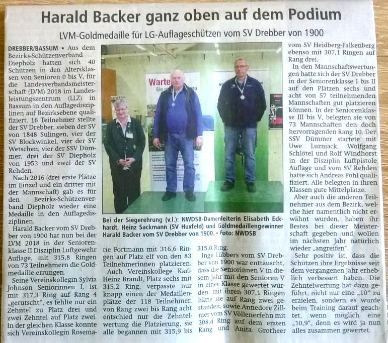Harald Backer vom SV Drebber von 1900 hat nun bei der LVM 2018 in der Seniorenklasse II Disziplin Luftgewehr Auflage, mit 315,8 Ringen von 73 Teilnehmern die GOLDMEDAILLE errungen. Glückwunsch!