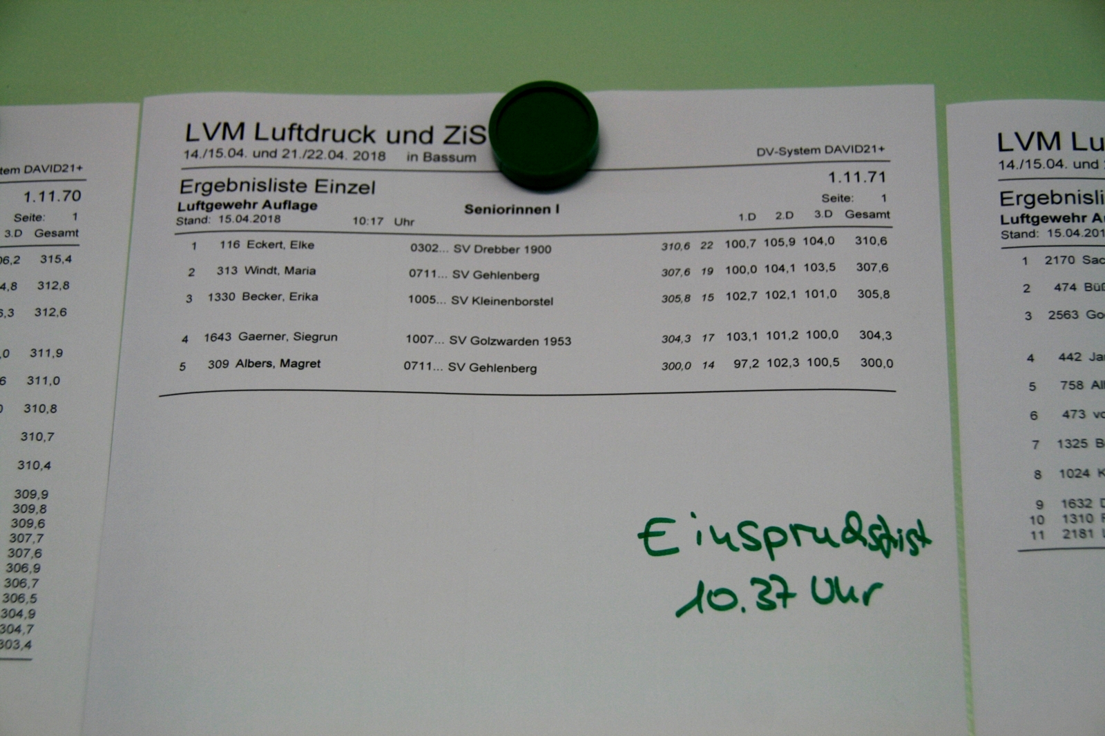 Nicht nur Inge Lübbers war enttäuscht, dass die Seniorinnen V in diesem Jahr mit den Senioren V in einer Klasse gewertet wurden: mit ihren 307,1 Ringen hätte sie auf Rang zwei gestanden, sowie Annedore Zillmer vom SV Völlenerfehn mit 308,4 Ring auf dem ersten Rang und Anita Grotheer vom SV Heidberg-Falkenberg ebenso mit 307,1 Ringen auf Rang drei. Vielleicht wird, was zu wünschen wäre, dieses im nächsten Jahr wieder geändert.