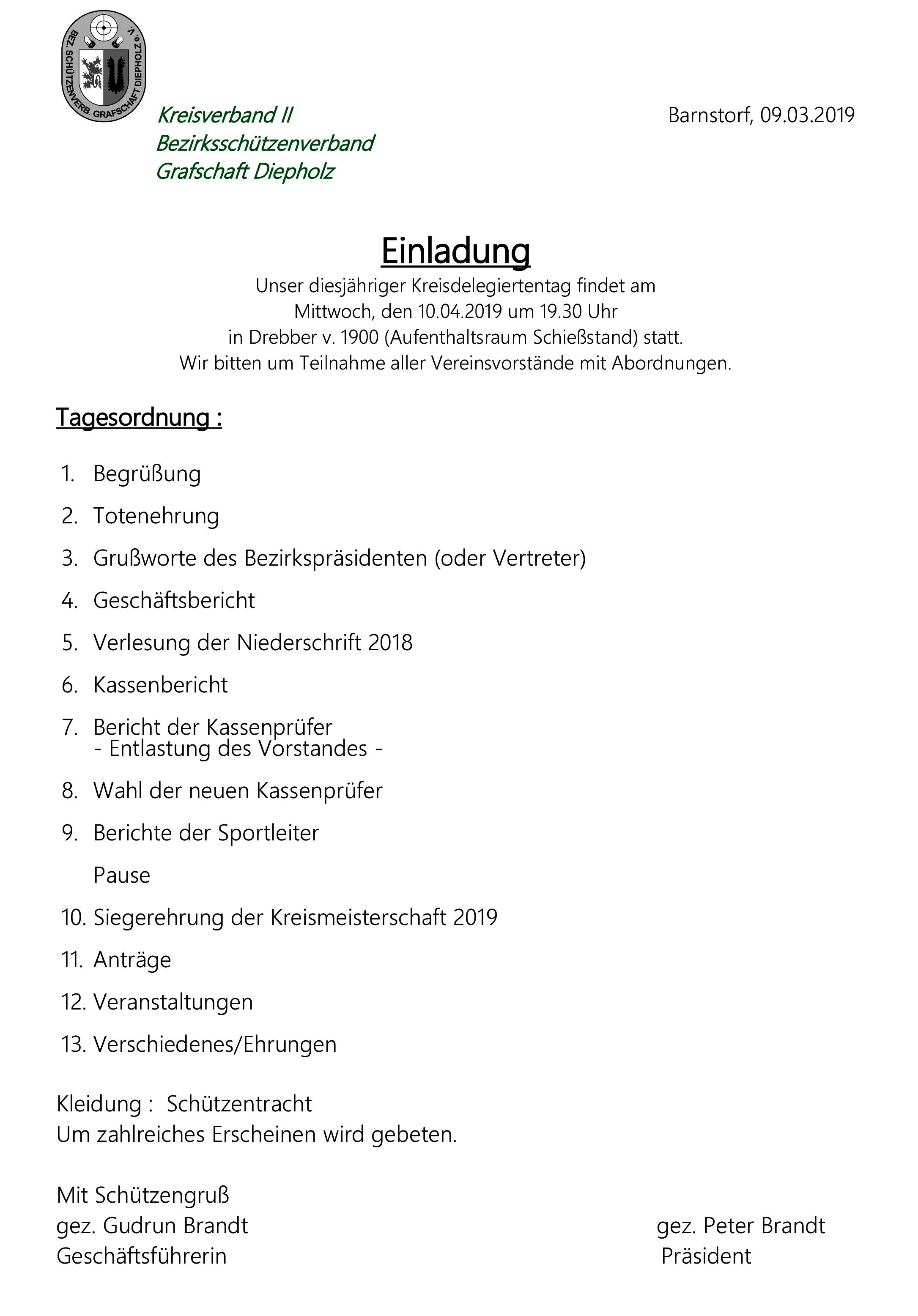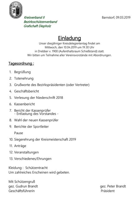 Der Vorstand des Kreisverbandes II im Bezirks-Schützenverband Grafschaft Diepholz bittet um die Teilnahme aller Vereinsvorstände mit Abordnungen, um 19:30 Uhr im Schützenhaus Drebber von 1900.