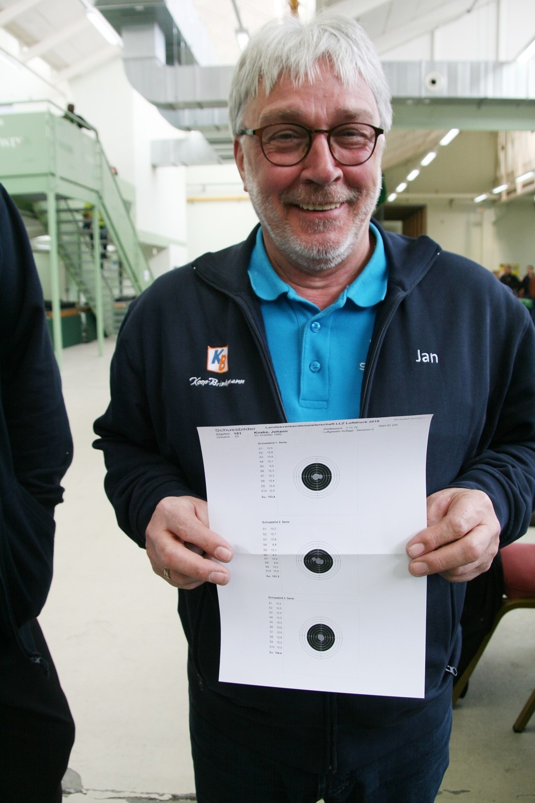 Jürgen Harzmeier ist in der Hinsicht schon ein alter „Hase“, aber trotzdem fällt einem eine SILBERMEDAILLE nicht einfach so zu! Gesundheitlich leicht angeschlagen, gab er sich wohl besonders viel Mühe und dieses hat sich gelohnt: 104,7, 105,4 und 105,9 ergaben sein super Endresultat von 316,0 Ringen, in 2018 waren 73 Teilnehmer in der Seniorenklasse II zu diesem Wettkampf angetreten, in diesem Jahr kämpften 116 Senioren um Medaillen.