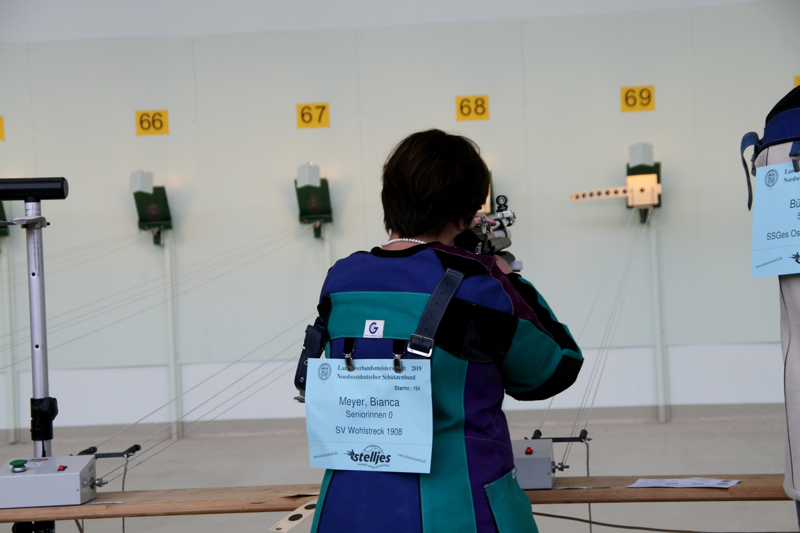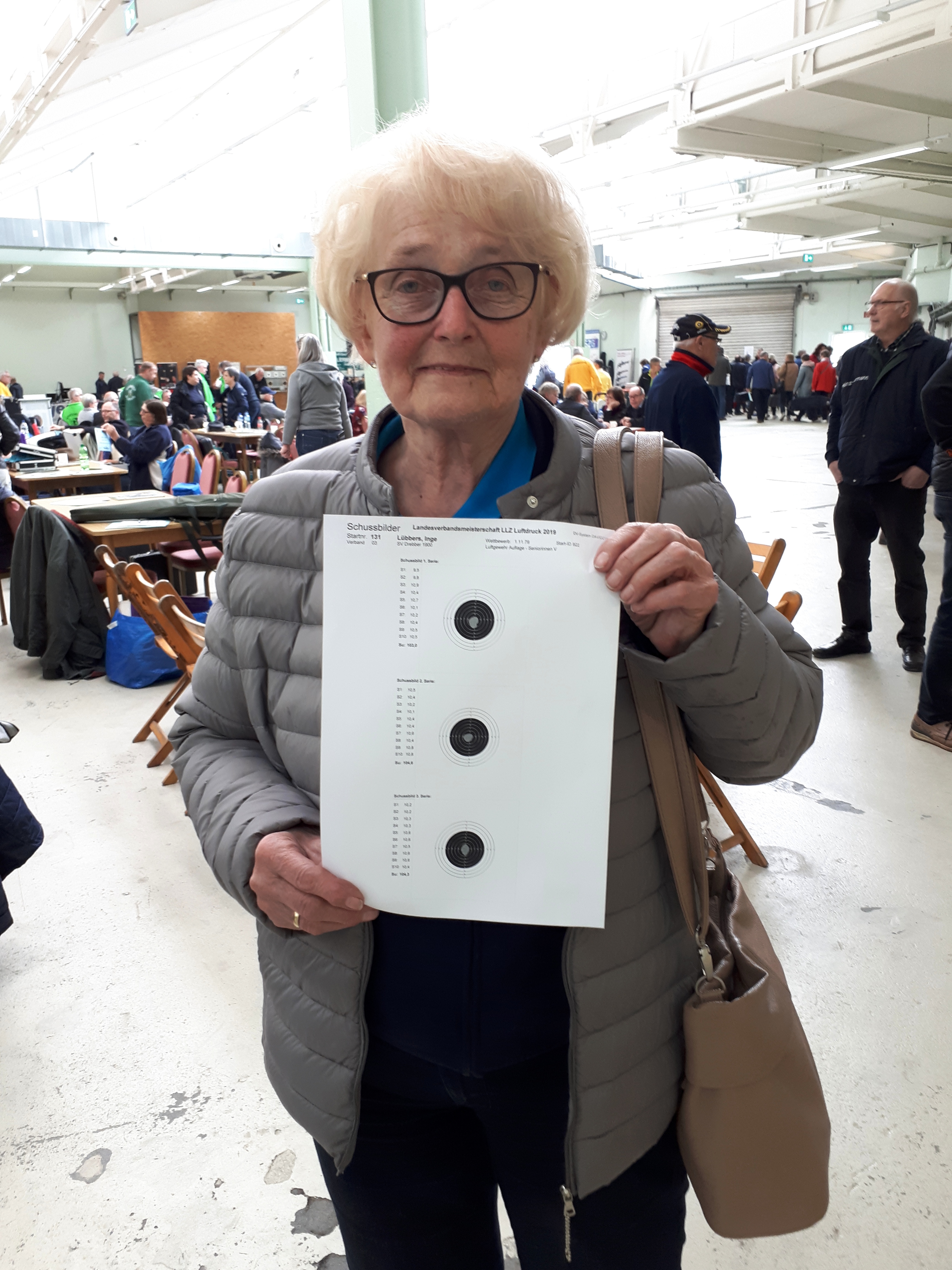 Seit Jahren, ja Jahrzehnten, gehört Inge Lübbers zu den zielsichersten Schützinnen in ihrer Klasse im Bezirks-Schützenverband Diepholz. Schon vor mehr als zehn Jahren wollte die nun 80-Jährige das Luftgewehr an den Nagel hängen, zum Glück hat sie es nicht getan! Nun hat sie ihre „Farbpalette“ in Punkto Landesmeisterschaftsmedaillen Luftgewehr Auflage voll: GOLD (2016), SILBER (2019) und Bronze (2015). Um die MEDAILLEN in der Seniorinnenklasse V kämpften in diesem Jahr 20 Teilnehmerinnen.