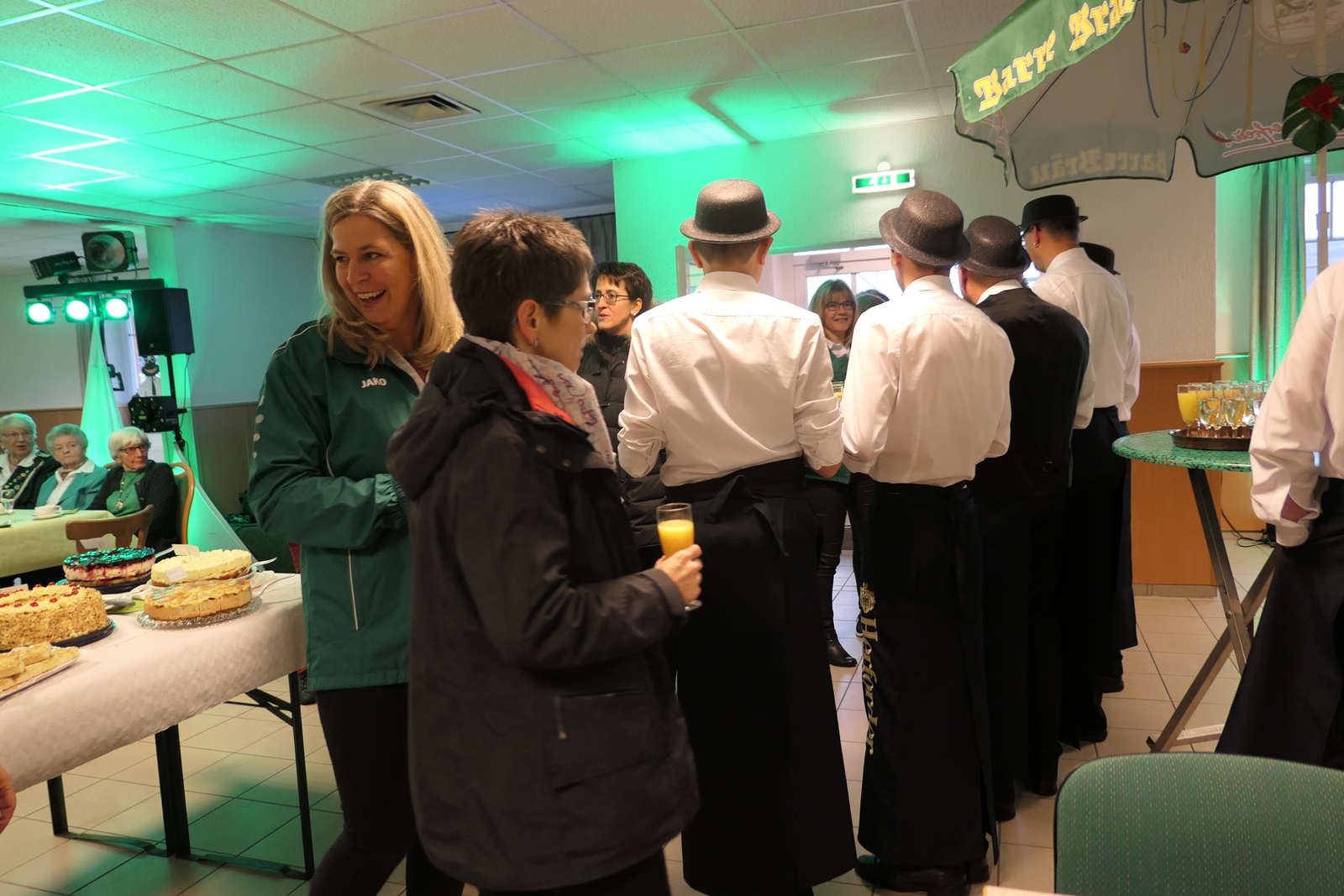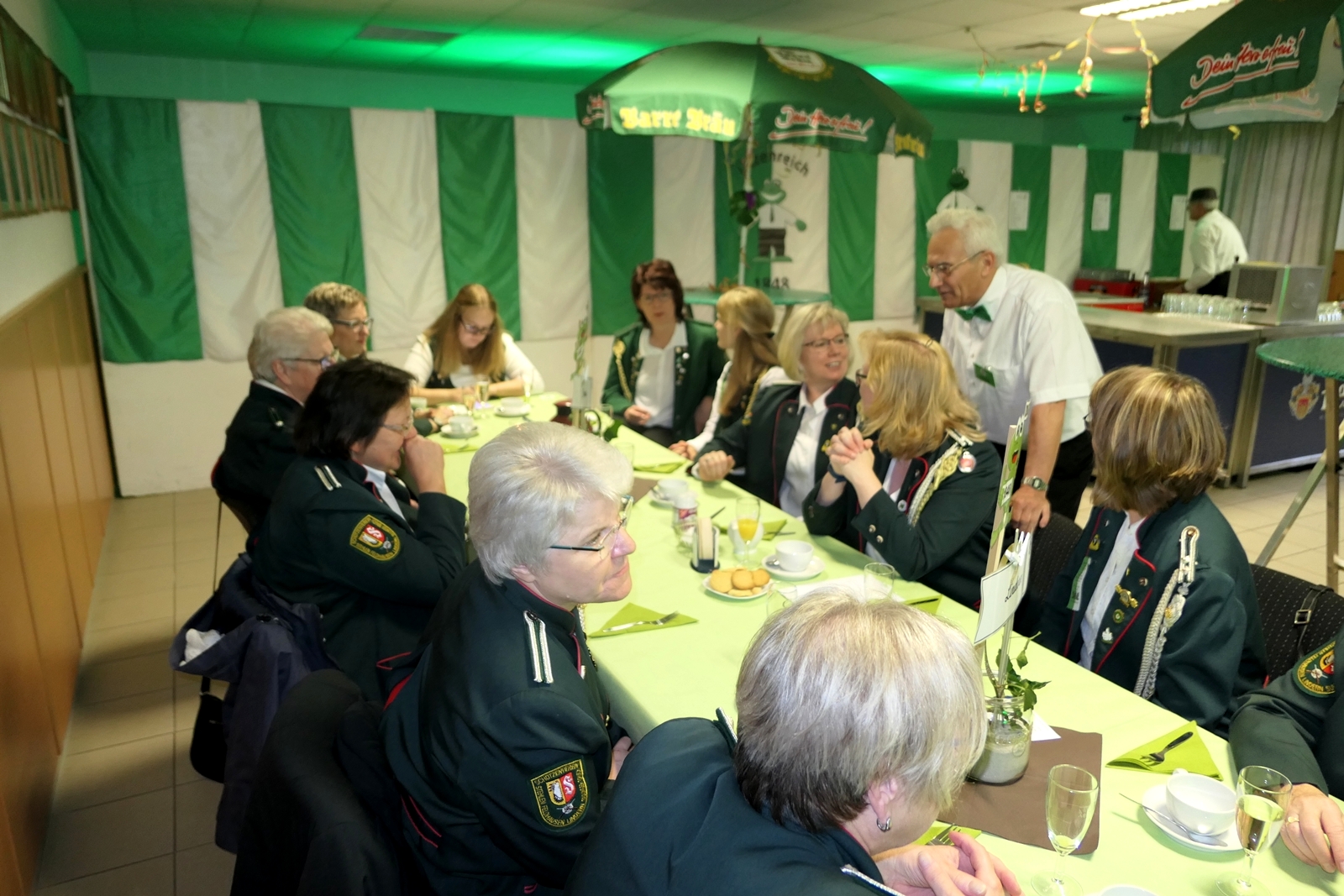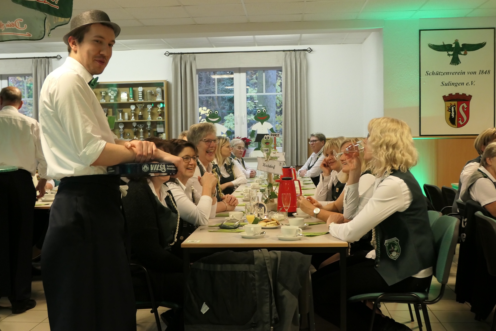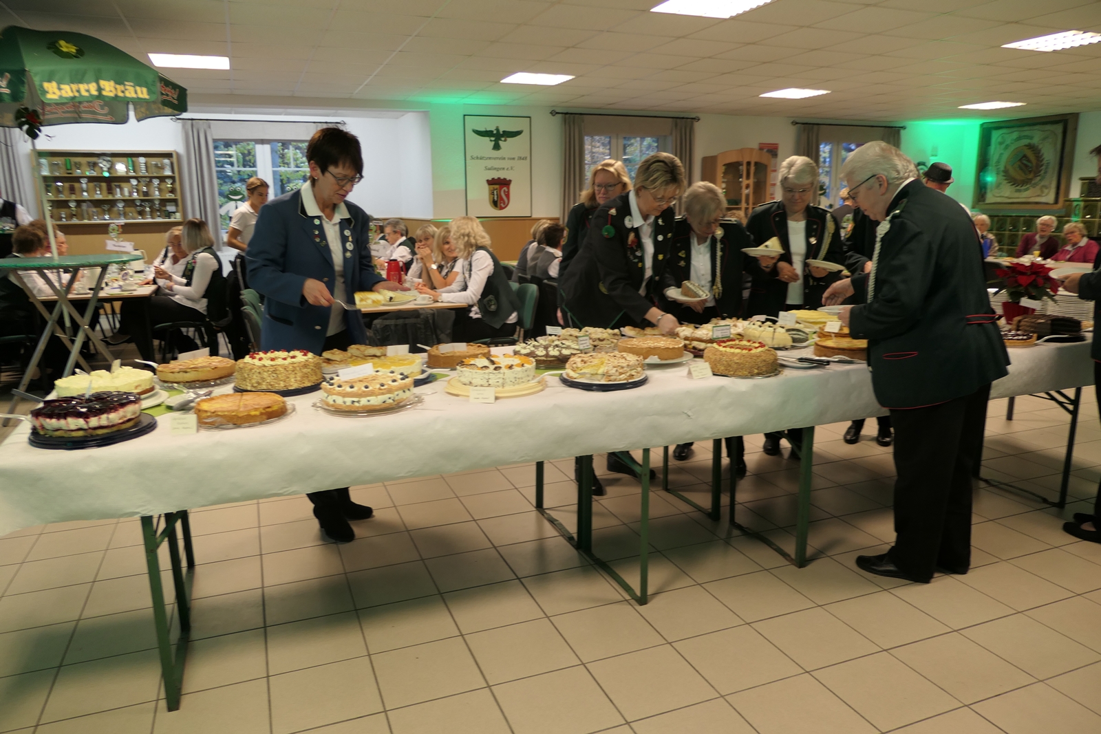 Das tolle, reichhaltige Kuchenbuffet war dann das Ziel aller. Die 1848er Schützenbrüder mit Melone und „Fliege“ ausgestattet, hatten das Zepter für die Bedienung in der Hand, ein kurzer Wink von den Damen mit ihrer „Ützen-Kelle“ und sie brachten die gewünschten Getränke.