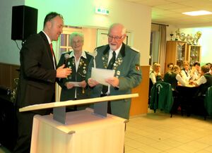 Als besonderer Überraschungsgast, was das "Mitbringsel" anbelangt, bat Carsten Dick von der Kreissparkasse Sulingen um Gehör. Er hatte für Schatzmeister Friedel Immoor die Zusage mitgebracht, dass der Sulinger Verein eine Spende von 1050€ aus der Ausschüttung der Zweckerträge aus der Lotterie "Sparen u. Gewinnen" für die Anschaffung einer Lichtpunktpistole für die Schützenjugend erhält.