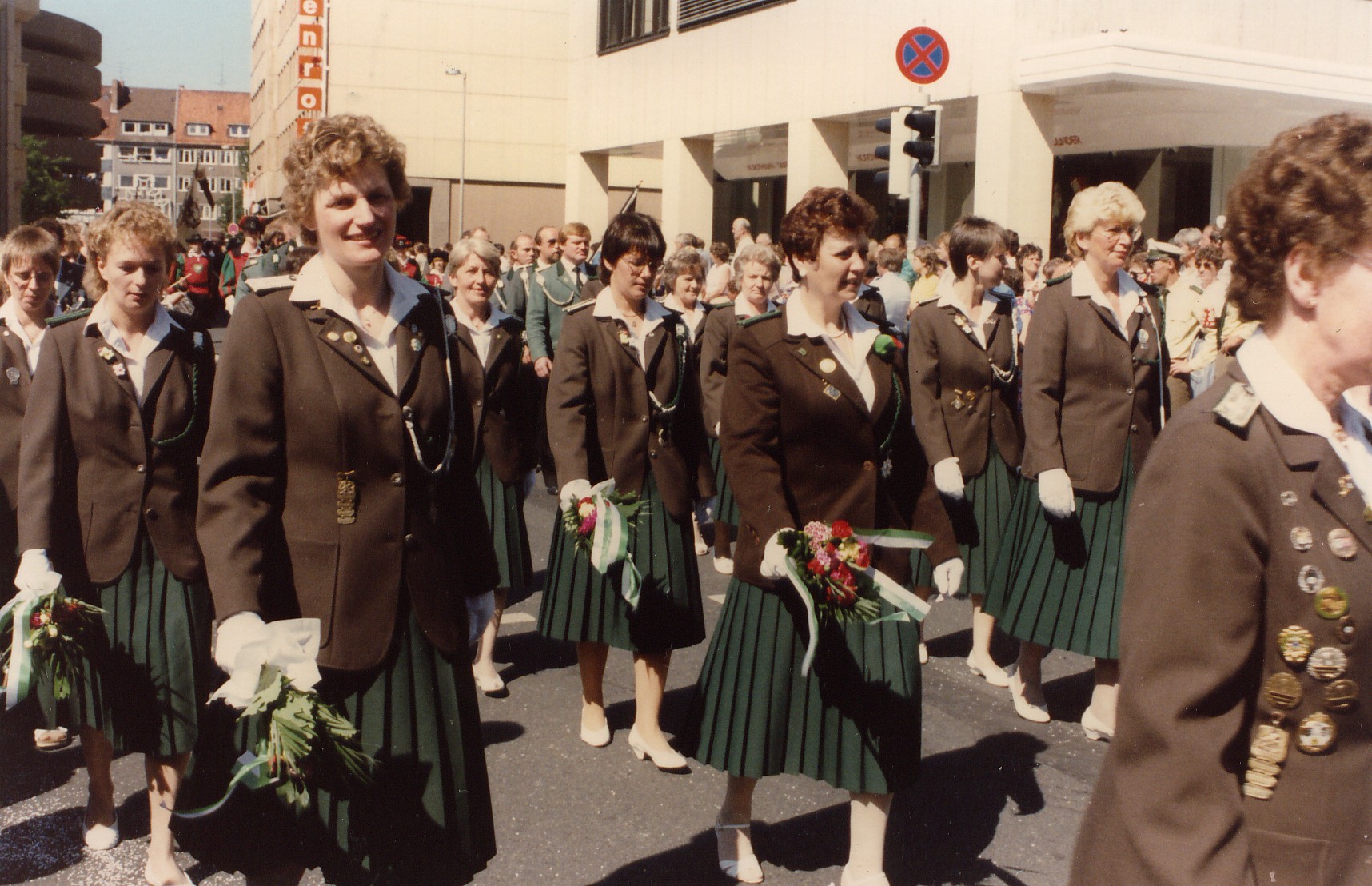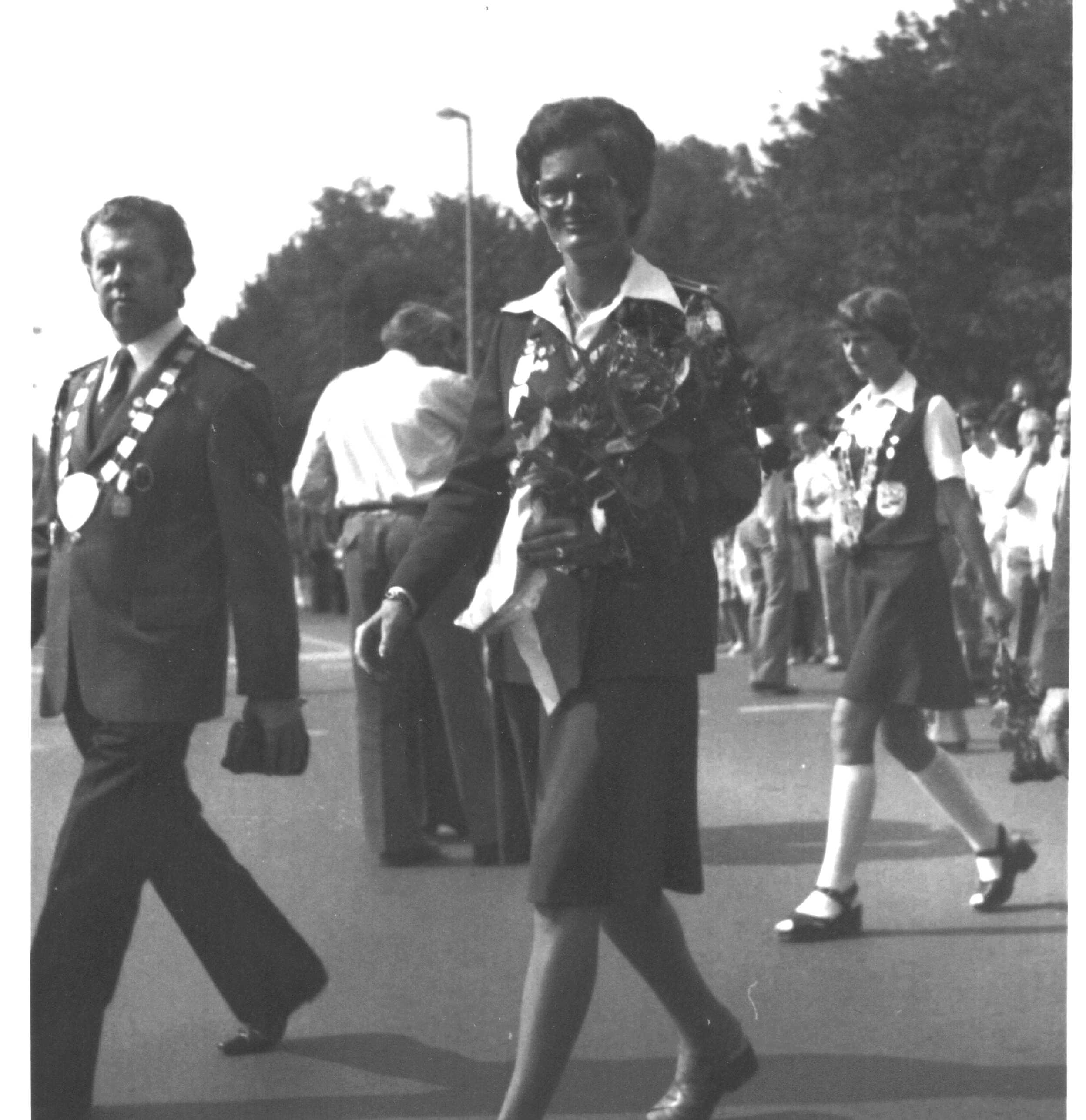 Mit der „Tracht“ - weiße Bluse und grünem Rock - natürlich Mini – waren sie erstmals beim Schützenfestumzug in 1969 dabei (siehe Foto). 1971 beschlossen die Damen, in Zukunft mit einem braunen Blazer aufzutreten, unter dem Motto, was gegen Kälte gut ist, passt auch im Sommer.