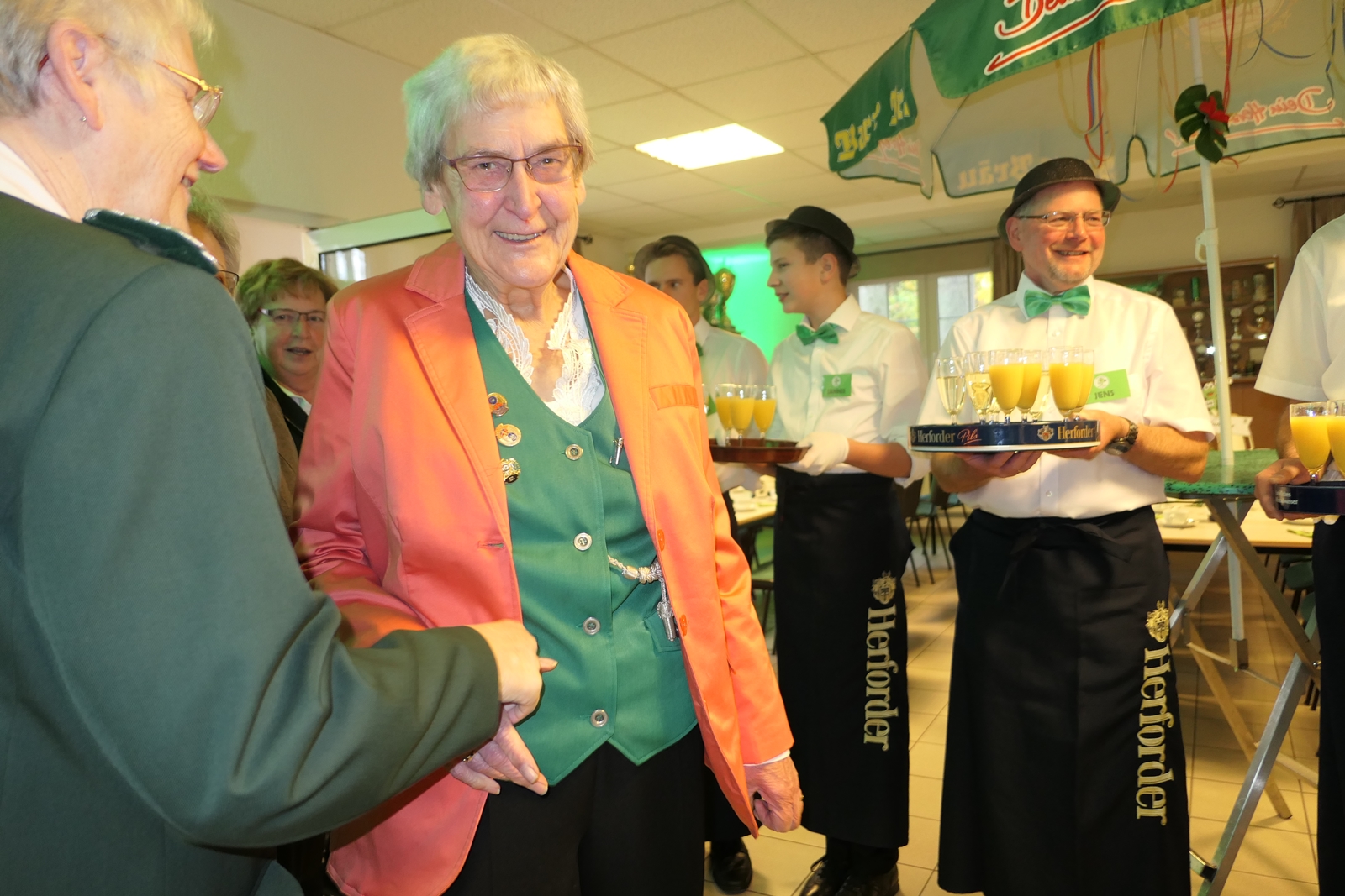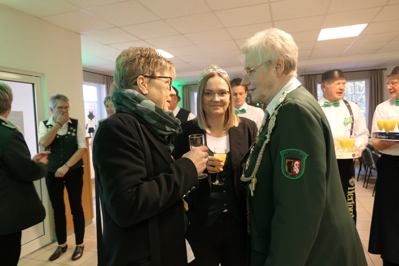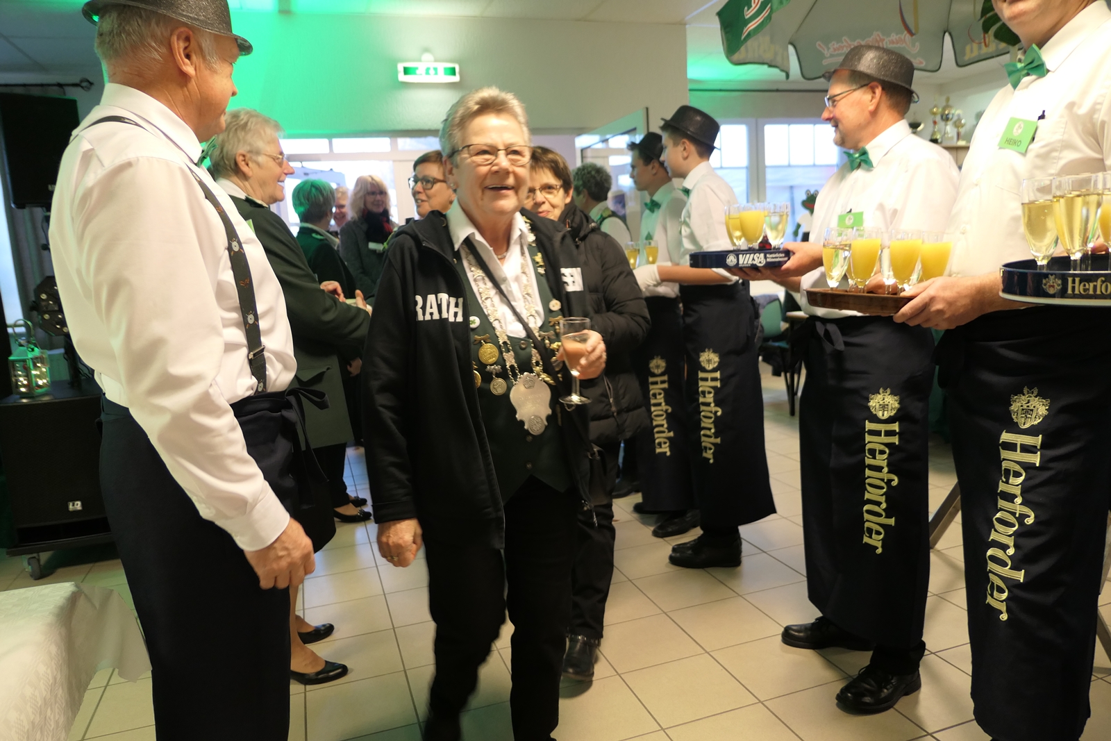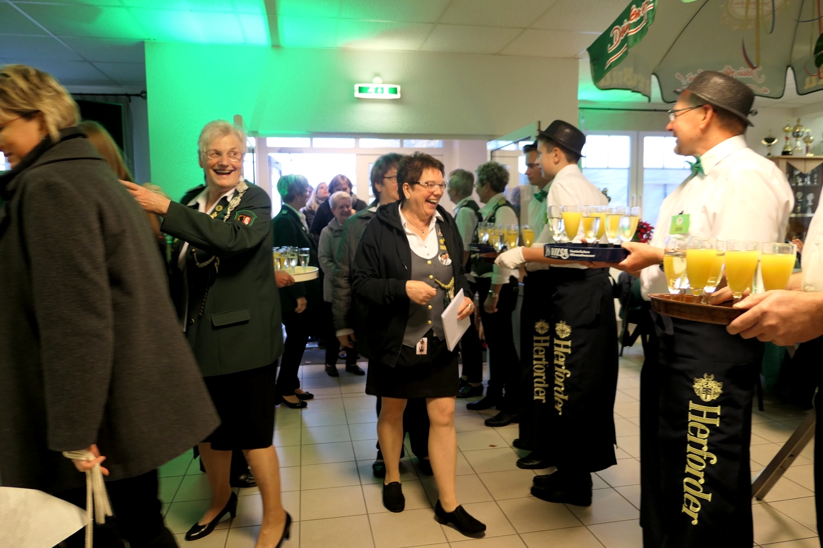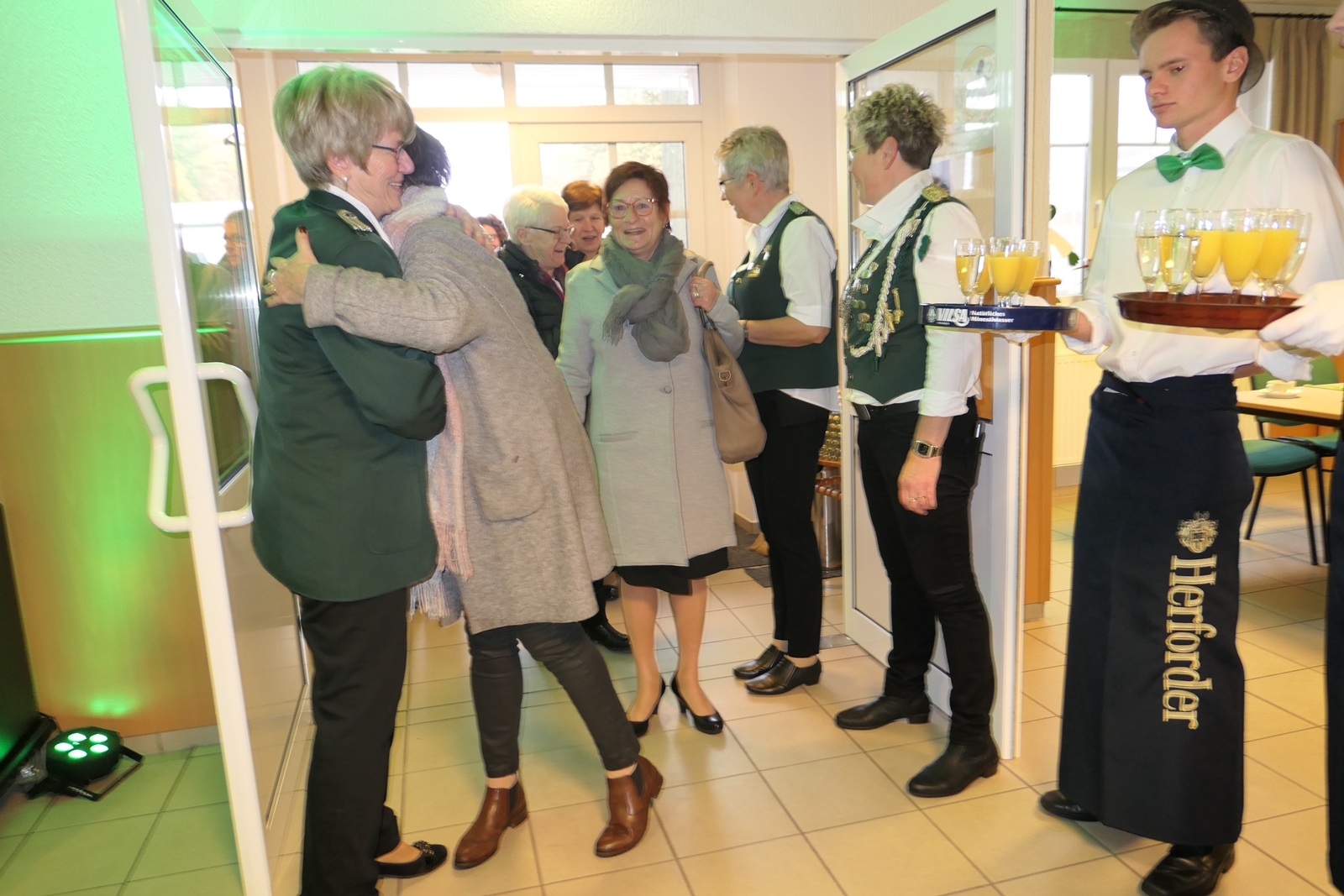Die Glückwünsche zum Jubiläum der 1848er Damen, wurden von Königin Bianca Müller, Herta Ehlers, Hildegard Aufderhardt und Marlies Immoor-Koopmann entgegengenommen. Das Willkommensgetränk reichten Schützen, vornehm gekleidet mit Melone u. grüner Fliege, den eintreffenden Gästen.