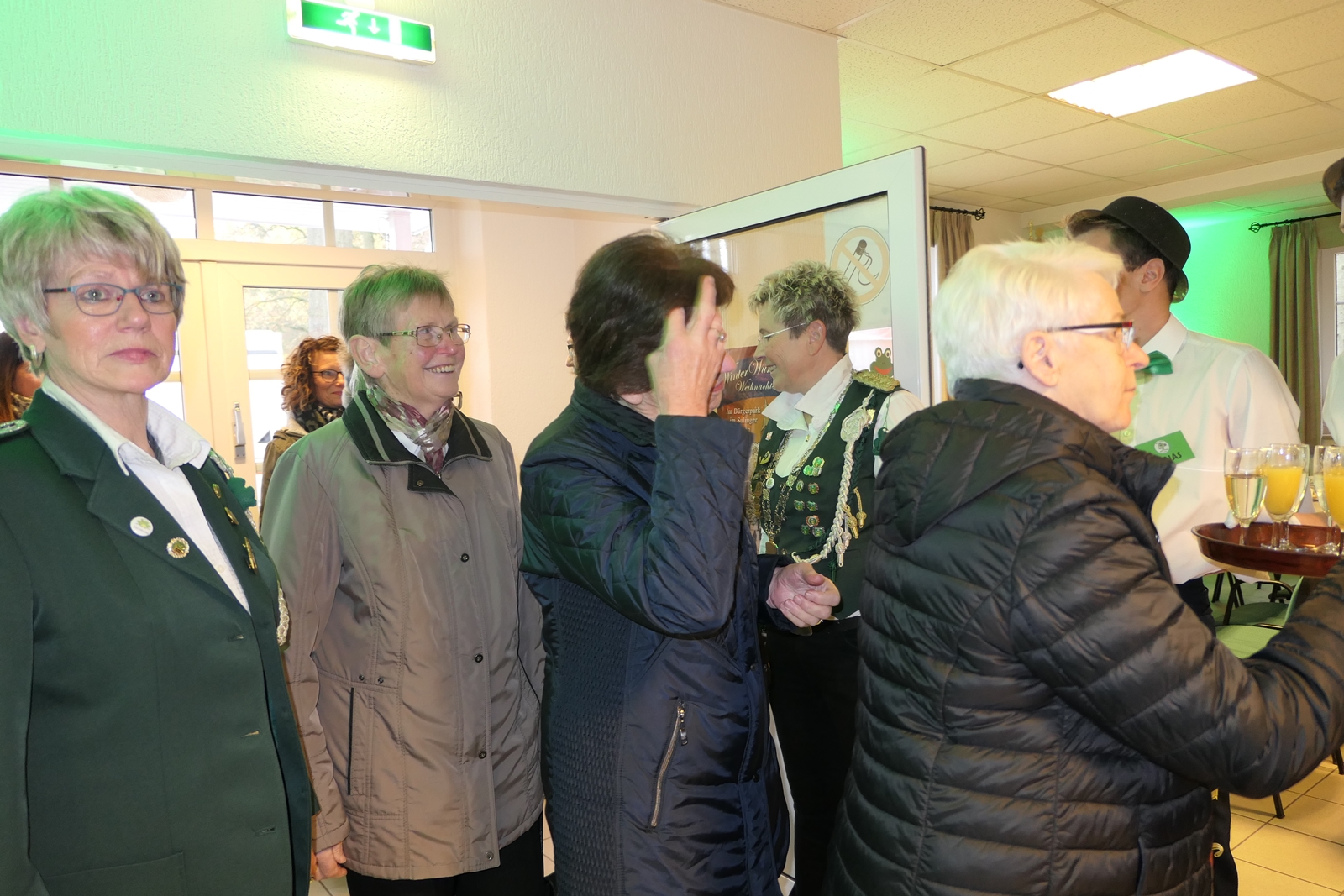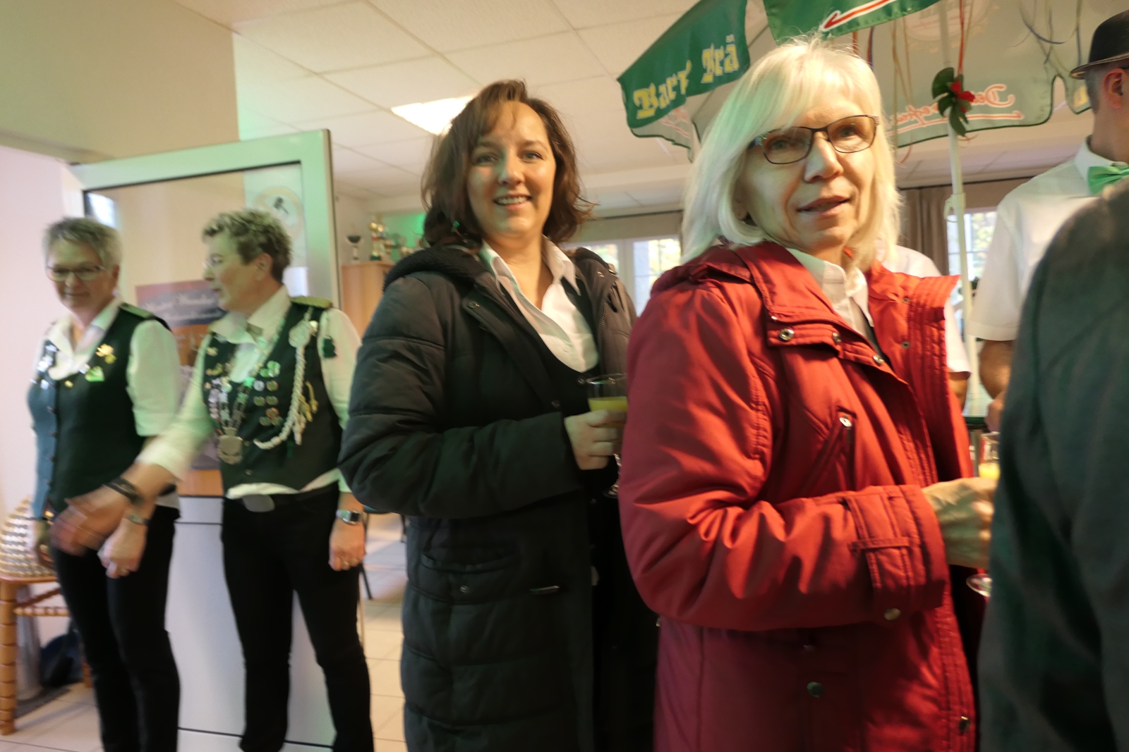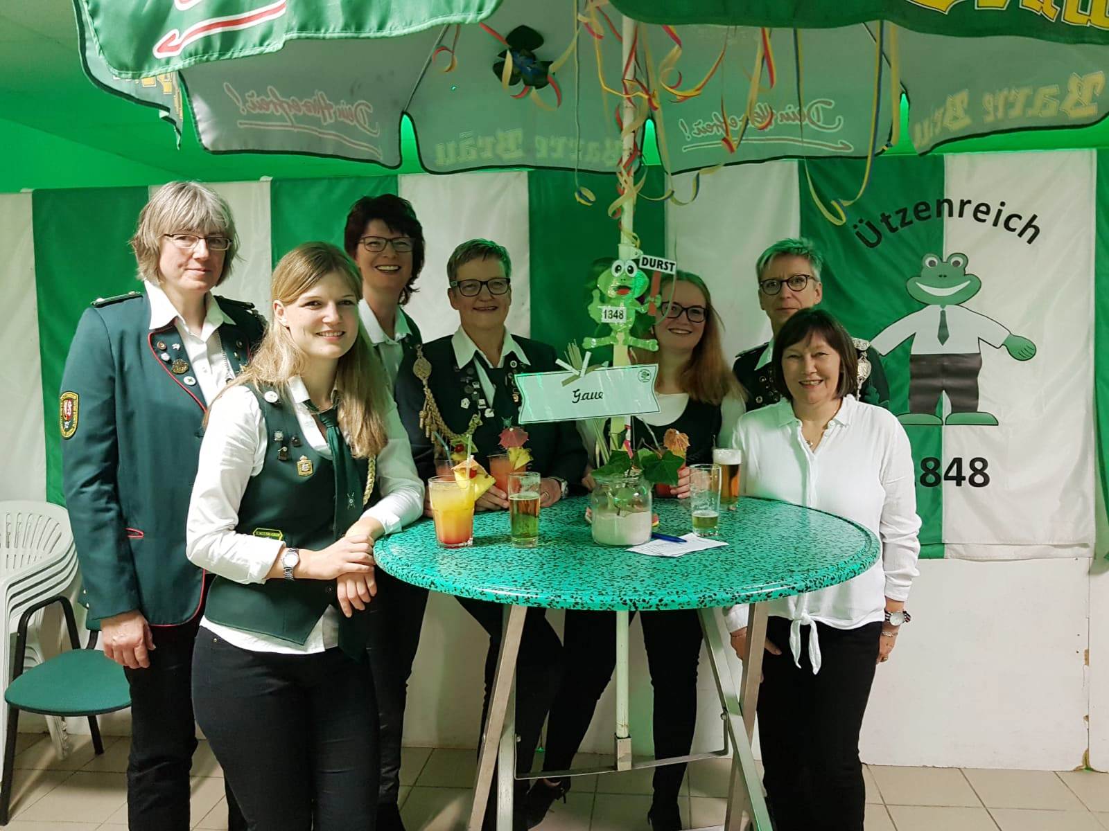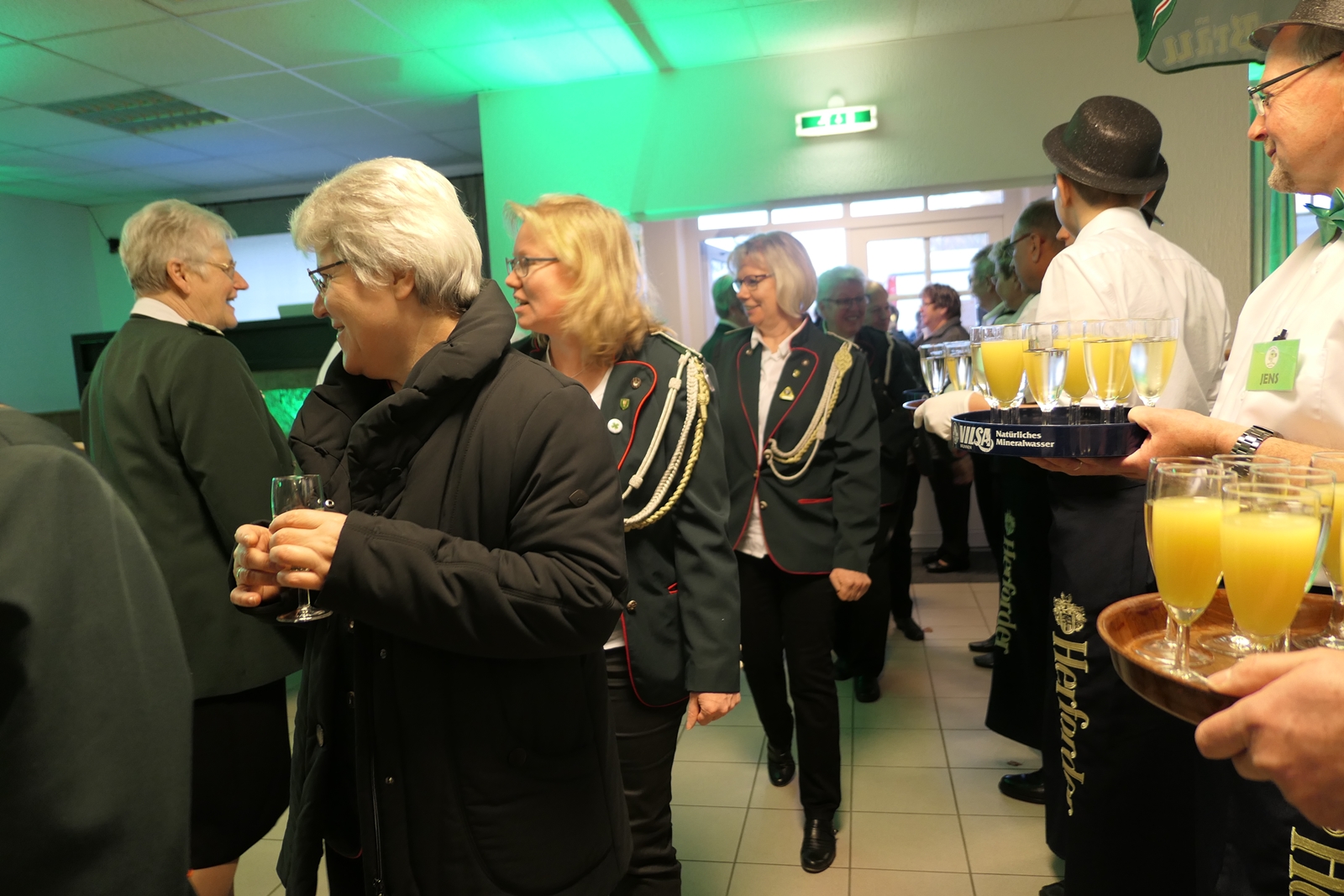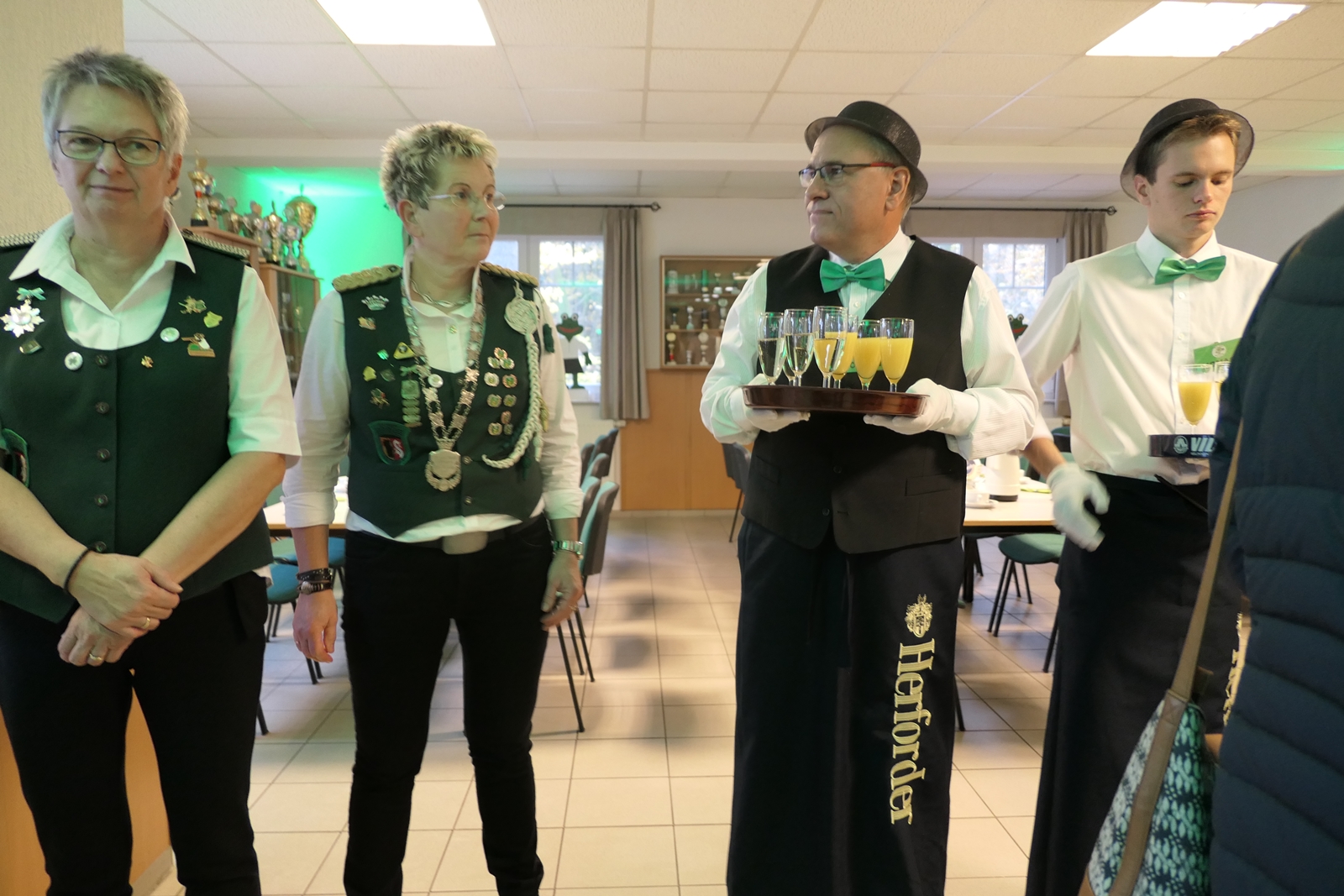 Die Glückwünsche zum Jubiläum der 1848er Damen, wurden von Königin Bianca Müller, Herta Ehlers, Hildegard Aufderhardt und Marlies Immoor-Koopmann entgegengenommen. Das Willkommensgetränk reichten Schützen, vornehm gekleidet mit Melone u. grüner Fliege, den eintreffenden Gästen.