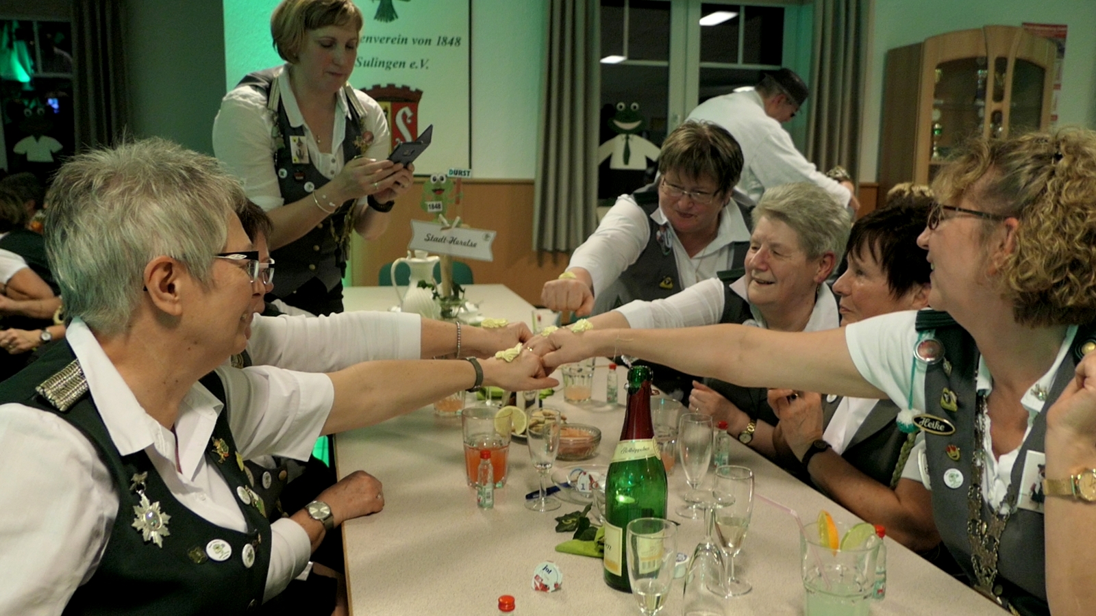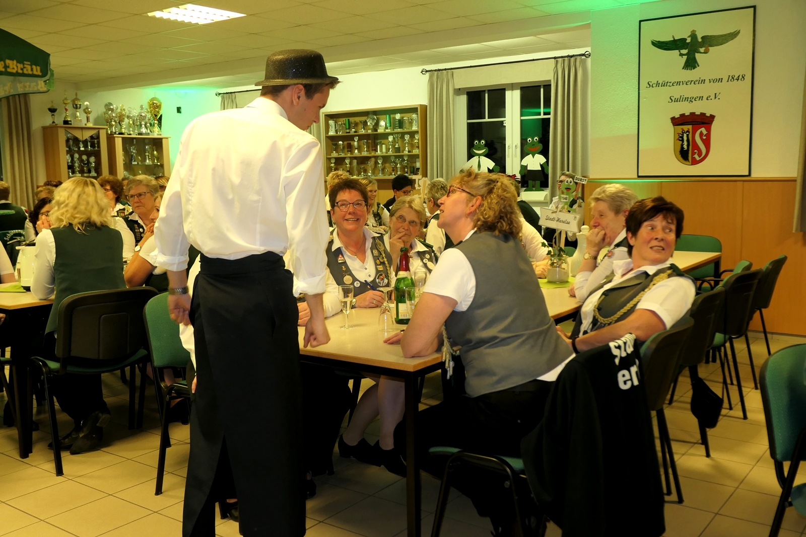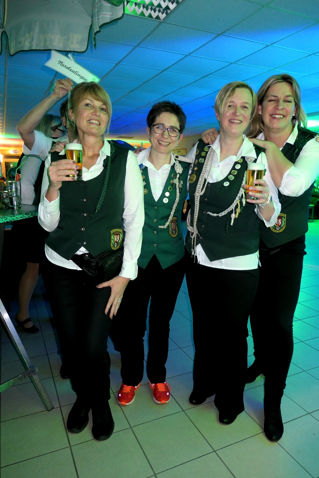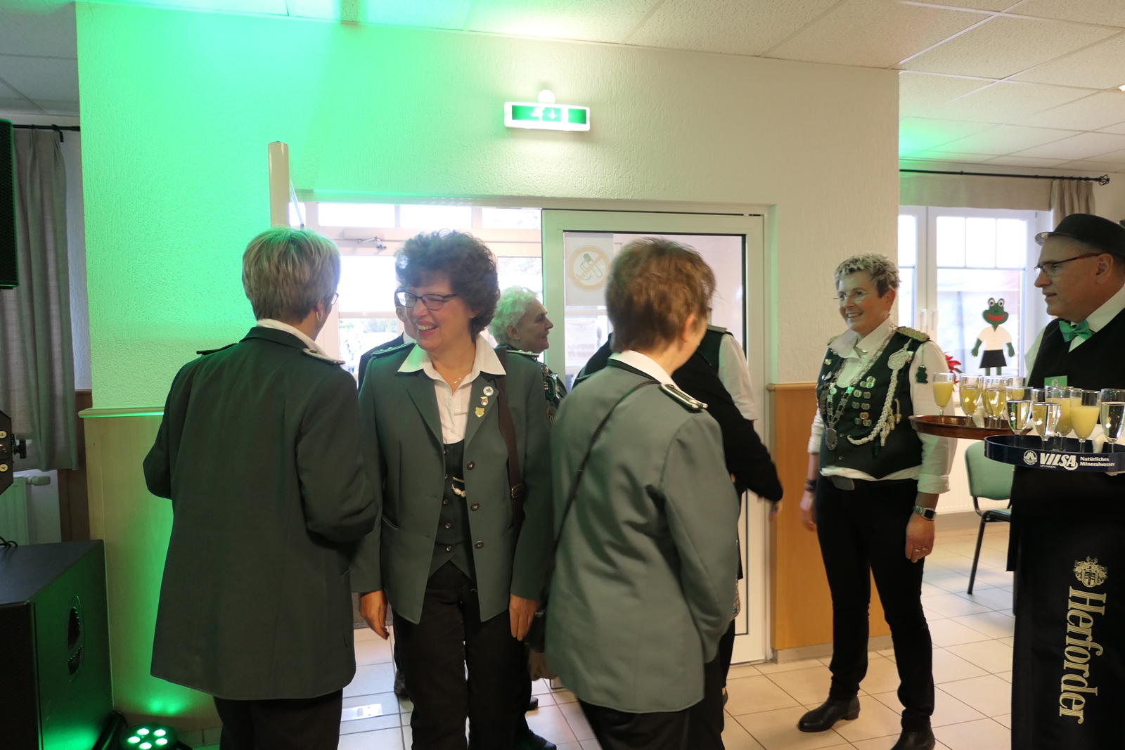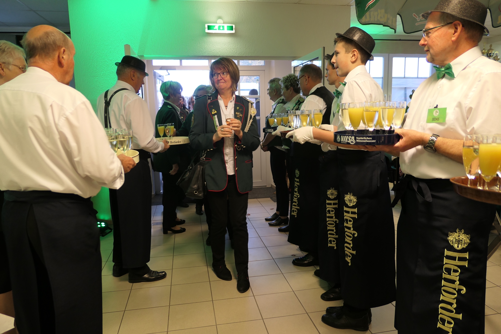 Die Glückwünsche zum Jubiläum der 1848er Damen, wurden von Königin Bianca Müller, Herta Ehlers, Hildegard Aufderhardt und Marlies Immoor-Koopmann entgegengenommen. Das Willkommensgetränk reichten Schützen, vornehm gekleidet mit Melone u. grüner Fliege, den eintreffenden Gästen.