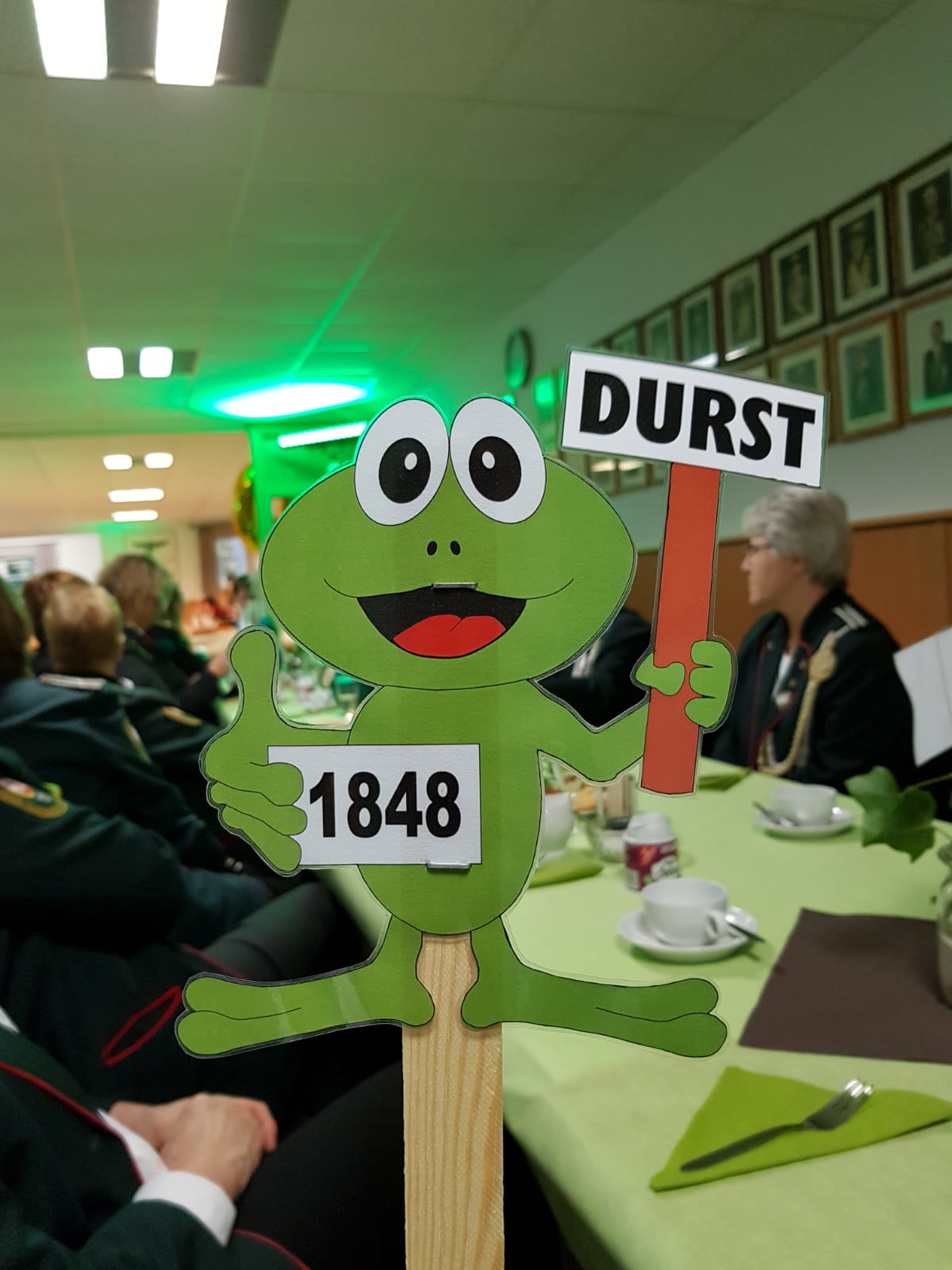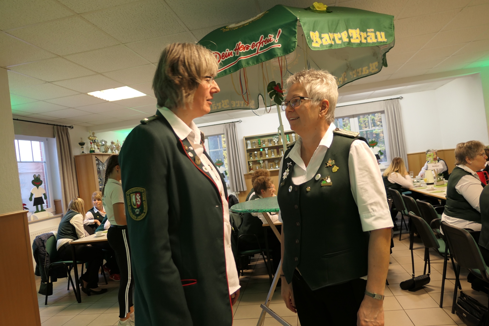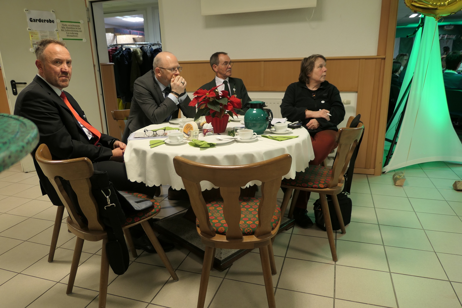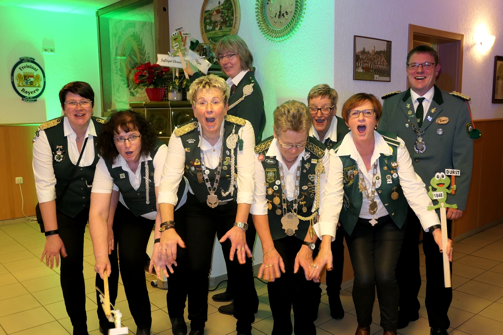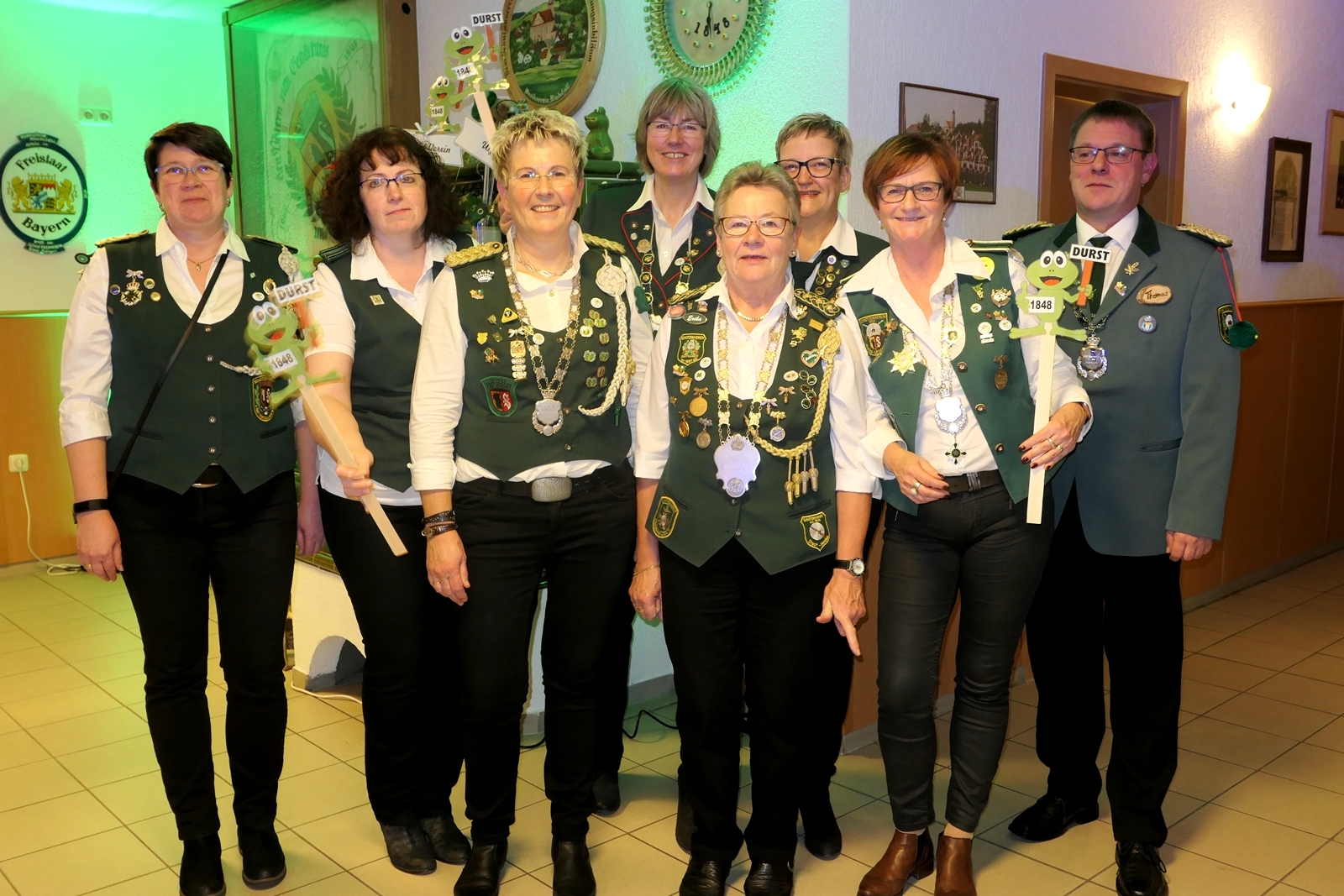 Die Glückwünsche zum Jubiläum der 1848er Damen, wurden von Königin Bianca Müller, Herta Ehlers, Hildegard Aufderhardt und Marlies Immoor-Koopmann entgegengenommen. Das Willkommensgetränk reichten Schützen, vornehm gekleidet mit Melone u. grüner Fliege, den eintreffenden Gästen.