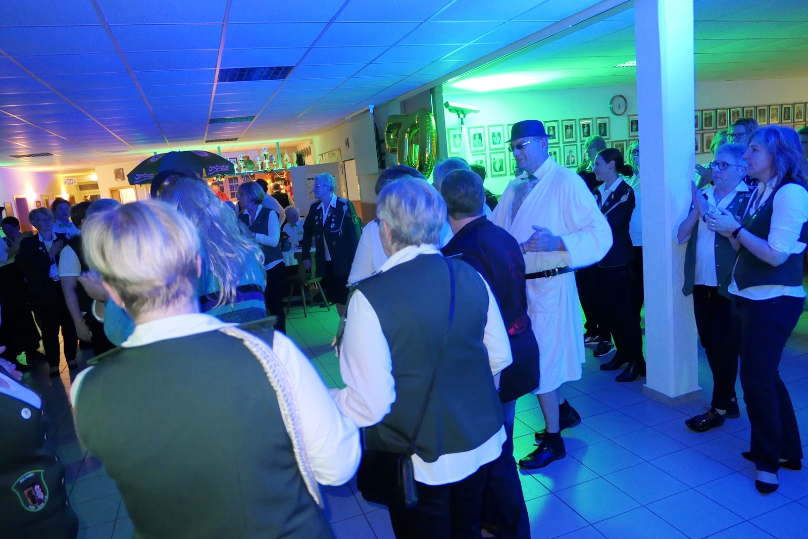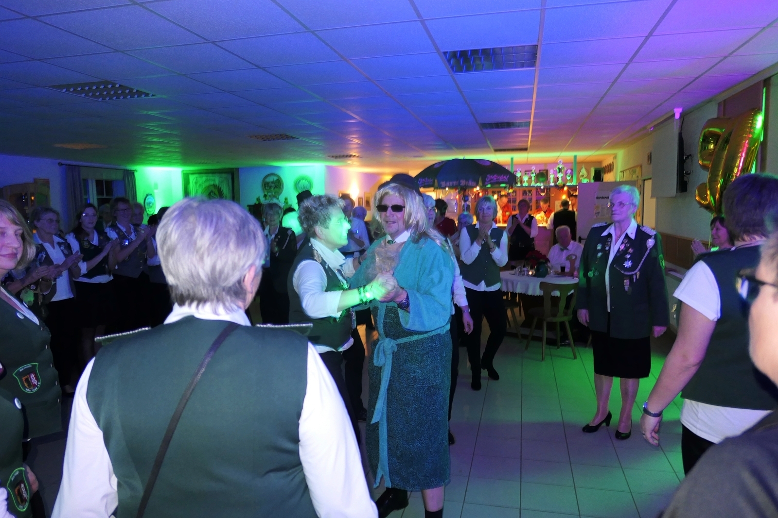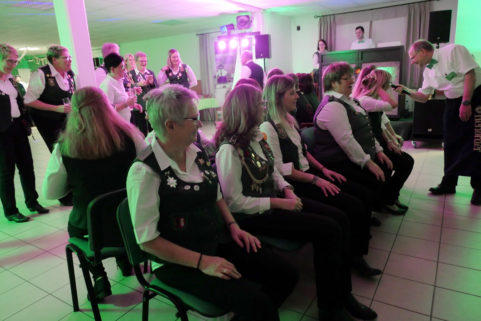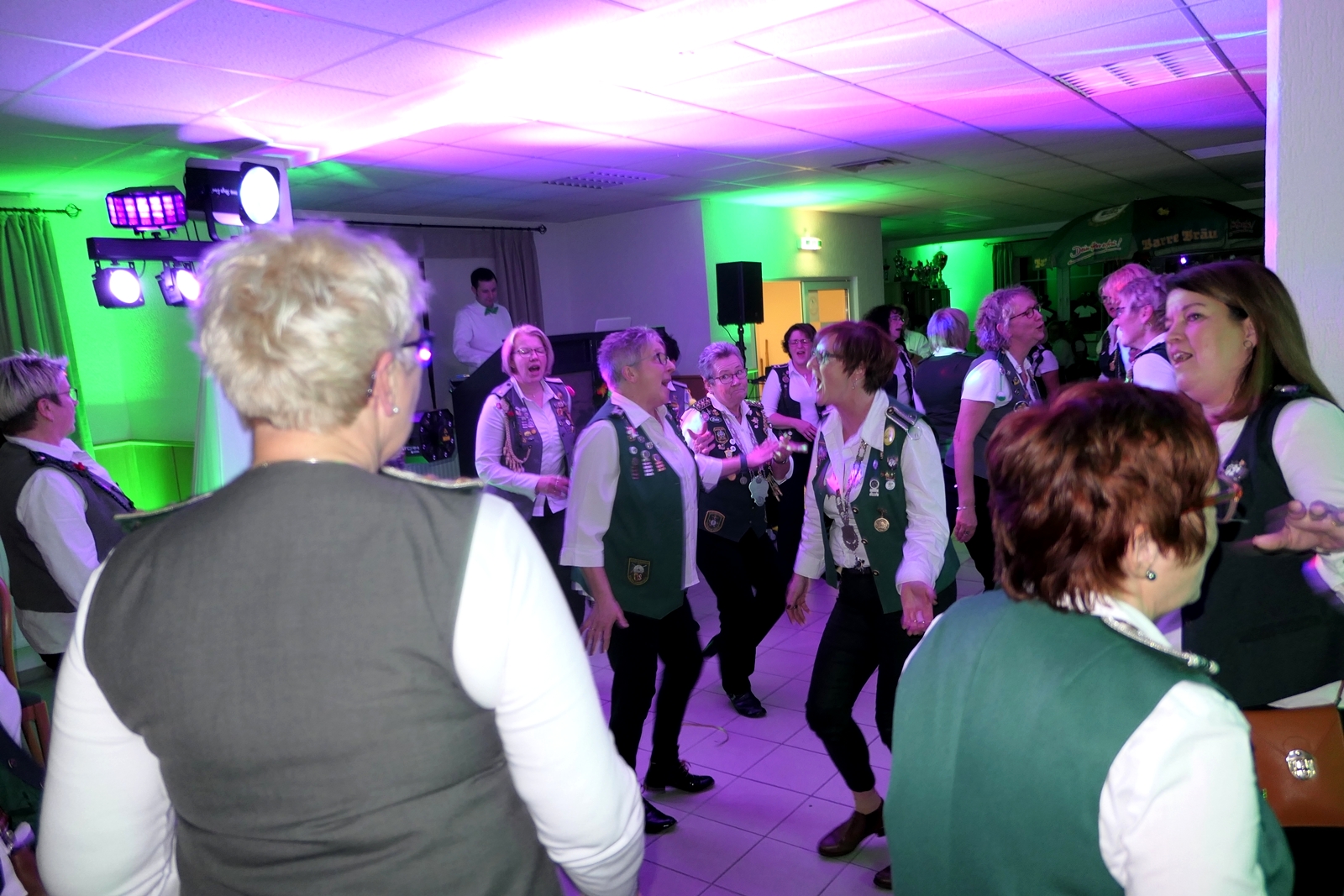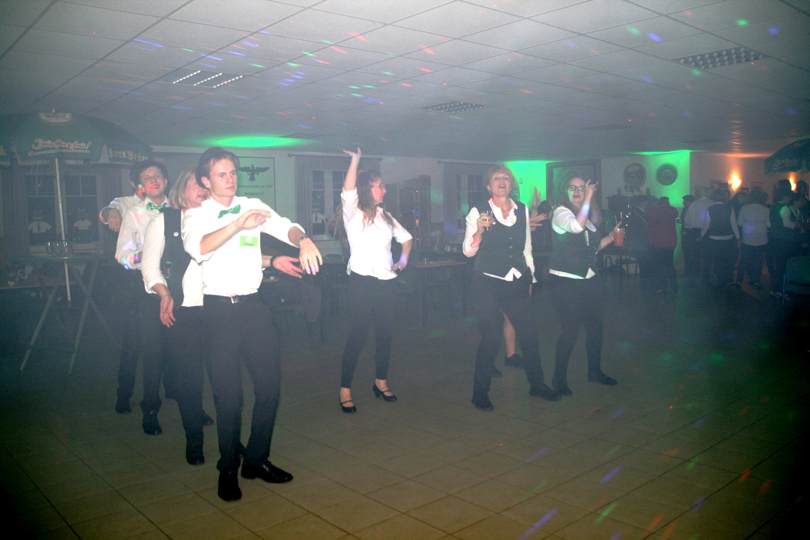 Die „Arbeit“ von DJ Axel Gössele begann mit dem Ehrentanz, die Tanzfläche ganz in grün getaucht, war so der Treffpunkt vieler tanzfreudiger Damen bis weit nach Mitternacht. Dabei erschienen dann auch vier Herren, angezogen mit Bademantel und Sonnenbrille und brachten den Damen Sahne, zu den Klängen des Liedes von Udo Jürgens „Aber bitte mit Sahne!“ auch die „Reise nach Jerusalem“ oder „Limborock“ begeisterte.