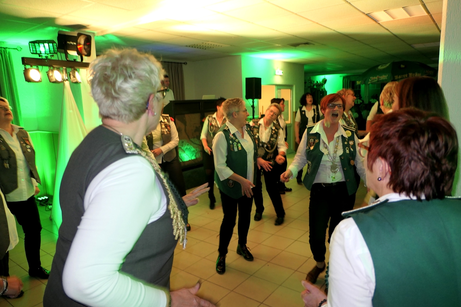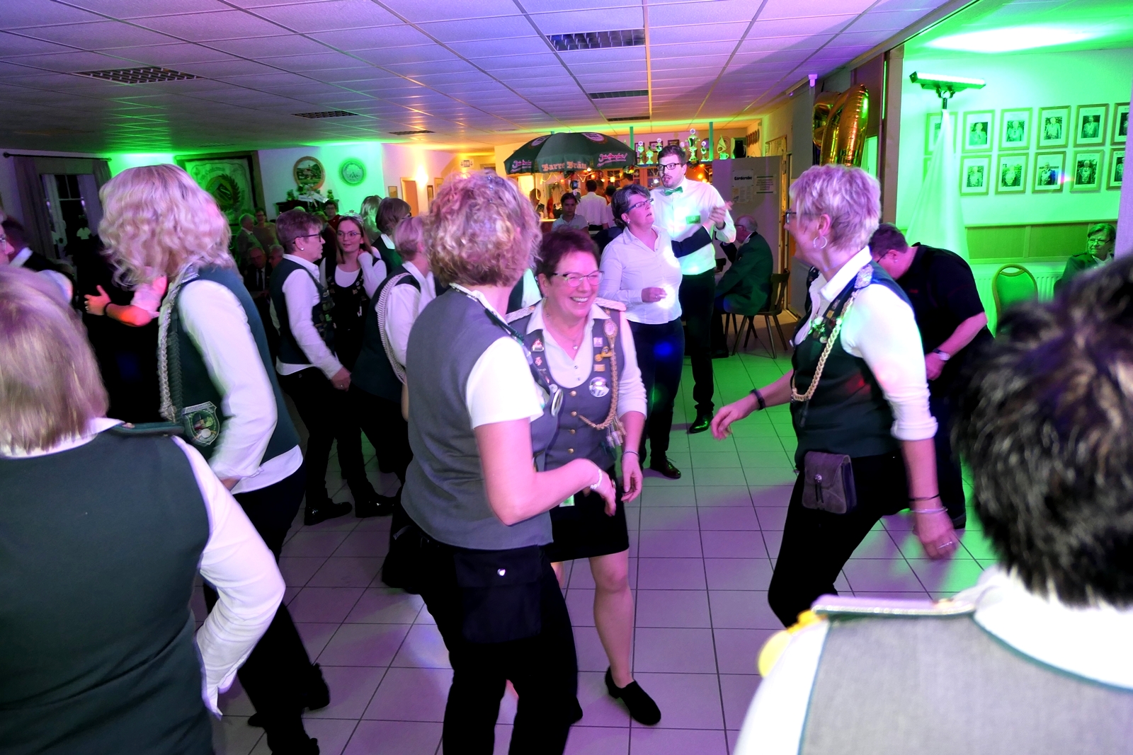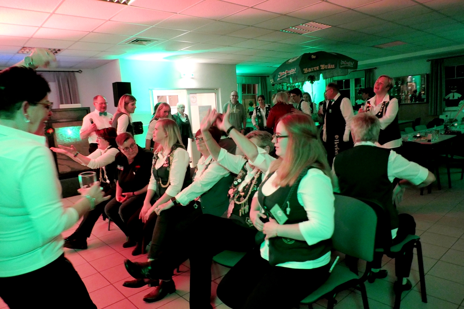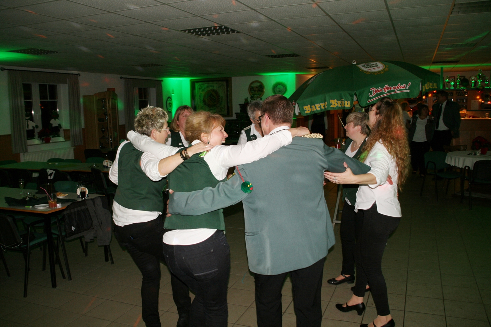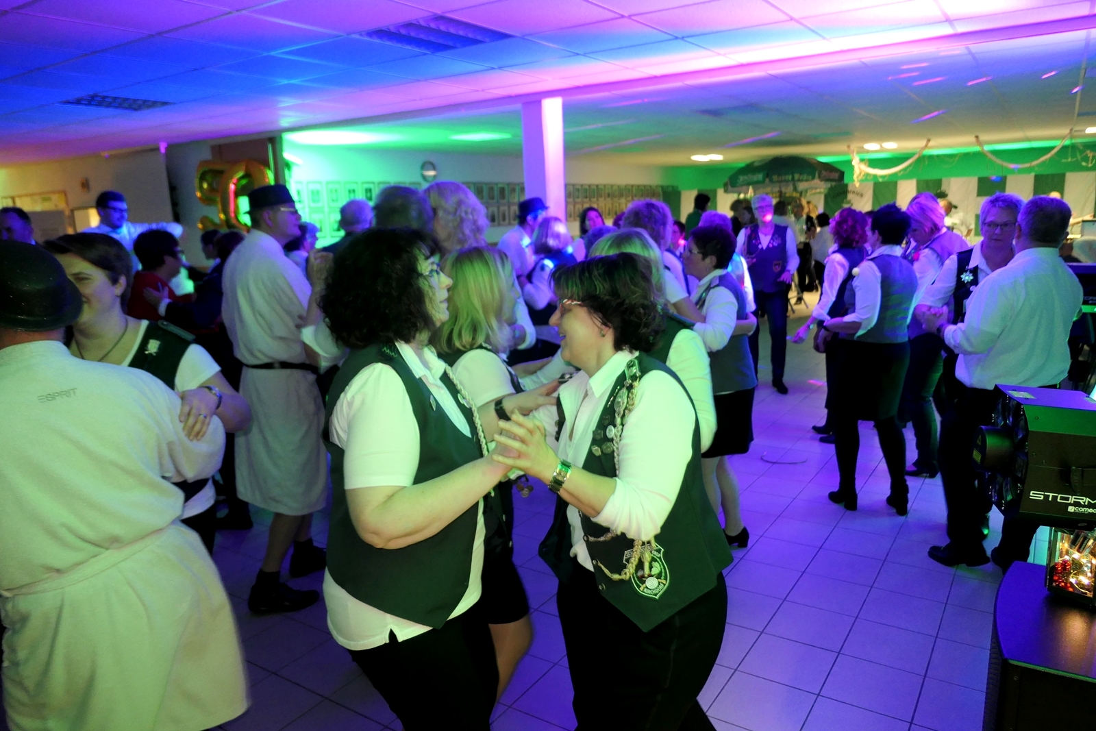 Die „Arbeit“ von DJ Axel Gössele begann mit dem Ehrentanz, die Tanzfläche ganz in grün getaucht, war so der Treffpunkt vieler tanzfreudiger Damen bis weit nach Mitternacht. Dabei erschienen dann auch vier Herren, angezogen mit Bademantel und Sonnenbrille und brachten den Damen Sahne, zu den Klängen des Liedes von Udo Jürgens „Aber bitte mit Sahne!“ auch die „Reise nach Jerusalem“ oder „Limborock“ begeisterte.