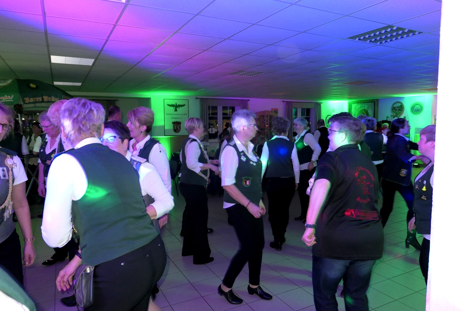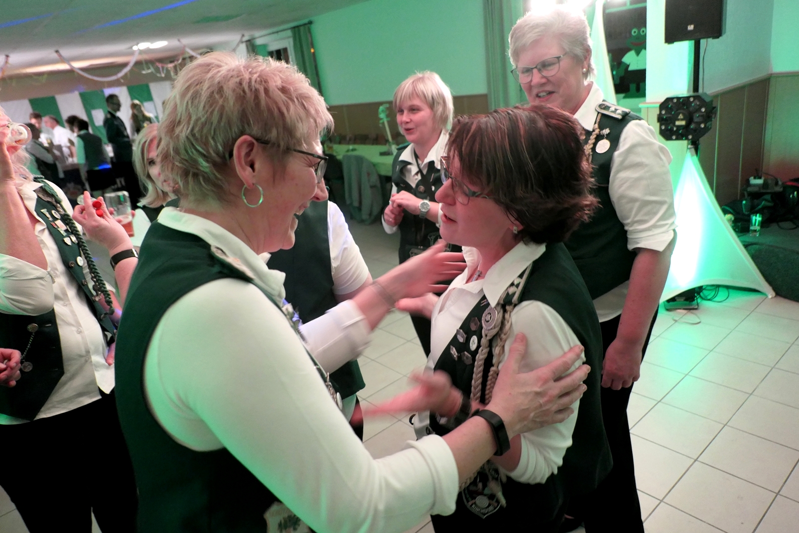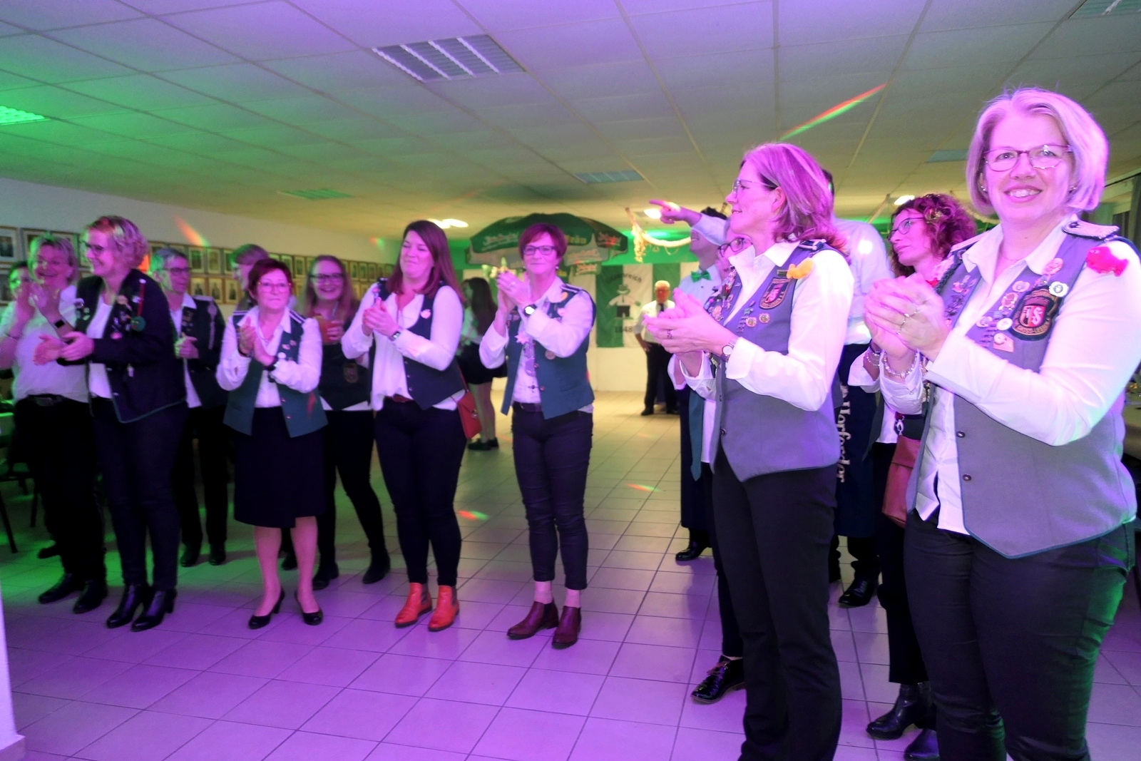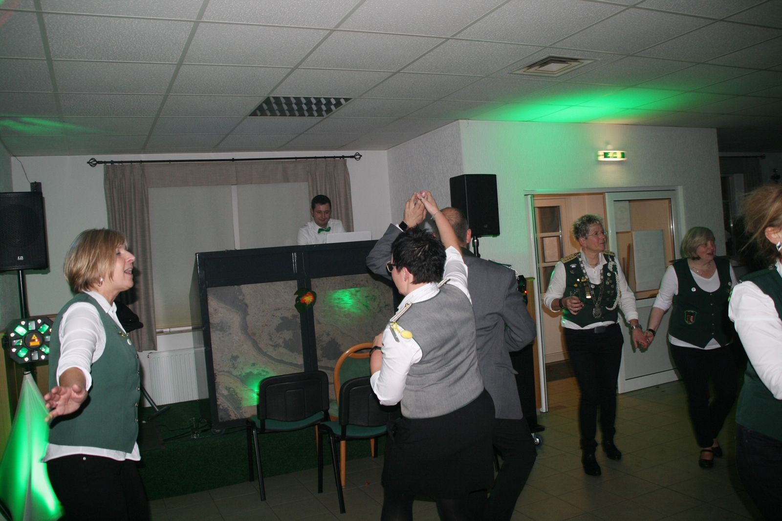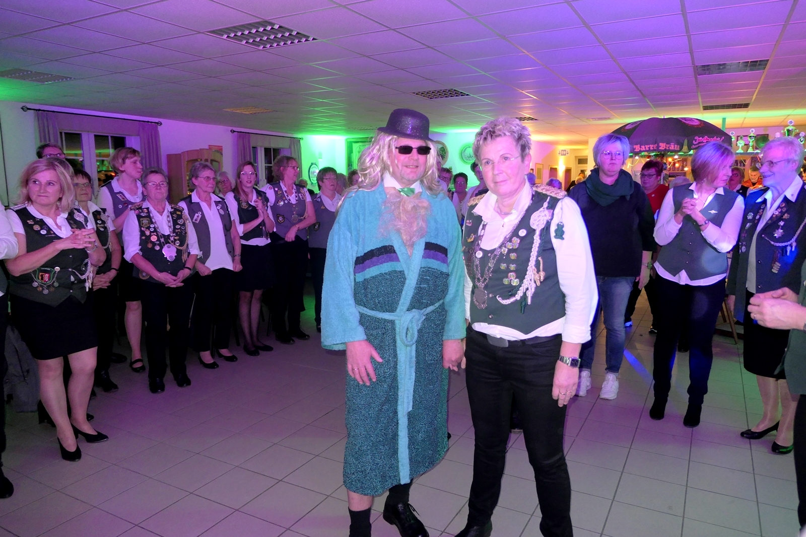 Die „Arbeit“ von DJ Axel Gössele begann mit dem Ehrentanz, die Tanzfläche ganz in grün getaucht, war so der Treffpunkt vieler tanzfreudiger Damen bis weit nach Mitternacht. Dabei erschienen dann auch vier Herren, angezogen mit Bademantel und Sonnenbrille und brachten den Damen Sahne, zu den Klängen des Liedes von Udo Jürgens „Aber bitte mit Sahne!“ auch die „Reise nach Jerusalem“ oder „Limborock“ begeisterte.