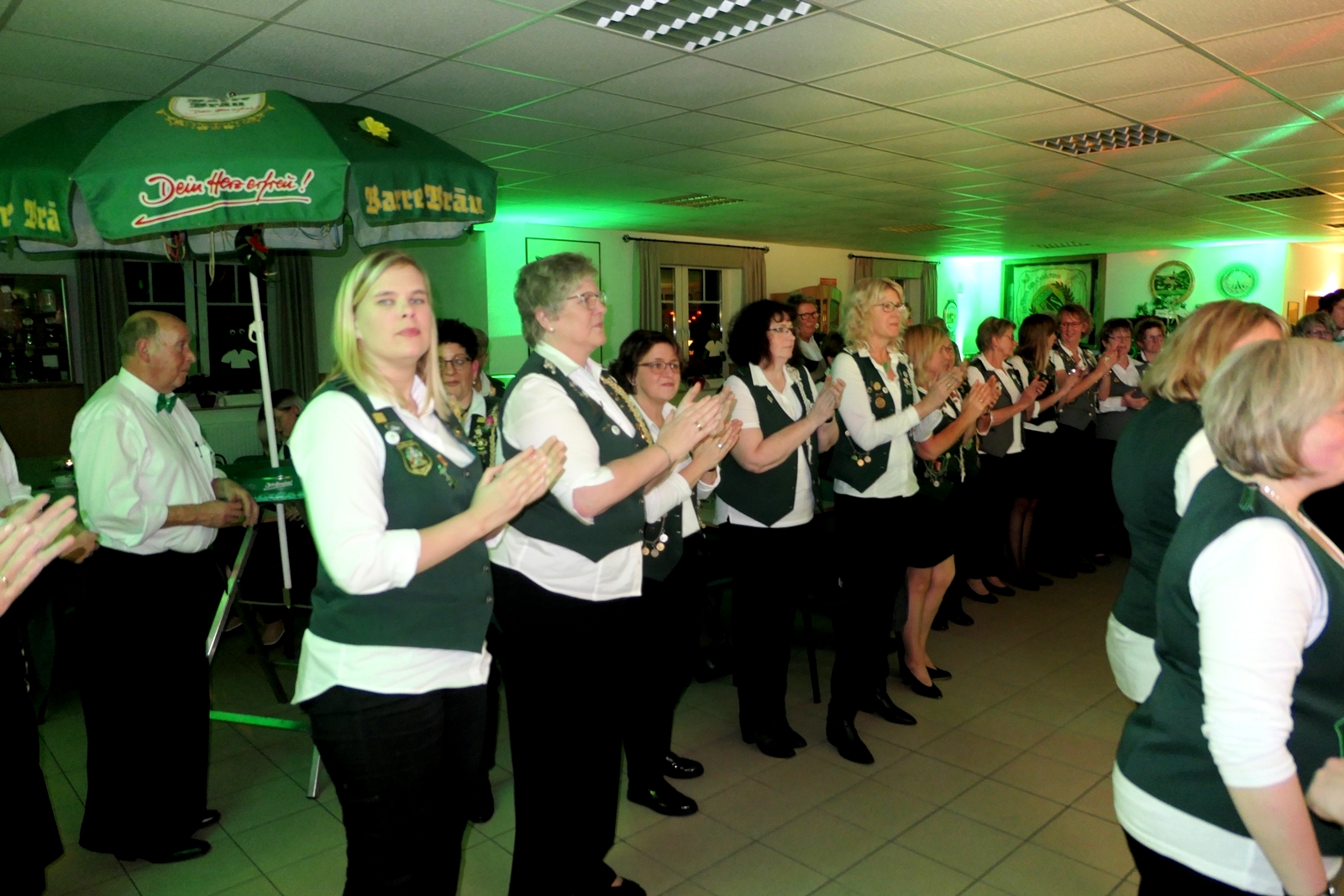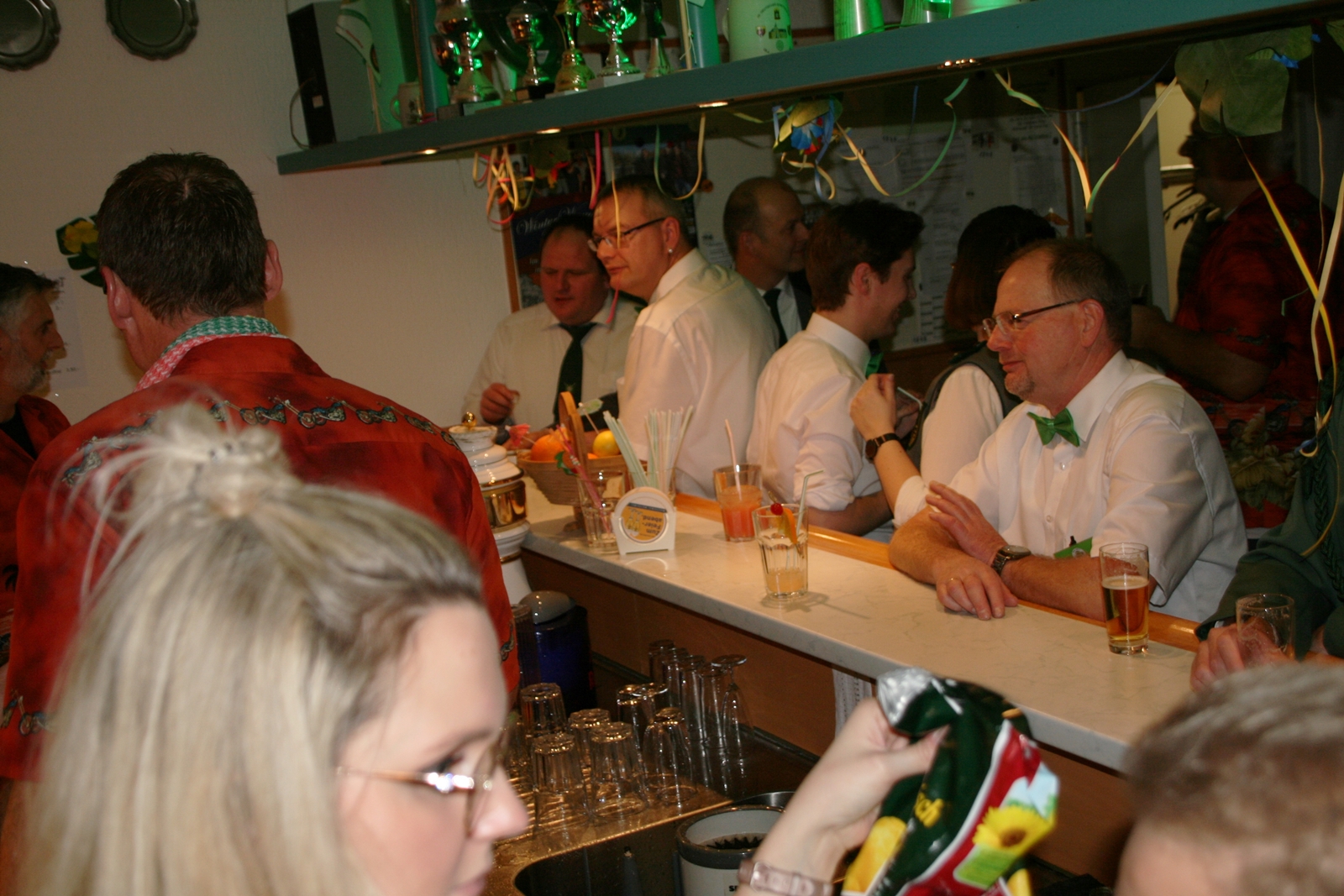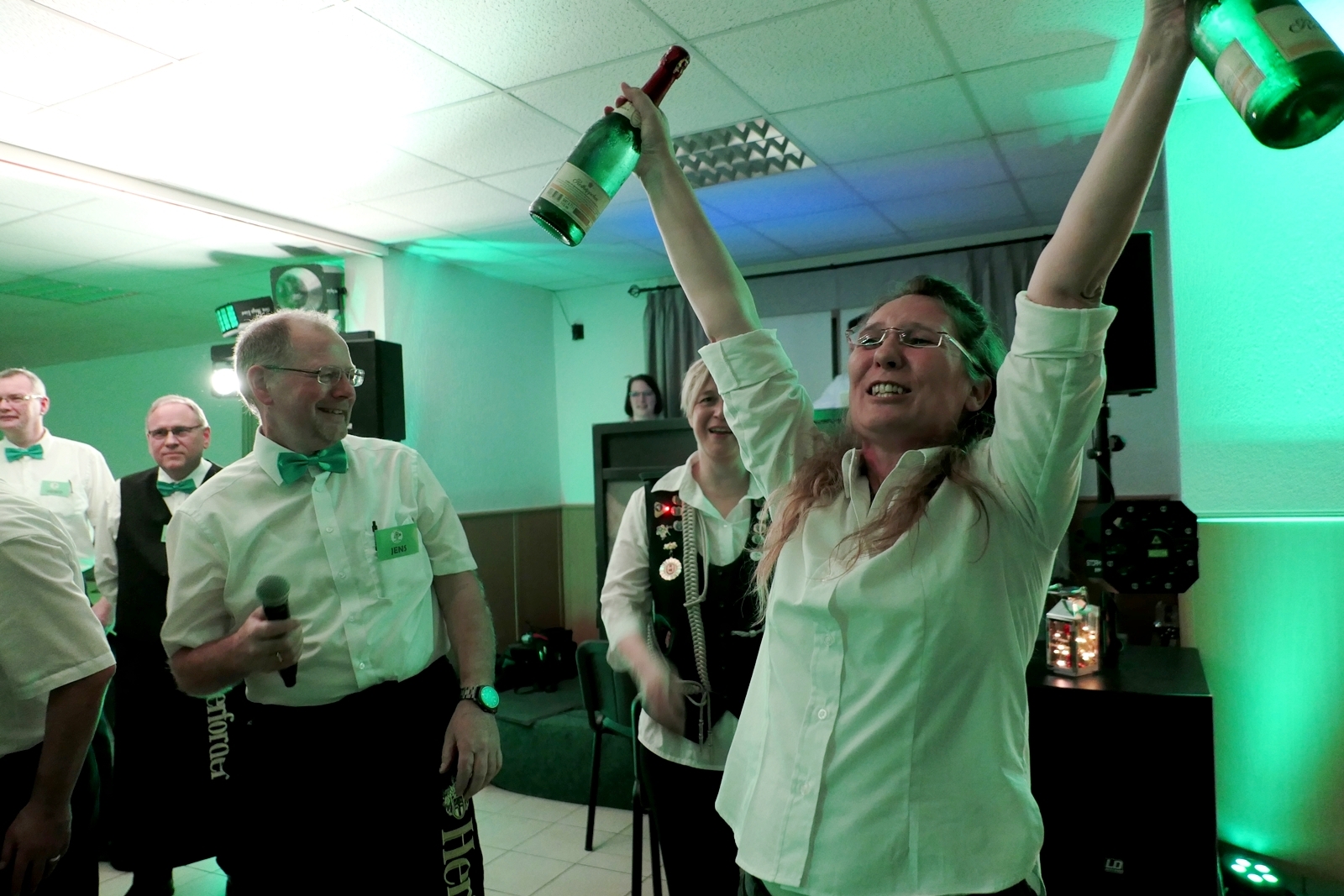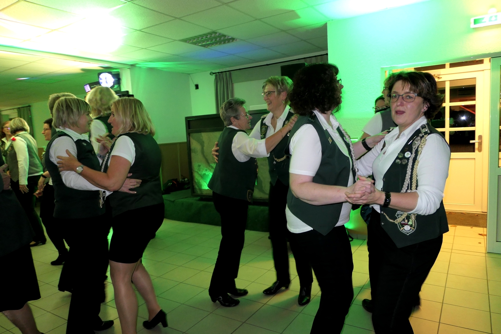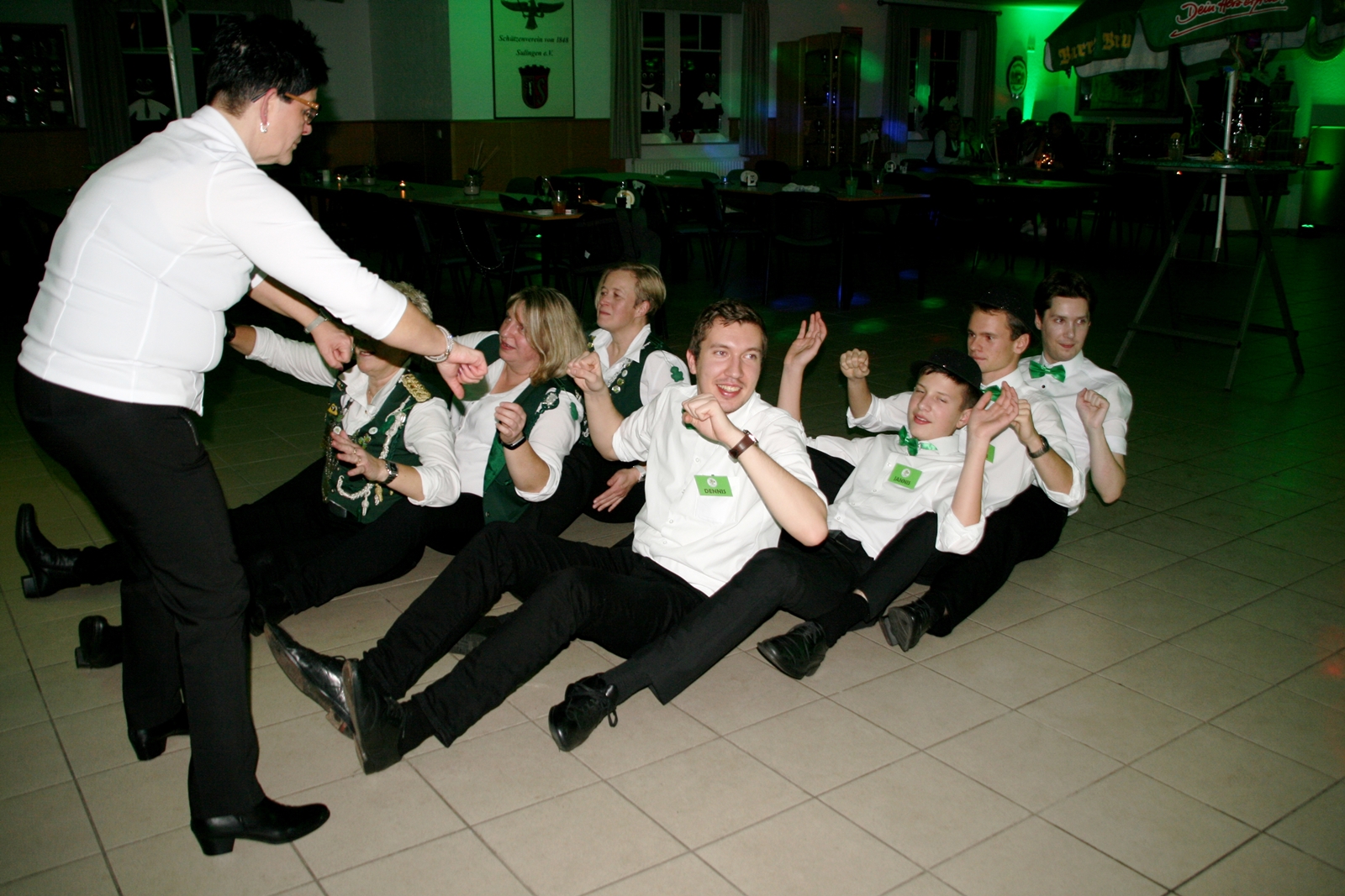 Die „Arbeit“ von DJ Axel Gössele begann mit dem Ehrentanz, die Tanzfläche ganz in grün getaucht, war so der Treffpunkt vieler tanzfreudiger Damen bis weit nach Mitternacht. Dabei erschienen dann auch vier Herren, angezogen mit Bademantel und Sonnenbrille und brachten den Damen Sahne, zu den Klängen des Liedes von Udo Jürgens „Aber bitte mit Sahne!“ auch die „Reise nach Jerusalem“ oder „Limborock“ begeisterte.