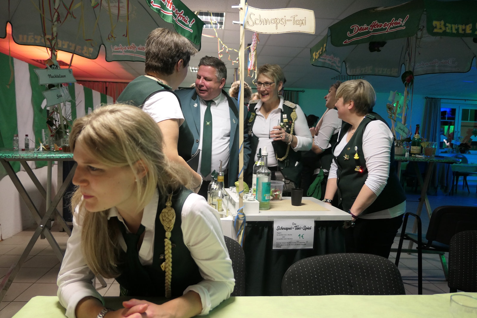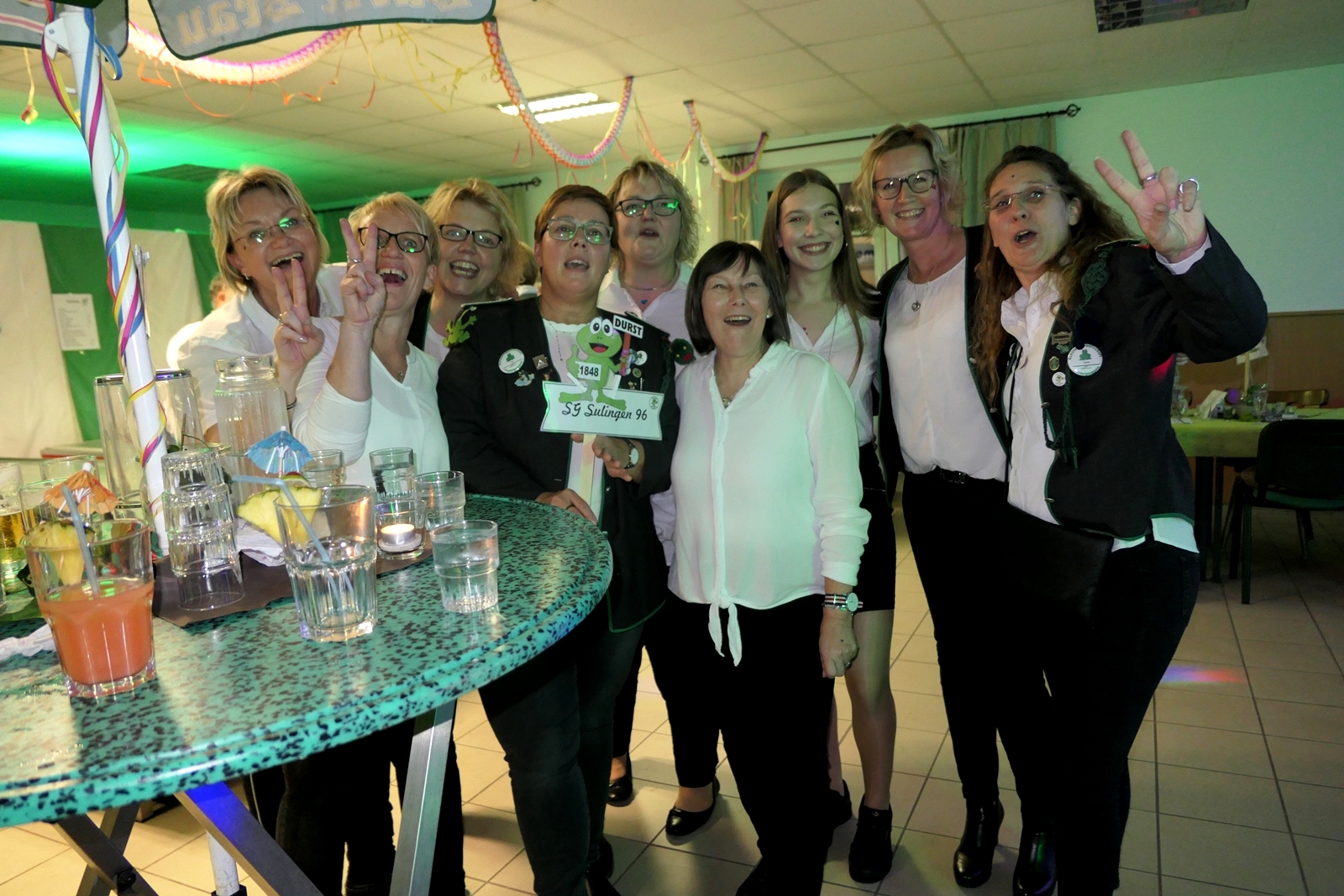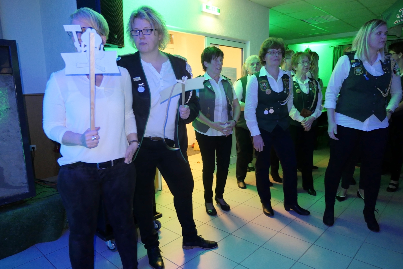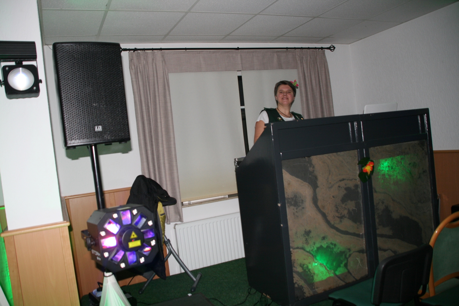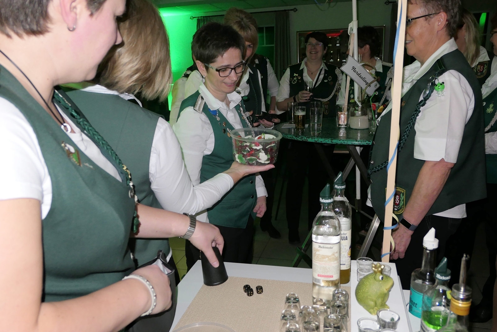 Die „Arbeit“ von DJ Axel Gössele begann mit dem Ehrentanz, die Tanzfläche ganz in grün getaucht, war so der Treffpunkt vieler tanzfreudiger Damen bis weit nach Mitternacht. Dabei erschienen dann auch vier Herren, angezogen mit Bademantel und Sonnenbrille und brachten den Damen Sahne, zu den Klängen des Liedes von Udo Jürgens „Aber bitte mit Sahne!“ auch die „Reise nach Jerusalem“ oder „Limborock“ begeisterte.