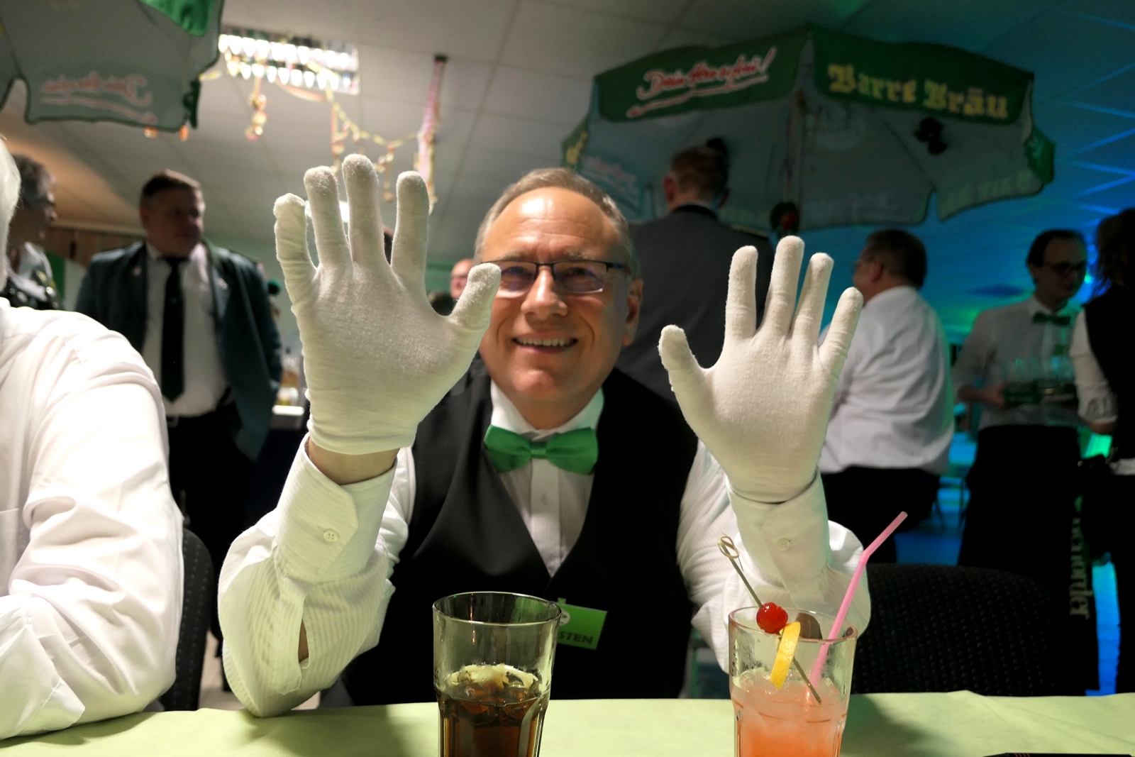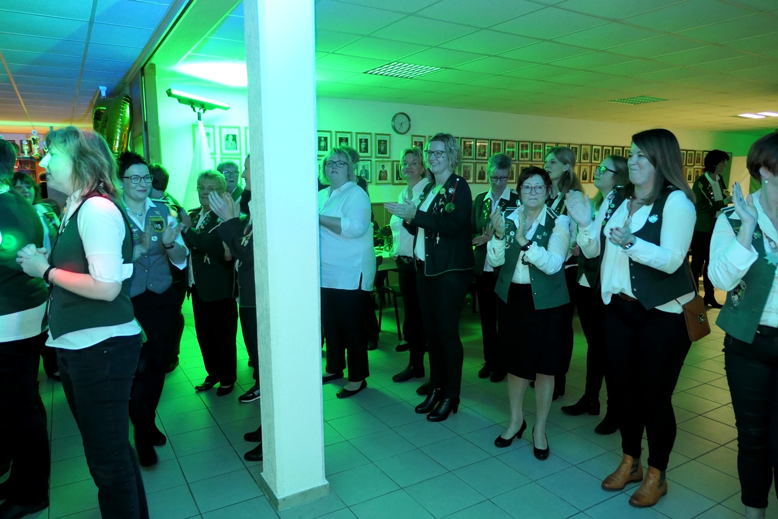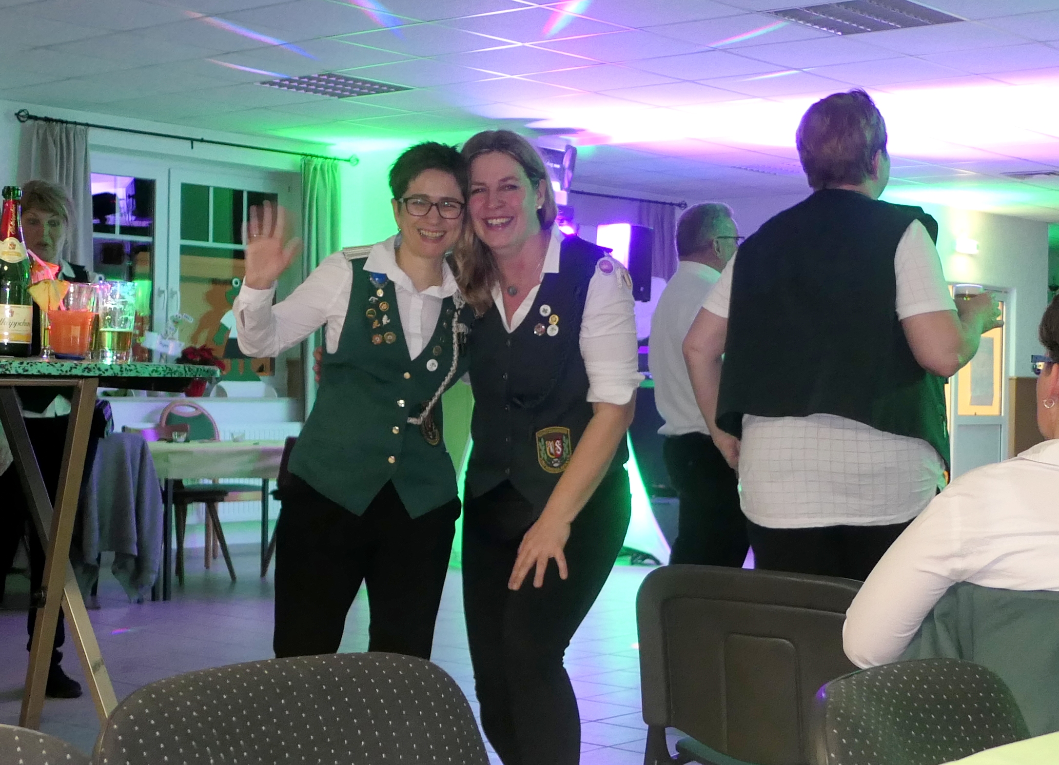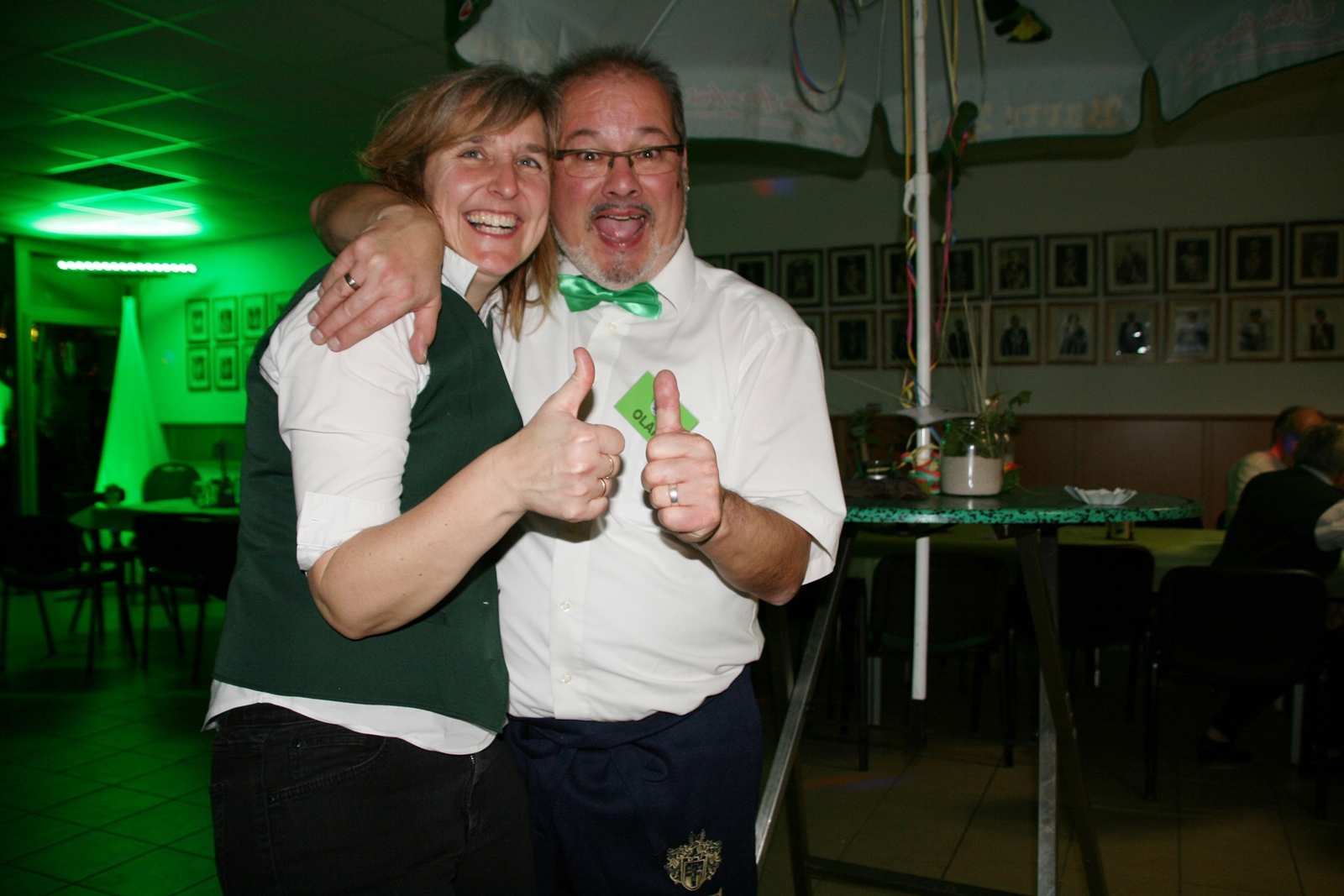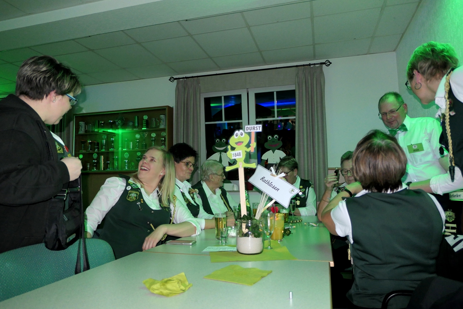 Die „Arbeit“ von DJ Axel Gössele begann mit dem Ehrentanz, die Tanzfläche ganz in grün getaucht, war so der Treffpunkt vieler tanzfreudiger Damen bis weit nach Mitternacht. Dabei erschienen dann auch vier Herren, angezogen mit Bademantel und Sonnenbrille und brachten den Damen Sahne, zu den Klängen des Liedes von Udo Jürgens „Aber bitte mit Sahne!“ auch die „Reise nach Jerusalem“ oder „Limborock“ begeisterte.