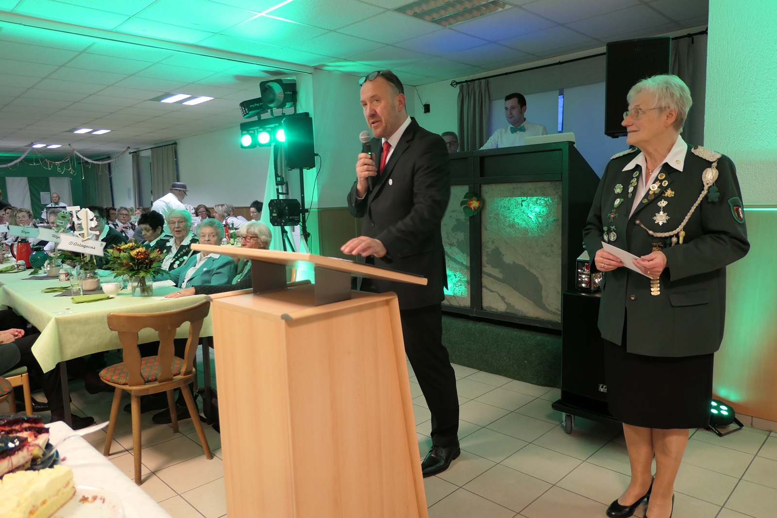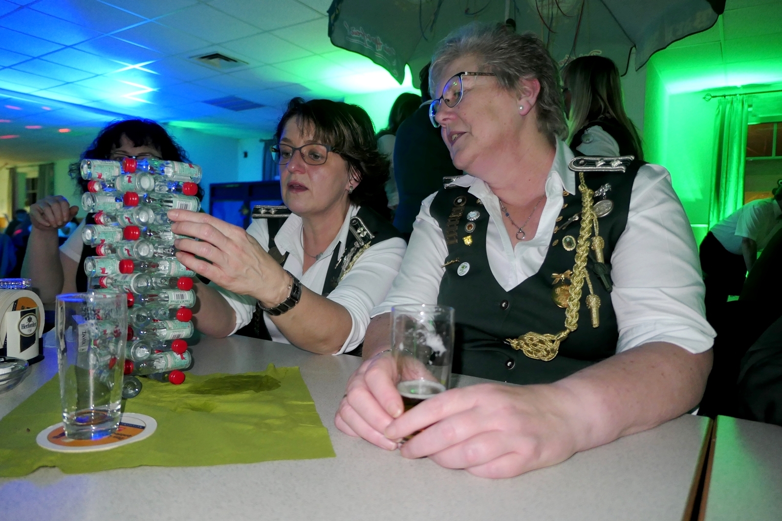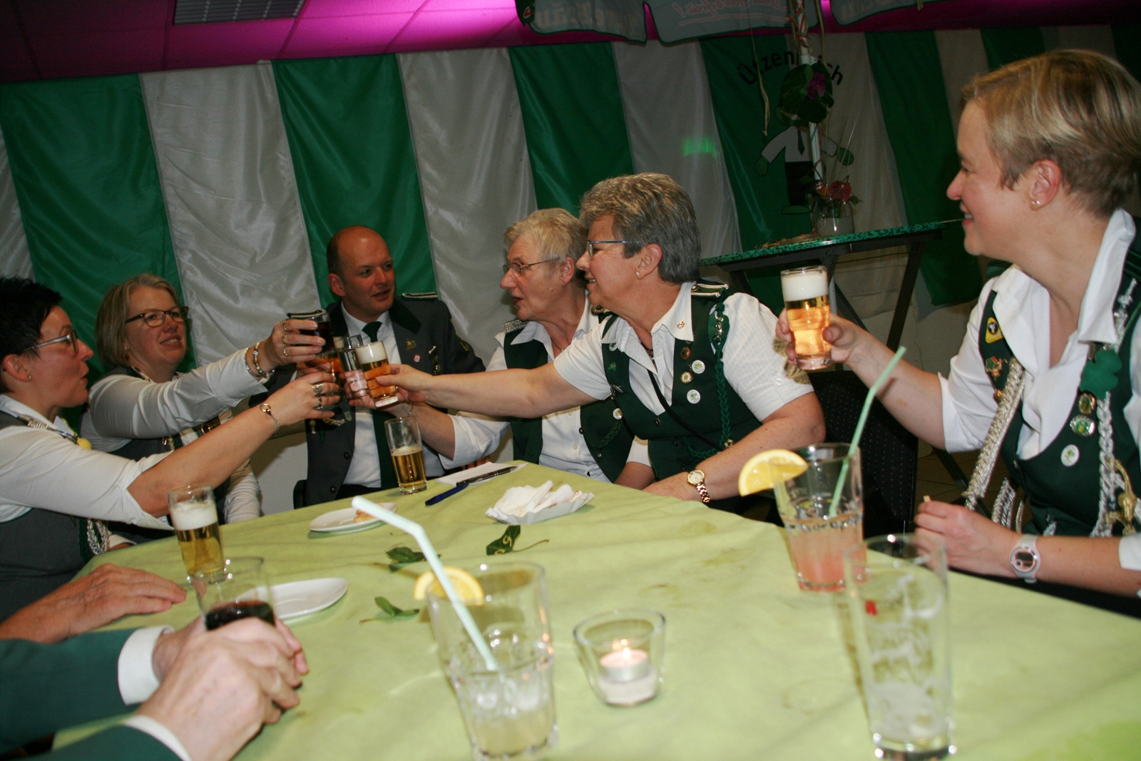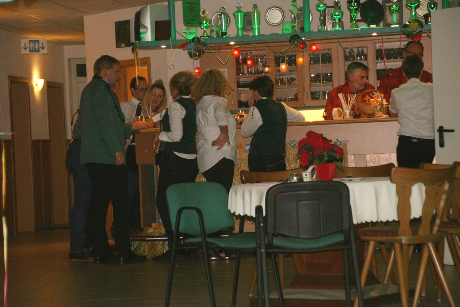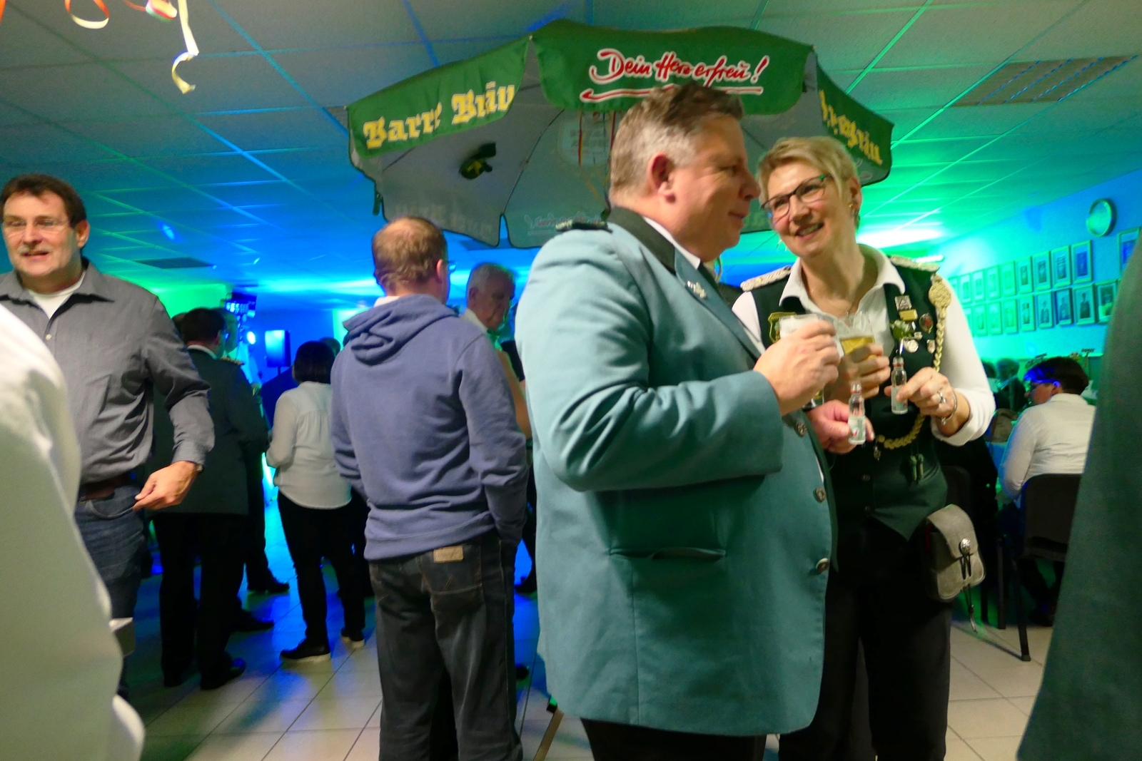 Die „Arbeit“ von DJ Axel Gössele begann mit dem Ehrentanz, die Tanzfläche ganz in grün getaucht, war so der Treffpunkt vieler tanzfreudiger Damen bis weit nach Mitternacht. Dabei erschienen dann auch vier Herren, angezogen mit Bademantel und Sonnenbrille und brachten den Damen Sahne, zu den Klängen des Liedes von Udo Jürgens „Aber bitte mit Sahne!“ auch die „Reise nach Jerusalem“ oder „Limborock“ begeisterte.