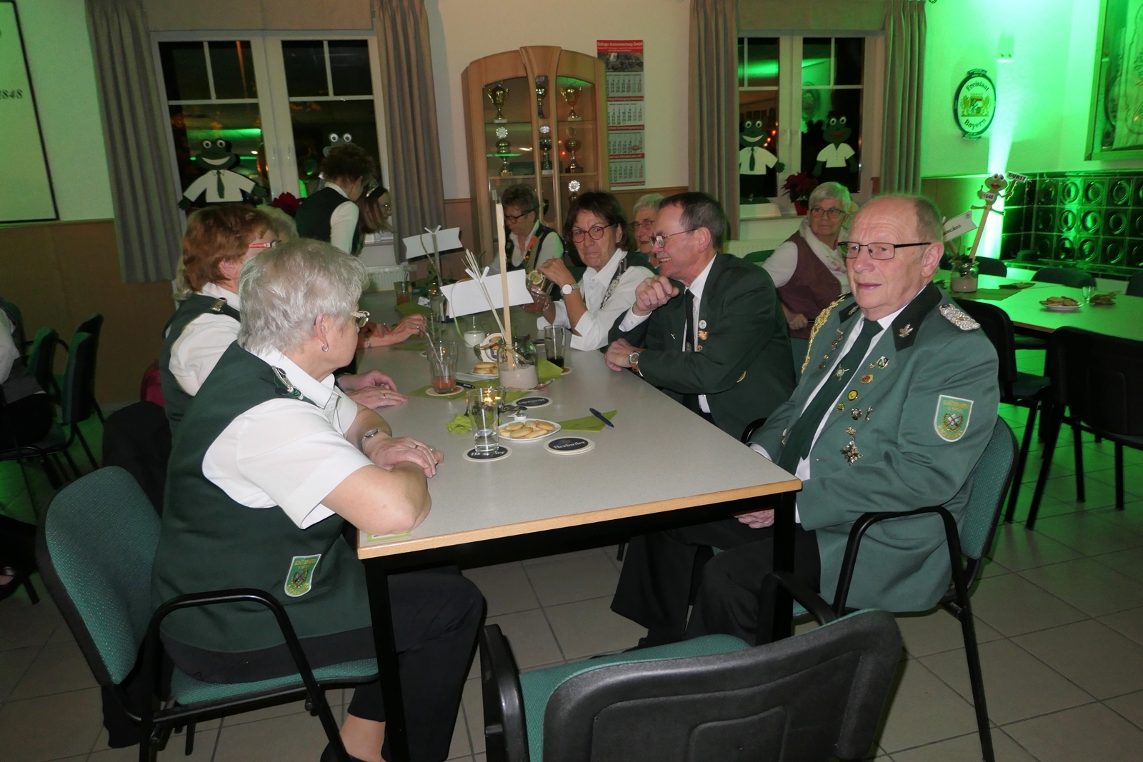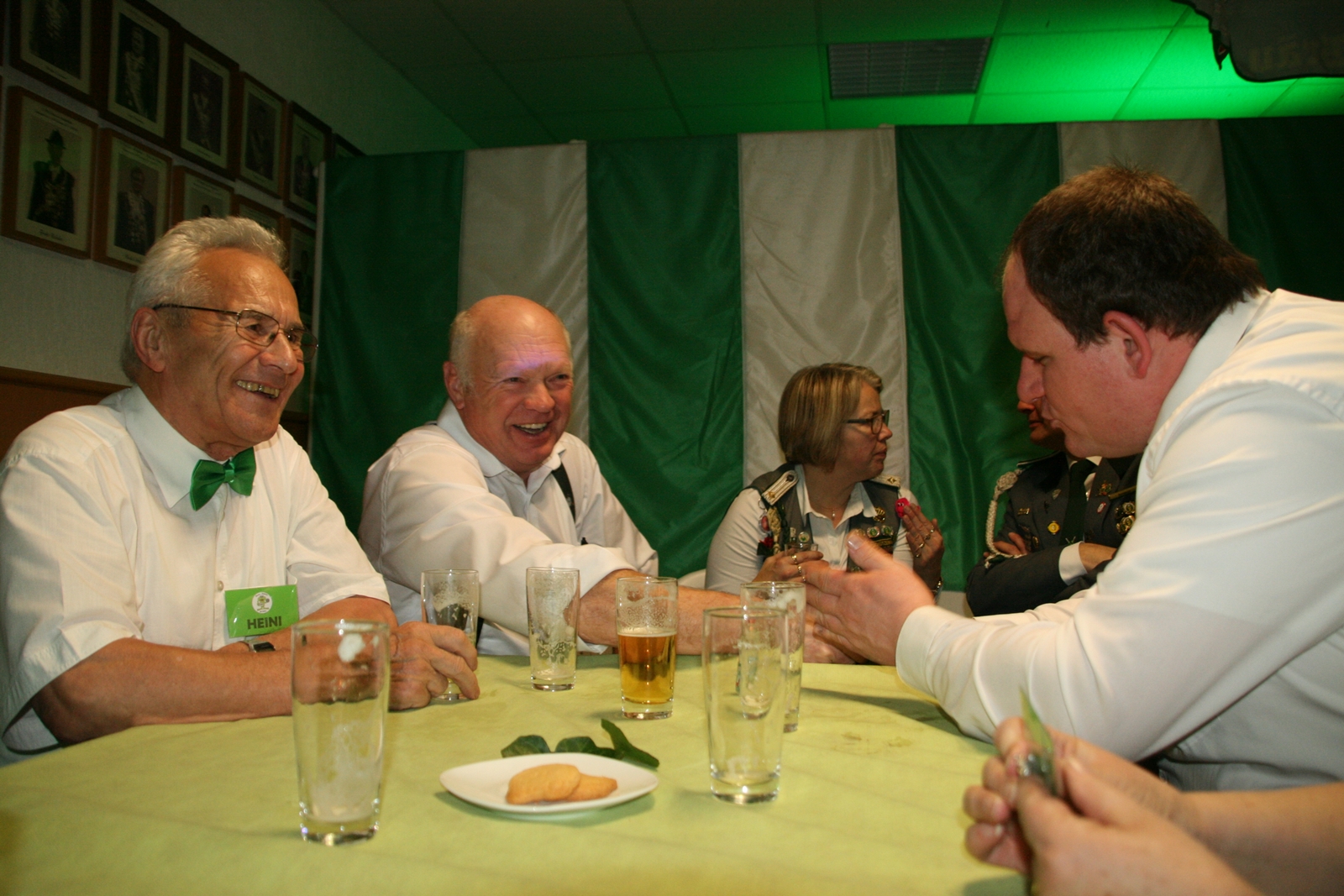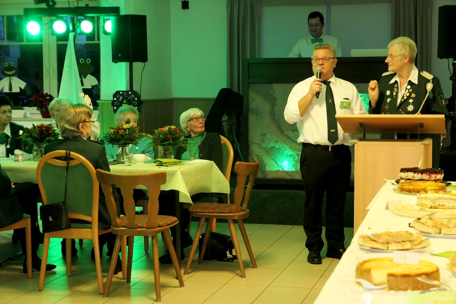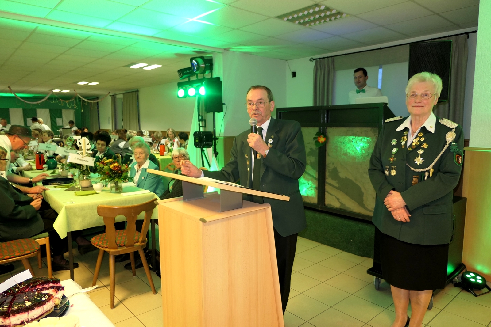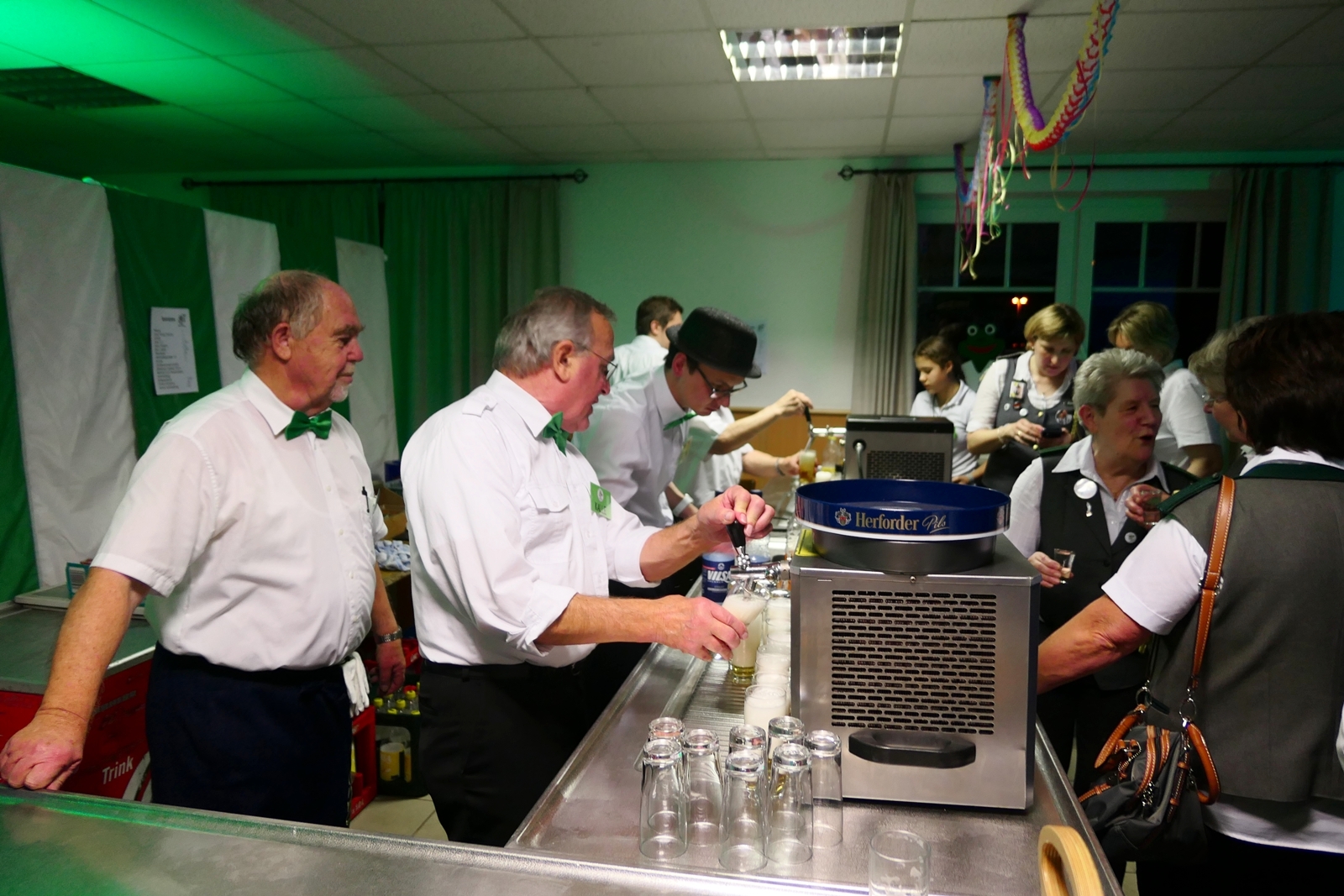 Die „Arbeit“ von DJ Axel Gössele begann mit dem Ehrentanz, die Tanzfläche ganz in grün getaucht, war so der Treffpunkt vieler tanzfreudiger Damen bis weit nach Mitternacht. Dabei erschienen dann auch vier Herren, angezogen mit Bademantel und Sonnenbrille und brachten den Damen Sahne, zu den Klängen des Liedes von Udo Jürgens „Aber bitte mit Sahne!“ auch die „Reise nach Jerusalem“ oder „Limborock“ begeisterte.