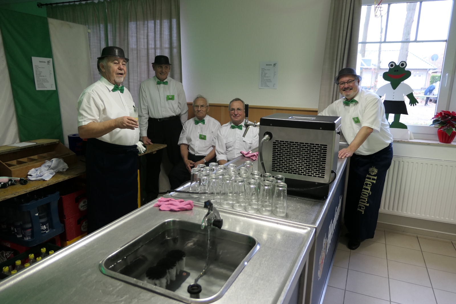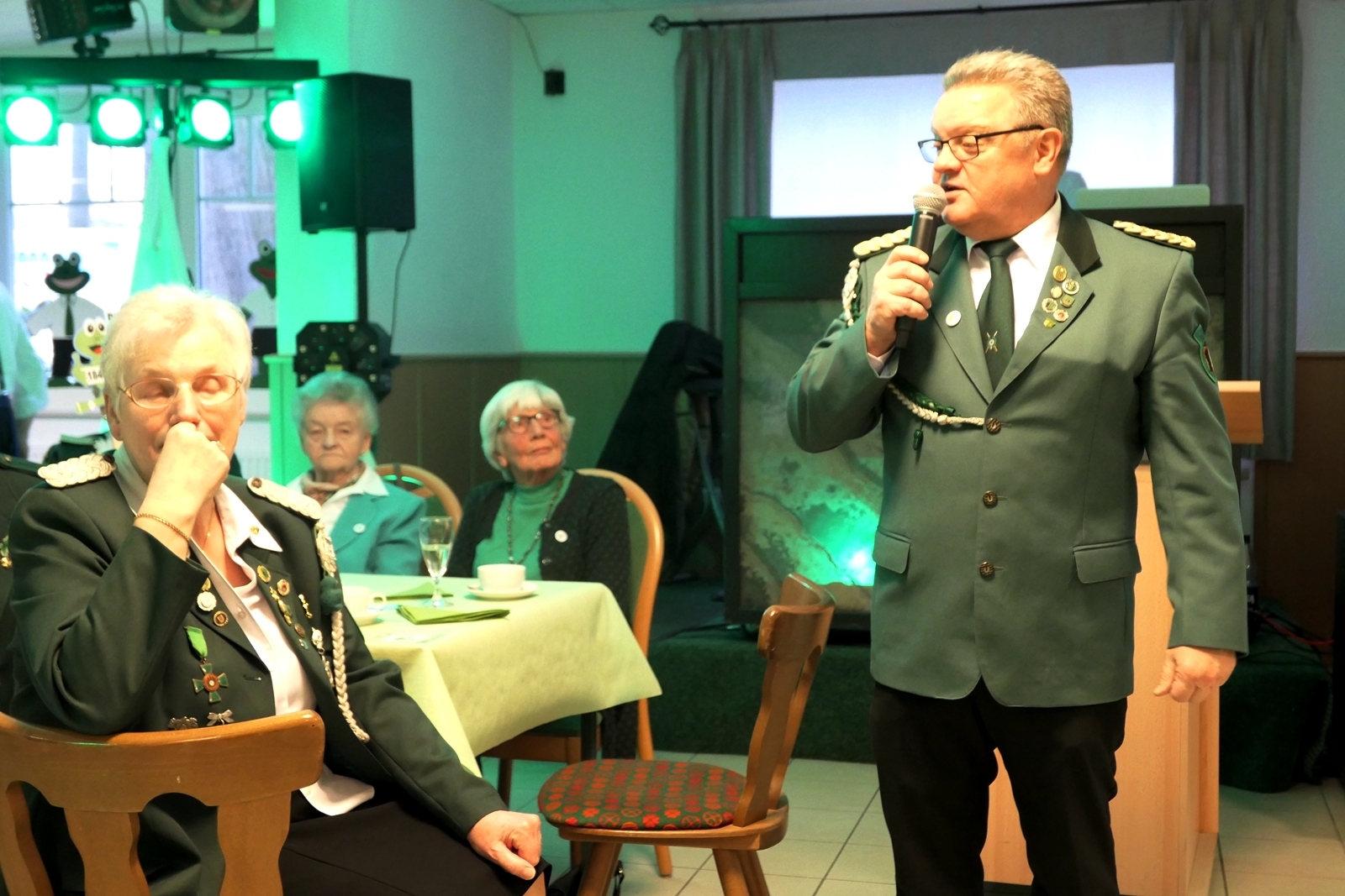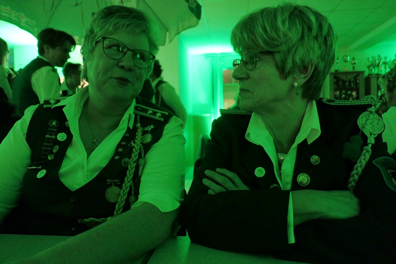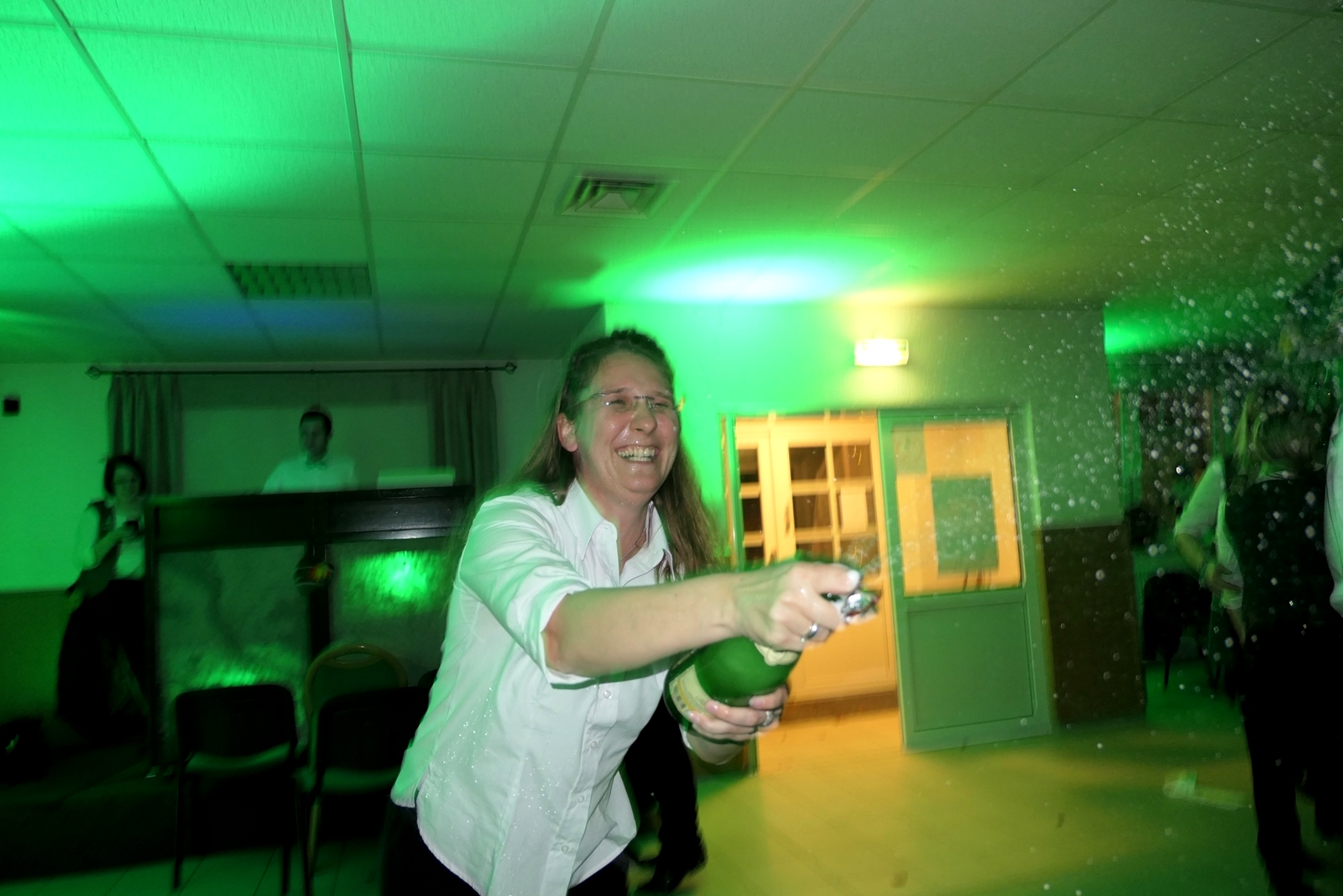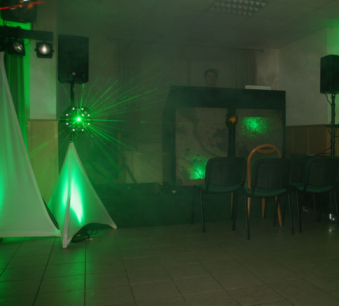 Die „Arbeit“ von DJ Axel Gössele begann mit dem Ehrentanz, die Tanzfläche ganz in grün getaucht, war so der Treffpunkt vieler tanzfreudiger Damen bis weit nach Mitternacht. Dabei erschienen dann auch vier Herren, angezogen mit Bademantel und Sonnenbrille und brachten den Damen Sahne, zu den Klängen des Liedes von Udo Jürgens „Aber bitte mit Sahne!“ auch die „Reise nach Jerusalem“ oder „Limborock“ begeisterte.
