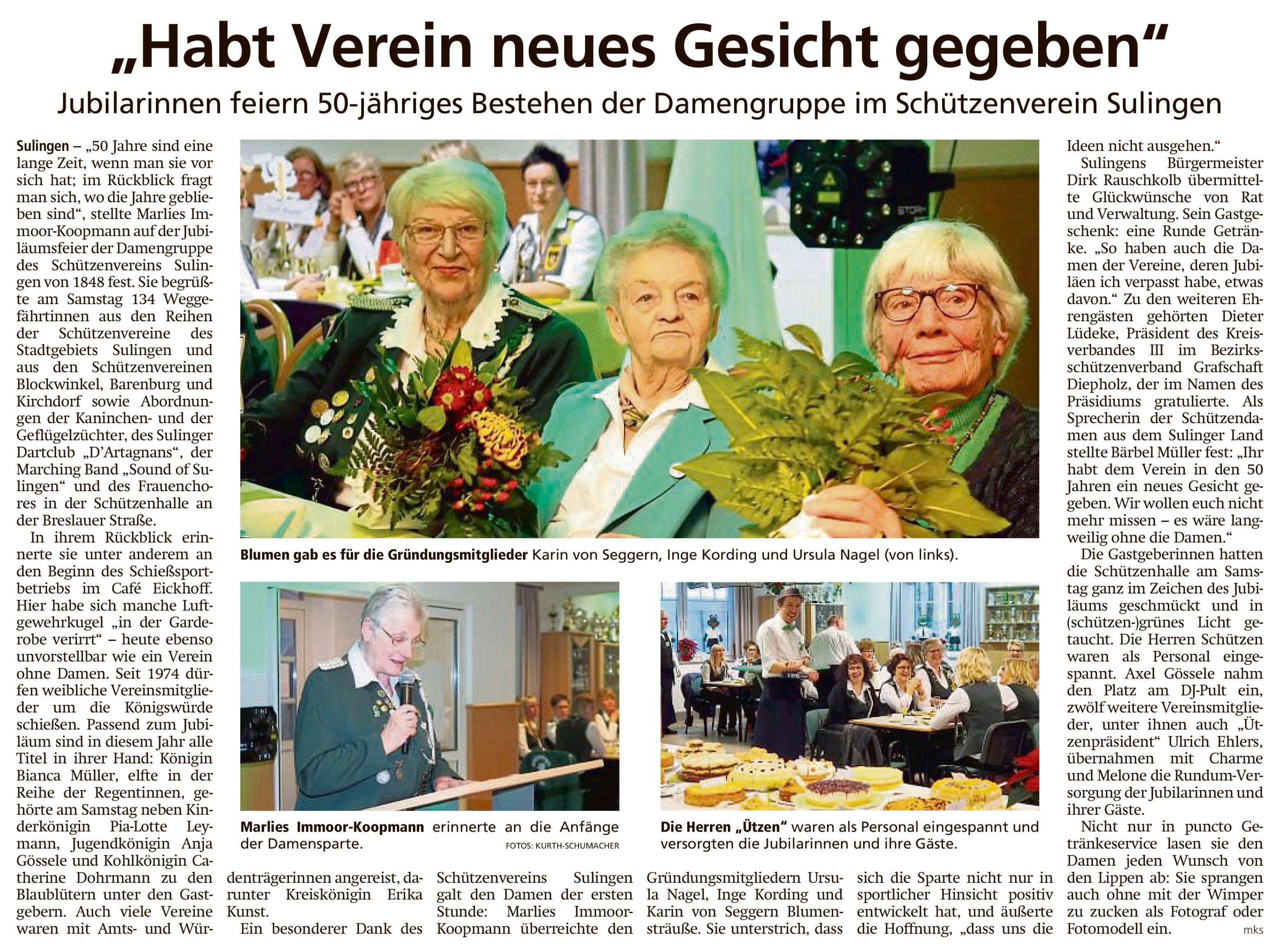 Dirk Rauschkolb, Bürgermeister der Stadt Sulingen, übermittelte die Glückwünsche des Rates und Verwaltung. Eine Runde Getränke gab es für alle von ihm, da er die Jubiläen der Damen, auch der von Stadt-Herelse, verpasst habe, so hätten alle etwas davon. Dieter Lüdeke, Präsident des Kreisverbandes III im Bezirks-Schützenverband Diepholz gratulierte im Namen des Präsidiums. Gründungsmitglied Karin von Seggern freute sich und dankte allen, auch im Namen von Inge Kording und Ursula Nagel, über so viel Zuspruch. Bärbel Müller von der Schützengesellschaft, sprach für die Schützendamen des Sulinger Landes und brachte es auf den Punkt: „Ihr habt dem Verein in den 50 Jahren ein neues Gesicht gegeben, wir wollen euch nicht mehr missen!“ „Es wäre langweilig ohne die Damen!“