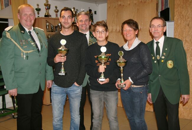Die drei Kreisverbands III Könige - Jugend: Nico Gössele, Kinder: Vincent Langnau, Erwachsene: Annerose Stubbemann, mit von rechts: Dieter Lüdeke, Udo Bolte und Hartmut Osterloh.
