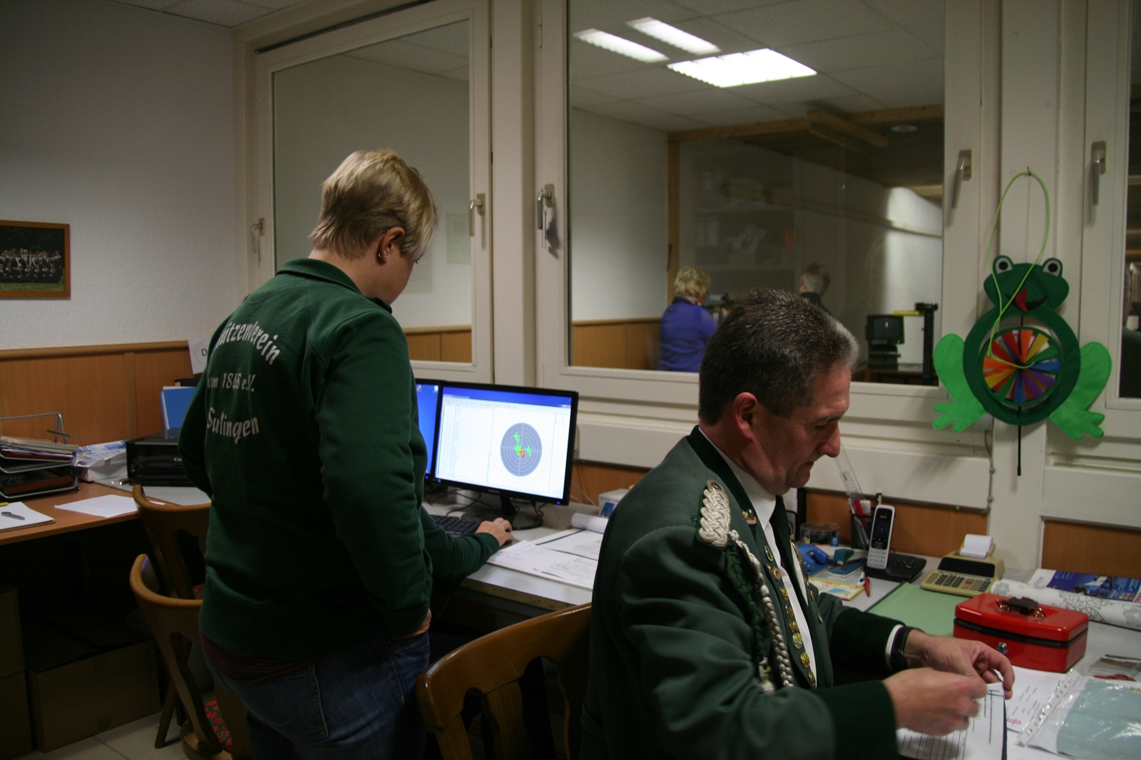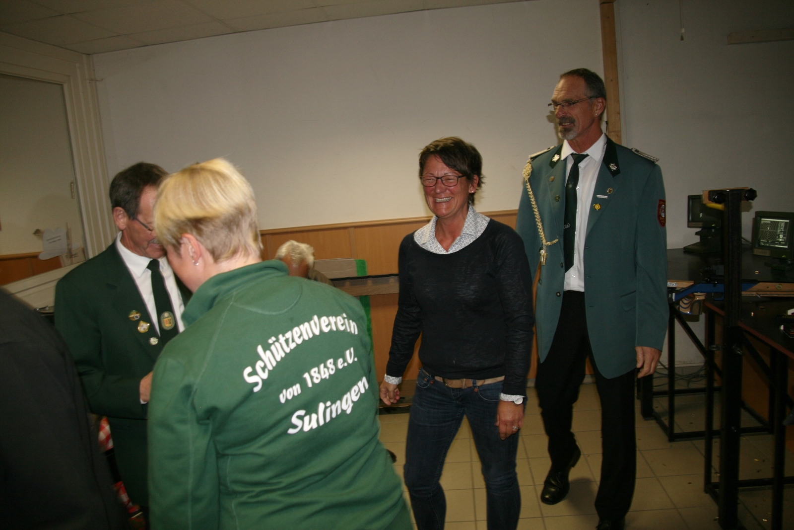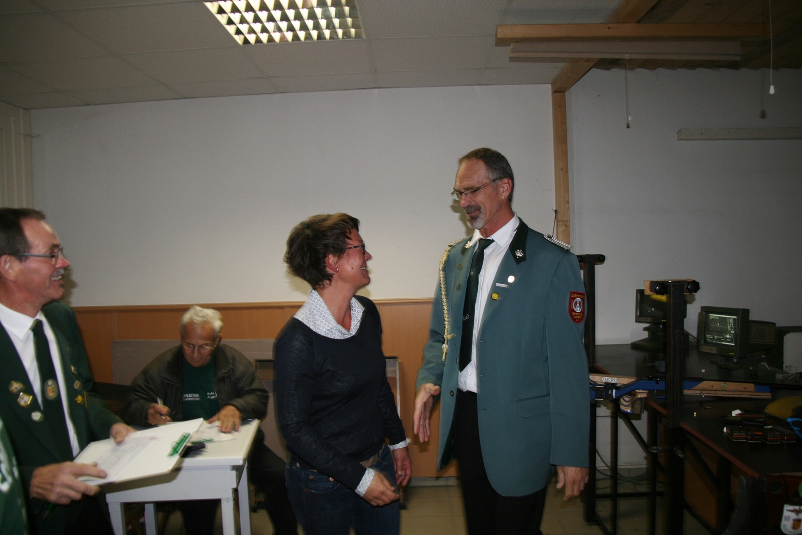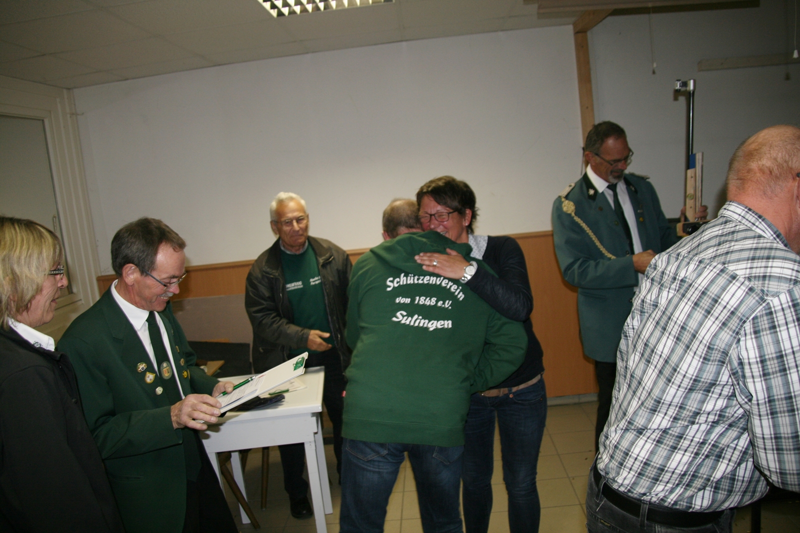 Er hob hervor, dass es solch einen spannenden Wettkampf um den Königstitel der Erwachsenen vom Kreisverband III bisher wohl noch nicht gegeben habe, (dazu dann noch nach dem Sieg die pure Freude bei Annerose): gleich 3 Vereinskönige hatten die gleiche Ringzahl von 95 erzielt! Im Stechen siegte dann Annerose Stubbemann vom SV Ehrenburg mit den Stech-Serien 29-30-29-28. Karl-Heinz Logemann vom SV Schwaförden hatte diese Serien: 29-30-29-27. Jens Müller vom SV Sulingen mußte mit den Serien 29-28 schon vorzeitig das Feld "räumen", war aber trotzdem froh solch ein Stechen mitgemacht zu haben. Sandra Klinge von der SG von 1896 Sulingen war mit 92 Ringen dabei.