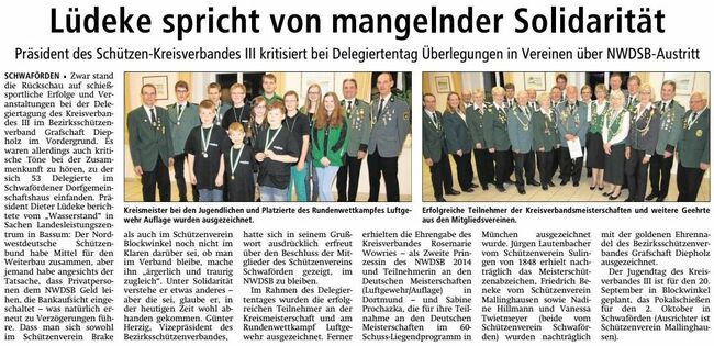 KV-Präsident Lüdeke erinnerte in seinem Bericht noch einmal an das 50 jährige Bestehen des Bezirks-Schützenverbandes Diepholz im April 2014, an die Übergaben der Ehrenbriefe des NWDSB an die Schützen Arthur Mattheis vom SV Brake und Heinrich Vallan vom SV von 1848 Sulingen. Bei den Vergleichsschießen der Damen und der Kreisverbandsvorstände, waren jeweils zweite Plätze eingenommen worden. Vom Landesdelegiertentag in Rehden berichtete er von einer sachlich geführten Delegiertenversammlung, dort wurde Jonny Otten als NWDSB-Präsident wiedergewählt. Die abendliche Veranstaltung war Klasse, aus unserem Kreisverband waren leider nur die Vereine Blockwinkel und Sulingen von 1848 vertreten. Vom LLZ Bassum konnte er berichten, dass Geld zum Weiterbau vorhanden ist, aber irgendjemand etwas dagegen hat, das Privatpersonen dem NWDSB Geld leihen, dazu wurde die Bankenaufsicht eingeschaltet und bis das geklärt ist, vergeht natürlich wieder Zeit. NSSV- und SBN-Präsident Axel Rott stellt zu dem 51000 Euro zur Verfügung. Das sich der SV Brake und SV Blockwinkel noch nicht im Klaren sind im Verband zu bleiben, mache ihn ärgerlich und traurig zugleich, nur so viel: Unter Solidarität verstehe er etwas anderes!-aber das ist – glaube ich – in der heutigen Zeit wohl abhanden gekommen.