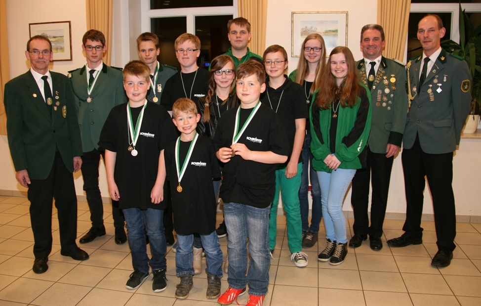 Die anwesenden jugendlichen Kreismeister und Platzierten des Rundenwettkampfes Luftgewehr Auflage, mit Präsident Dieter Lüdeke (links), Sportleiter Udo Bolte und Jugendsportleiter Dominic Lüdeke (rechts)