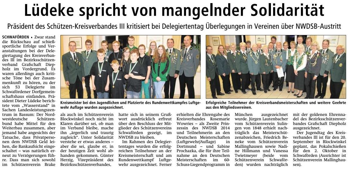 Diese Termine wurden bekanntgegeben: Pokalschießen des KV III am 2. Oktober 2015 in Schwaförden - Ausrichter SV Mallinghausen. „Tag des Sports“ am 19. Juli 2015 in Rehden. KV III-Jugendtag: 20. September 2015 in Blockwinkel. Bezirkskönigsball findet am 17. Oktober in Varrel / Hartje statt. Bezirksdelegiertentag 2016 19. März in Wetschen – Ausrichter KV I. KV III-Delegiertentag 2016 am 22. April im DGH-Schwaförden – Ausrichter SV Schwaförden.