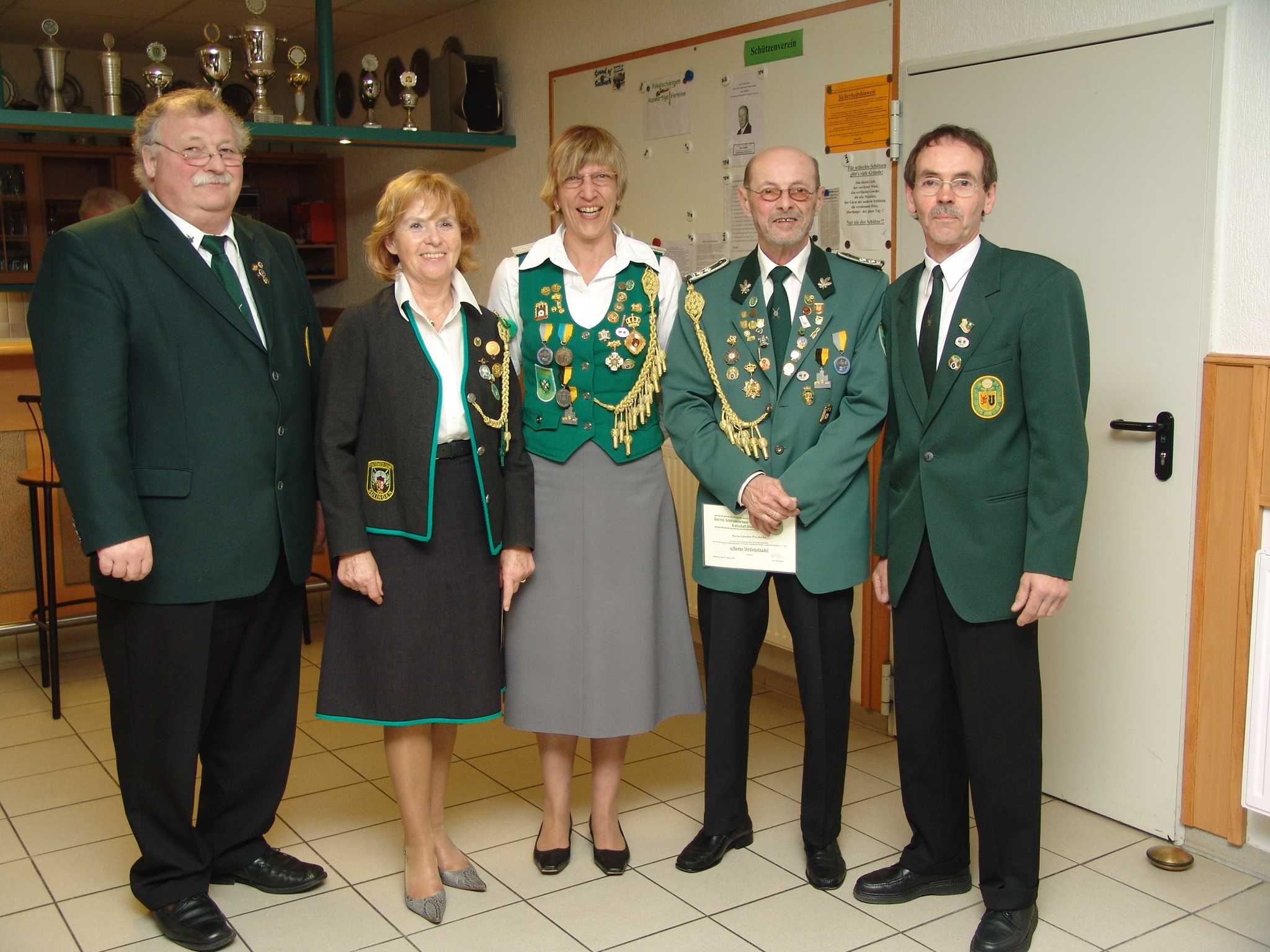 Bezirkspräsident Scharrelmann ehrte (v.l.) Gerda Borstelmann, Sabine und Günther Prochazka. Dieter Lüdecke gratulierte