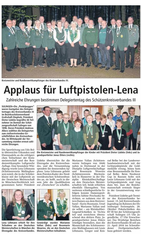 Bei den Bezirk-Kreisverbandschießen belegten wir Platz drei und beim Damenvergleichsschießen durften wir die „Rote Laterne“ behalten. An den Deutschen Meisterschaften haben Marianne Vallan SV von 1848 Sulingen und Helmut Riedemann, SV Blockwinkel (Luftgewehr Auflage in Dortmund).Lena Löhmann vom SV Mallinghausen nahm in München-Hochbrück mit der Luftpistole Schülerklasse teil. Ein tolles Fest war auch der 65. Landesschützentag in Barnstorf. Beim LLZ Bassum laufen Ausschreibungen zur Fertigstellung der Kleinkaliberanlagen. Er bedankte sich bei seinen Vorstandskollegen für die gute Zusammenarbeit.
