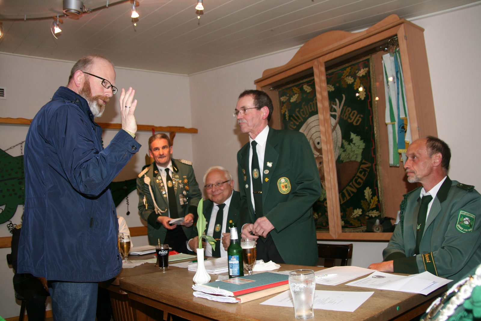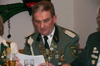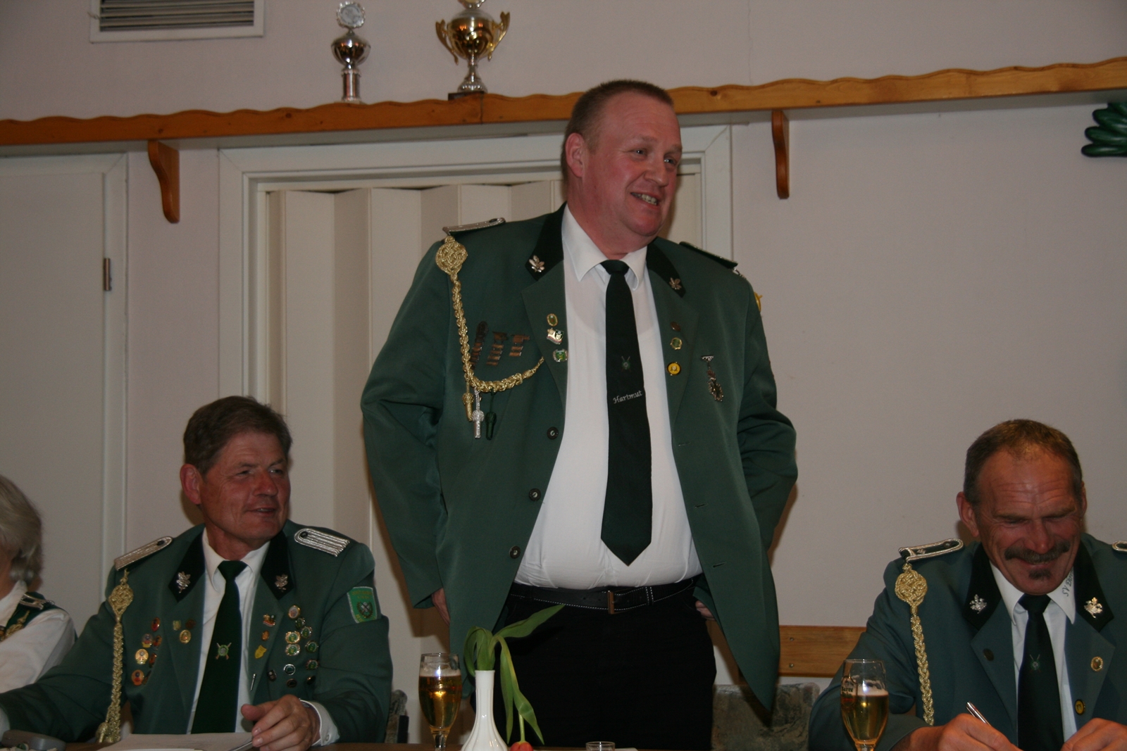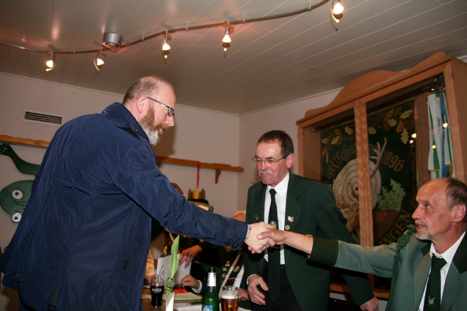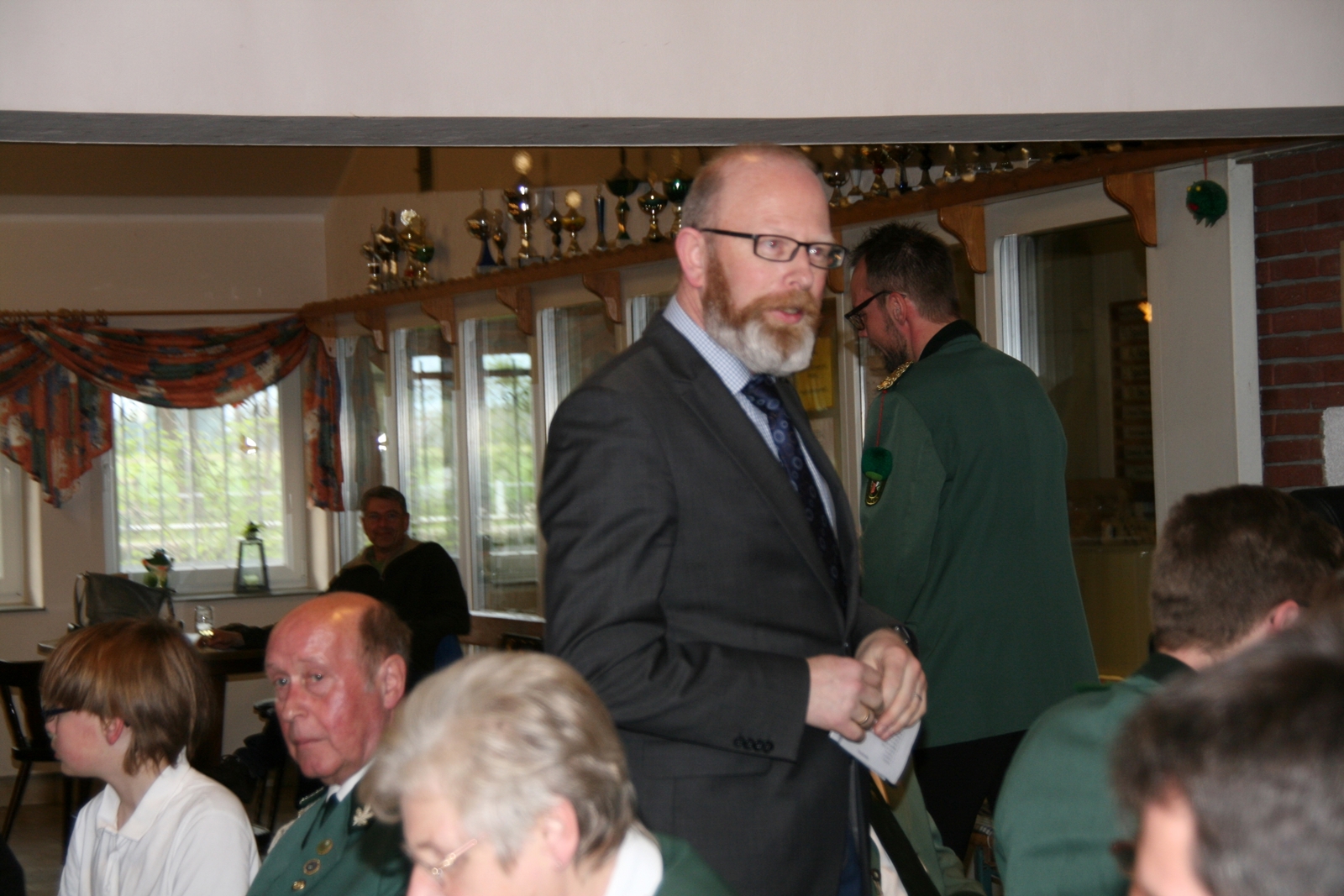 Bezirksvizepräsident Günter Herzig überbrachte die Grüße des Bezirksvorstandes, insbesondere von Präsident Karl-Friedrich Scharrelmann, der am heutigen Abend der Delegiertentagung des Kreisverbandes I in Hemsloh beiwohnt. Herzig ging auf den am 8. April stattgefundenen Landesschützentag ein, deren Ausrichtung der Bezirk Diepholz kurzfristig übernommen hatte, da Bremen nicht im Stande war, diesen auszurichten. "Wer dabei gewesen ist, kann sicher bestätigen, dass auch in einem „Schützenfestzelt“, wie es im Vorfeld abfällig mal so durchklang, wir doch einen sehr schönen Rahmen geschaffen hatten". Die Resonanz war sehr positiv von den teilnehmenden Vereinen aus dem ganzen Bereich des Nordwestdeutschen Schützenbundes (NWDSB) und auch vom Vorstand des NWDSB. Herzig bedauerte, er habe sich von den Mitgliedsvereinen des KV III eine größere Beteiligung gewünscht. Die Vereinsvorstände bat er an die Bezirksehrungen zu denken, sie rechtzeitig bis zum 30. September an Präsident Lüdeke zu senden, dabei vorher doch nochmals die Ehrungsordnungen durchzulesen. Der Versammlung wünschte er ein gutes Gelingen und anschließend ein paar gesellige Stunden.